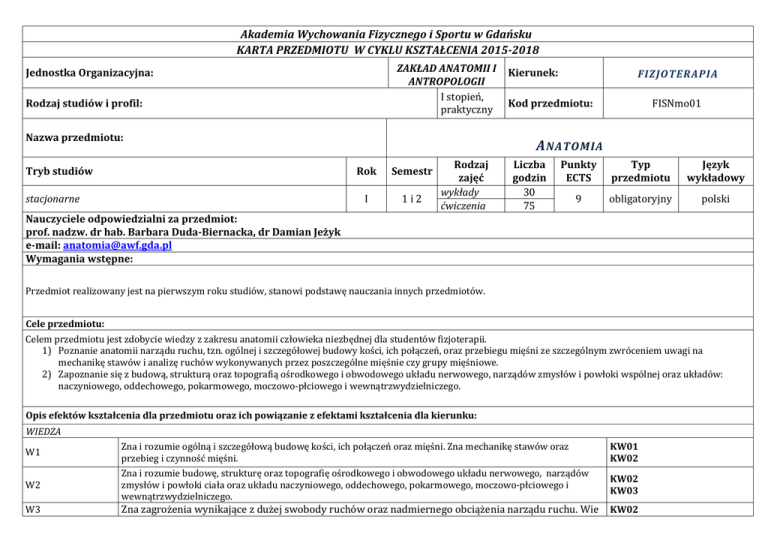 Akademia Wychowania Fizycznego i Sportu w Gdańsku KARTA PRZEDMIOTU W CYKLU KSZTAŁCENIA 2015-2018 ZAKŁAD ANATOMII I ANTROPOLOGII I stopień, praktyczny Jednostka Organizacyjna: Rodzaj studiów i profil: Nazwa przedmiotu: Tryb studiów stacjonarne Kierunek: FIZJOTERAPIA Kod przedmiotu: FISNmo01 A NATOMIA Rok Semestr I 1i2 Rodzaj zajęć wykłady ćwiczenia Liczba godzin 30 75 Punkty ECTS Typ przedmiotu Język wykładowy 9 obligatoryjny polski Nauczyciele odpowiedzialni za przedmiot: prof. nadzw. dr hab. Barbara Duda-Biernacka, dr Damian Jeżyk e-mail: [email protected] Wymagania wstępne: Przedmiot realizowany jest na pierwszym roku studiów, stanowi podstawę nauczania innych przedmiotów. Cele przedmiotu: Celem przedmiotu jest zdobycie wiedzy z zakresu anatomii człowieka niezbędnej dla studentów fizjoterapii. 1) Poznanie anatomii narządu ruchu, tzn. ogólnej i szczegółowej budowy kości, ich połączeń, oraz przebiegu mięśni ze szczególnym zwróceniem uwagi na mechanikę stawów i analizę ruchów wykonywanych przez poszczególne mięśnie czy grupy mięśniowe. 2) Zapoznanie się z budową, strukturą oraz topografią ośrodkowego i obwodowego układu nerwowego, narządów zmysłów i powłoki wspólnej oraz układów: naczyniowego, oddechowego, pokarmowego, moczowo-płciowego i wewnątrzwydzielniczego. Opis efektów kształcenia dla przedmiotu oraz ich powiązanie z efektami kształcenia dla kierunku: WIEDZA W1 W2 W3 Zna i rozumie ogólną i szczegółową budowę kości, ich połączeń oraz mięśni. Zna mechanikę stawów oraz przebieg i czynność mięśni. Zna i rozumie budowę, strukturę oraz topografię ośrodkowego i obwodowego układu nerwowego, narządów zmysłów i powłoki ciała oraz układu naczyniowego, oddechowego, pokarmowego, moczowo-płciowego i wewnątrzwydzielniczego. KW01 KW02 Zna zagrożenia wynikające z dużej swobody ruchów oraz nadmiernego obciążenia narządu ruchu. Wie KW02 KW02 KW03 które elementy, w którym miejscu i kiedy są szczególnie narażone na uraz. W4 UMIEJĘTNOŚCI Zna mianownictwo anatomiczne w języku polskim i łacińskim. KW02 U1 Posługuje się w praktyce mianownictwem anatomicznym. KU05 Posiada umiejętność wykorzystania znajomości budowy anatomicznej narządu ruchu, układu nerwowego i pozostałych trzew w kontekście funkcjonowania organizmu jako całości. Umie powiązać wiedzę teoretyczną z praktyczną: potrafi wskazać (na sobie, na naturalnych preparatach suchych, modelach, fantomach, planszach) najważniejsze elementy i ich składowe w obrębie narządu ruchu i pozostałych układów. KU05 U2 U3 KU05 KOMPETENCJE K1 Rozumie potrzebę uczenia się przez całe życie. K_K01 K2 Jest świadom własnych ograniczeń. K_K02 K3 Systematycznie wzbogaca wiedzę i kształtuje umiejętności, dążąc do profesjonalizmu. K_K01 Kryteria i metody oceny osiągniętych efektów kształcenia: Formy zaliczenia: W1 – W6 - kolokwium teoretyczne i praktyczne (minimum 60% wymaganej wiedzy), egzamin pisemny z pytaniami otwartymi, testowy (minimum 60% wymaganej wiedzy) U1 – U3 - kolokwium teoretyczne i praktyczne (minimum 60% wymaganej wiedzy), egzamin pisemny z pytaniami otwartymi, testowy (minimum 60% wymaganej wiedzy) K1 – K3 - kolokwium teoretyczne i praktyczne (minimum 60% wymaganej wiedzy), egzamin pisemny z pytaniami otwartymi, testowy (minimum 60% wymaganej wiedzy) Kryteria oceny osiągniętych EK: wynikowe - poniżej 60% - ocena niedostateczna, 60% - ocena dostateczna, 70% - ocena dostateczna plus, 80% - ocena dobra, 90% - ocena dobry plus, 100% - ocena bardzo dobra. Aby uzyskać zaliczenie przedmiotu na ocenę dostateczną student musi osiągnąć wszystkie wymienione w programie efekty kształcenia. Metody i formy realizacji przedmiotu: Metody realizacji przedmiotu: 1) wykład konwencjonalny z pokazem multimedialnym 2) metoda ćwiczebna w toku podającym i poszukującym Formy realizacji przedmiotu: 1) wykład – zajęcia audytoryjne 2) ćwiczenia – praca w grupach (dyskusja, praca z materiałem kostnym, ze szkieletami i modelami anatomicznymi, planszami i atlasami anatomicznymi, palpacyjne odnajdowanie wyczuwalnych struktur na żywym człowieku). Treści kształcenia: Wykłady: Wprowadzenie do anatomii. Budowa ogólna kości. Szkielet osiowy. Kości kończyny górnej. Kości kończyny dolnej. Budowa ogólna połączeń kości. Połączenia szkieletu osiowego. Połączenia kości kończyny górnej. Połączenia kości kończyny dolnej. Budowa ogólna mięśni. Mięśnie głowy i szyi. Mięśnie tułowia. Mięśnie kończyny górnej. Mięśnie kończyny dolnej. Ośrodkowy układ nerwowy. Autonomiczny układ nerwowy. Drogi nerwowe. Obwodowy układ nerwowy – nerwy czaszkowe. Obwodowy układ nerwowy – nerwy rdzeniowe. Narządy zmysłów. Układ naczyniowy. Układ wewnątrzwydzielniczy. Układ oddechowy. Układ pokarmowy. Układ moczowy. Układ płciowy. Ćwiczenia: Szkielet osiowy. Kości kończyny górnej. Kości kończyny dolnej. Połączenia szkieletu osiowego. Połączenia kości kończyny górnej. Połączenia kości kończyny dolnej. Mięśnie głowy i szyi. Mięśnie tułowia. Mięśnie kończyny górnej. Mięśnie kończyny dolnej. Ośrodkowy układ nerwowy. Autonomiczny układ nerwowy. Drogi nerwowe. Obwodowy układ nerwowy – nerwy czaszkowe. Obwodowy układ nerwowy – nerwy rdzeniowe. Narządy zmysłów. Układ naczyniowy. Układ wewnątrzwydzielniczy. Układ oddechowy. Układ pokarmowy. Układ moczowo - płciowy. Forma zaliczenia: Wykłady - I semestr - zaliczenie z oceną, II semestr - egzamin Ćwiczenia - zaliczenie z oceną Literatura: Podstawowa: 1. Bochenek A., Reicher M.: Anatomia człowieka. T. I., PZWL, W-wa, 2008. 2. Jerzemowski J., Duda B., Orkwiszewska A., Wójtowicz E.: Anatomia człowieka. Narząd ruchu. Wydawnictwo Uczelniane AWFiS, Gdańsk, 2010. 3. Ignasiak Z.: Anatomia układów wewnętrznych i układu nerwowego. Urban&Partner, Wrocław, 2014. 4. Ciszek B., Maciejewski R. (red).. Ana