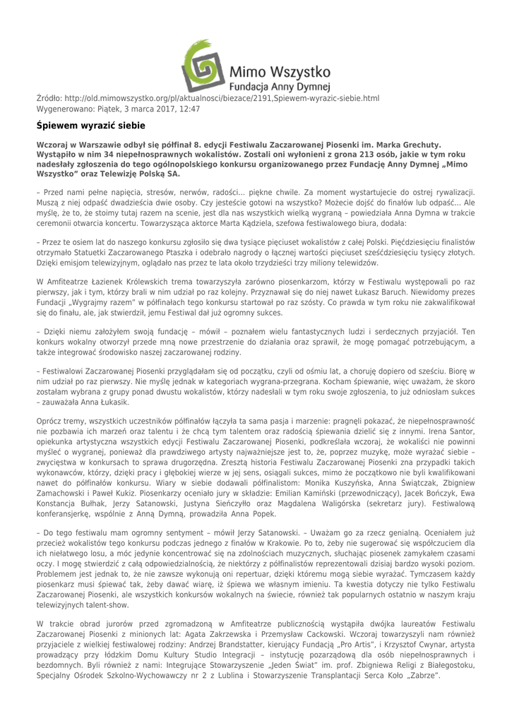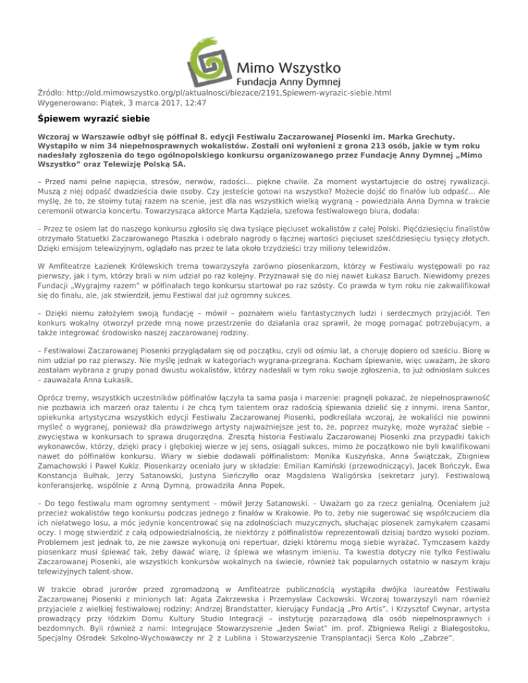 Źródło: http://old.mimowszystko.org/pl/aktualnosci/biezace/2191,Spiewem-wyrazic-siebie.html Wygenerowano: Piątek, 3 marca 2017, 12:47 Śpiewem wyrazić siebie Wczoraj w Warszawie odbył się półfinał 8. edycji Festiwalu Zaczarowanej Piosenki im. Marka Grechuty. Wystąpiło w nim 34 niepełnosprawnych wokalistów. Zostali oni wyłonieni z grona 213 osób, jakie w tym roku nadesłały zgłoszenia do tego ogólnopolskiego konkursu organizowanego przez Fundację Anny Dymnej „Mimo Wszystko” oraz Telewizję Polską SA. – Przed nami pełne napięcia, stresów, nerwów, radości… piękne chwile. Za moment wystartujecie do ostrej rywalizacji. Muszą z niej odpaść dwadzieścia dwie osoby. Czy jesteście gotowi na wszystko? Możecie dojść do finałów lub odpaść… Ale myślę, że to, że stoimy tutaj razem na scenie, jest dla nas wszystkich wielką wygraną – powiedziała Anna Dymna w trakcie ceremonii otwarcia koncertu. Towarzysząca aktorce Marta Kądziela, szefowa festiwalowego biura, dodała: – Przez te osiem lat do naszego konkursu zgłosiło się dwa tysiące pięciuset wokalistów z całej Polski. Pięćdziesięciu finalistów otrzymało Statuetki Zaczarowanego Ptaszka i odebrało nagrody o łącznej wartości pięciuset sześćdziesięciu tysięcy złotych. Dzięki emisjom telewizyjnym, oglądało nas przez te lata około trzydzieści trzy miliony telewidzów. W Amfiteatrze Łazienek Królewskich trema towarzyszyła zarówno piosenkarzom, którzy w Festiwalu występowali po raz pierwszy, jak i tym, którzy brali w nim udział po raz kolejny. Przyznawał się do niej nawet Łukasz Baruch. Niewidomy prezes Fundacji „Wygrajmy razem” w półfinałach tego konkursu startował po raz szósty. Co prawda w tym roku nie zakwalifikował się do finału, ale, jak stwierdził, jemu Festiwal dał już ogromny sukces. – Dzięki niemu założyłem swoją fundację – mówił – poznałem wielu fantastycznych ludzi i serdecznych przyjaciół. Ten konkurs wokalny otworzył przede mną nowe przestrzenie do działania oraz sprawił, że mogę pomagać potrzebującym, a także integrować środowisko naszej zaczarowanej rodziny. – Festiwalowi Zaczarowanej Piosenki przyglądałam się od początku, czyli od ośmiu lat, a choruję dopiero od sześciu. Biorę w nim udział po raz pierwszy. Nie myślę jednak w kategoriach wygrana-przegrana. Kocham śpiewanie, więc uważam, że skoro zostałam wybrana z grupy ponad dwustu wokalistów, którzy nadesłali w tym roku swoje zgłoszenia, to już odniosłam sukces – zauważała Anna Łukasik. Oprócz tremy, wszystkich uczestników półfinałów łączyła ta sama pasja i marzenie: pragnęli pokazać, że niepełnosprawność nie pozbawia ich marzeń oraz talentu i że chcą tym talentem oraz radością śpiewania dzielić się z innymi. Irena Santor, opiekunka artystyczna wszystkich edycji Festiwalu Zaczarowanej Piosenki, podkreślała wczoraj, że wokaliści nie powinni myśleć o wygranej, ponieważ dla prawdziwego artysty najważniejsze jest to, że, poprzez muzykę, może wyrażać siebie – zwycięstwa w konkursach to sprawa drugorzędna. Zresztą historia Festiwalu Zaczarowanej Piosenki zna przypadki takich wykonawców, którzy, dzięki pracy i głębokiej wierze w jej sens, osiągali sukces, mimo że początkowo nie byli kwalifikowani nawet do półfinałów konkursu. Wiary w siebie dodawali półfinalistom: Monika Kuszyńska, Anna Świątczak, Zbigniew Zamachowski i Paweł Kukiz. Piosenkarzy oceniało jury w składzie: Emilian Kamiński (przewodniczący), Jacek Bończyk, Ewa Konstancja Bułhak, Jerzy Satanowski, Justyna Sieńczyłło oraz Magdalena Waligórska (sekretarz jury). Festiwalową konferansjerkę, wspólnie z Anną Dymną, prowadziła Anna Popek. – Do tego festiwalu mam ogromny sentyment – mówił Jerzy Satanowski. – Uważam go za rzecz genialną. Oceniałem już przecież wokalistów tego konkursu podczas jednego z finałów w Krakowie. Po to, żeby nie sugerować się współczuciem dla ich niełatwego losu, a móc jedynie koncentrować się na zdolnościach muzycznych, słuchając piosenek zamykałem czasami oczy. I mogę stwierdzić z całą odpowiedzialnością, że niektórzy z półfinalistów reprezentowali dzisiaj bardzo wysoki poziom. Problemem jest jednak to, że nie zawsze wykonują oni repertuar, dzięki któremu mogą siebie wyrażać. Tymczasem każdy piosenkarz musi śpiewać tak, żeby dawać wiarę, iż śpiewa we własnym imieniu. Ta kwestia dotyczy nie tylko Festiwalu Zaczarowanej Piosenki, ale wszystkich konkursów wokalnych na świecie, również tak popularnych ostatnio w naszym kraju telewizyjnych talent-show. W trakcie obrad jurorów przed zgromadzoną w Amfiteatrze publicznością wystąpiła dwójka laureatów Festiwalu Zaczarowanej Piosenki z minionych lat: Agata Zakrzewska i Przemysław Cackowski. Wczoraj towarzyszyli nam również przyjaciele z wielkiej festiwalowej rodziny: Andrzej Brandstatter, kierujący Fundacją „Pro Artis”, i Krzysztof Cwynar, artysta prowadzący przy łódzkim Domu Kultury Studio Integracji – instytucję pozarządową dla osób niepełnosprawnych i bezdomnych. Byli również z nami: Integrujące Stowarzyszenie „Jeden Świat” im. prof. Zbigniewa Religi z Białegostoku, Specjalny Ośrodek Szkolno-Wychowawczy nr 2 z Lublina i Stowarzyszenie Transplantacji Serca Koło „Zabrze”. – Jestem tutaj, bo Festiwal Zaczarowanej Piosenki to ładunek czegoś ogromnie dobrego, ciepłego i prawdziwego, bez wielkich kreacji i taniego blichtru – mówił dziennikarzom Paweł Kukiz, laureat Medalu Świętego Brata Alberta, który z Festiwalem związany jest od 2006 roku. Do finału 8. Festiwalu Zaczarowanej Piosenki im. Marka Grechuty zakwalifikowali się: kategoria dzieci: Radosław Graczyk, Alicja Grzybicka, Magdalena Krzemińska, Patrycja Nocuń, Wiktoria Smuga, Roland Świstek kategoria dorosłych: Aleksandra Gudacz, Klaudia Borczyk, Anna Rossa, Alicja