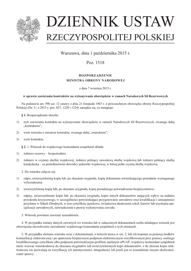 DZIENNIK USTAW RZECZYPOSPOLITEJ POLSKIEJ Warszawa, dnia 1 października 2015 r. Poz. 1518 ROZPORZĄDZENIE MINISTRA OBRONY NARODOWEJ z dnia 7 września 2015 r. w sprawie zawierania kontraktów na wykonywanie obowiązków w ramach Narodowych Sił Rezerwowych Na podstawie art. 59b ust. 12 ustawy z dnia 21 listopada 1967 r. o powszechnym obowiązku obrony Rzeczypospolitej Polskiej (Dz. U. z 2015 r. poz. 827, 1220 i 1224) zarządza się, co następuje: § 1. Rozporządzenie określa: 1) tryb zawierania kontraktu na wykonywanie obowiązków w ramach Narodowych Sił Rezerwowych, zwanego dalej „kontraktem”; 2) wzór wniosku o zawarcie kontraktu, zwanego dalej „wnioskiem”; 3) wzór kontraktu. § 2. 1. Wniosek do wojskowego komendanta uzupełnień składa: 1) żołnierz rezerwy – bezpośrednio; 2) żołnierz w czynnej służbie wojskowej, żołnierz pełniący zawodową służbę wojskową lub żołnierz pełniący służbę kandydacką – za pośrednictwem dowódcy jednostki wojskowej, w której pełni czynną służbę wojskową. 2. Do wniosku załącza się: 1) odpis, uwierzytelnioną kopię lub, po okazaniu oryginału, kopię dokumentu stwierdzającego posiadanie wymaganego wykształcenia; 2) uwierzytelnioną kopię lub, po okazaniu oryginału, kopię posiadanego poświadczenia bezpieczeństwa; 3) odpisy, uwierzytelnione kopie lub, po okazaniu oryginału, kopie innych dokumentów mających wpływ na nadanie przydziału kryzysowego, w szczególności potwierdzające przygotowanie zawodowe oraz kwalifikacje i umiejętności przydatne w Siłach Zbrojnych, w tym certyfikaty językowe, świadectwa ukończenia szkół, kursów lub uzyskania specjalizacji zawodowych, zaświadczenia o prawie wykonywania zawodu. 3. Wniosek powinien zawierać uzasadnienie. 4. W przypadku zmiany danych zawartych we wniosku lub w załączonych dokumentach osoba składająca wniosek jest obowiązana niezwłocznie zawiadomić wojskowego komendanta uzupełnień o tych zmianach. 5. W przypadku złożenia wniosku wraz z dokumentami, o których mowa w ust. 2, lub ich kopiami za pomocą środków komunikacji elektronicznej i po opatrzeniu bezpiecznym podpisem elektronicznym weryfikowanym przy pomocy ważnego kwalifikowanego certyfikatu albo podpisem potwierdzonym profilem zaufanym ePUAP, wojskowy komendant uzupełnień może wezwać wnioskodawcę do okazania oryginałów lub uwierzytelnionych kopii dokumentów, o ile złożone kopie elektroniczne nie pozwalają na weryfikację ich autentyczności, integralności lub jeżeli jest to uzasadnione innymi okolicznościami sprawy. Dziennik Ustaw –2– Poz. 1518 6. W przypadku złożenia kopii wniosku za pomocą środków komunikacji elektronicznej, żołnierz rezerwy albo żołnierz w czynnej służbie wojskowej dołącza do niej dokumenty, o których mowa w ust. 2, lub ich kopie. Wojskowy komendant uzupełnień wzywa do okazania oryginałów lub uwierzytelnionych kopii wniosku i załączonych kopii dokumentów. 7. Wzór wniosku o zawarcie kontraktu jest określony w załączniku nr 1 do rozporządzenia. § 3. 1. Wojskowy komendant uzupełnień po otrzymaniu wniosku żołnierza rezerwy: 1) sprawdza, czy istnieje wolne stanowisko służbowe, na które może być nadany przydział kryzysowy; 2) umożliwia mu zapoznanie się z przepisami normującymi pełnienie służby wojskowej w ramach Narodowych Sił Rezerwowych; 3) sprawdza, czy są spełnione przez niego warunki umożliwiające zawarcie kontraktu, o których mowa w art. 59b ust. 6 pkt 1–4 i 6 oraz ust. 8 ustawy z dnia 21 listopada 1967 r. o powszechnym obowiązku obrony Rzeczypospolitej Polskiej, zwanej dalej „ustawą”; 4) kieruje go, w razie potrzeby, do właściwej wojskowej komisji lekarskiej w celu ustalenia zdolności do pełnienia czynnej służby wojskowej, w tym pełnionej poza granicami państwa, oraz do wojskowej pracowni psychologicznej w celu ustalenia braku przeciwwskazań do pełnienia tej służby; 5) wydaje mu, w razie potrzeby, ankietę bezpieczeństwa osobowego i poleca przeprowadzenie zwykłego postępowania sprawdzającego albo występuje o przeprowadzenie przez Służbę Kontrwywiadu Wojskowego poszerzonego postępowania sprawdzającego; 6) po zakończeniu czynności, o których mowa w pkt 1–5, przesyła otrzymany wniosek wraz z aktami sprawy oraz kieruje żołnierza rezerwy do dowódcy jednostki wojskowej, w której jest wolne stanowisko służbowe, odpowiadające kwalifikacjom posiadanym przez składającego wniosek żołnierza rezerwy, na które może on mieć nadany przydział kryzysowy, w terminie ustalonym z tym dowódcą. 2. Wojskowy komendant uzupełnień przed dokonaniem czynności, o których mowa w ust. 1 pkt 2–6, może w porozumieniu z dowódcą jednostki wojskowej zorganizować spotkanie w celu zapoznania żołnierza rezerwy z warunkami pełnienia służby wojskowej w jednostce, do której może być nadany przydział kryzysowy, oraz przeprowadzenia przez dowódcę jednostki wstępnej rozmowy kwalifikacyjnej i dokonania oceny przydatności tego żołnierza na przydziale kryzysowym. 3. Dokonanie czynności, o której mowa w ust. 1 pkt 3, w zakresie sprawdzenia warunku określonego w art. 59b ust. 6 pkt 2 ustawy, następuje w trybie zapytania wojskowego komendanta uzupełnień o udzielenie informacji o osobie z Krajowego Rejestru Karnego lub w ramach prowadzonego zwykłego postępowania sprawdzającego. 4. W przypadku niezaakceptowania przez dowódcę jednostki wojskowej kandydatury żołnierza rezerwy podczas spotkania, o którym mowa w ust. 2, dowódca jednostki wojskowej zawiadamia żołnierza rezerwy i wojskowego komendanta uzupełnień o odmowie zawarcia kontraktu. § 4. 1. Dowódca jednostki wojskowej, o którym mowa w § 3 ust. 1 pkt 6, po otrzymaniu wniosku wraz z aktami sprawy żołnierza rezerwy i przybyciu żołnierza rezerwy do jednostki wojskowej przeprowadza z nim sprawdzian z wychowania fizycznego oraz rozmowę kwalifikacyjną, a w uzasadnionych przypadkach egzam