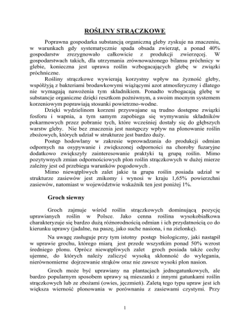 ROŚLINY STRĄCZKOWE Poprawna gospodarka substancją organiczną gleby zyskuje na znaczeniu, w warunkach gdy systematycznie spada obsada zwierząt, a ponad 40% gospodarstw zrezygnowało całkowicie z produkcji zwierzęcej. W gospodarstwach takich, dla utrzymania zrównoważonego bilansu próchnicy w glebie, konieczna jest uprawa roślin wzbogacających glebę w związki próchniczne. Rośliny strączkowe wywierają korzystny wpływ na żyzność gleby, współżyją z bakteriami brodawkowymi wiążącymi azot atmosferyczny i dlatego nie wymagają nawożenia tym składnikiem. Ponadto wzbogacają glebę w substancje organiczne dzięki resztkom pożniwnym, a swoim mocnym systemem korzeniowym poprawiają stosunki powietrzno-wodne. Dzięki wydzielinom korzeni przyswajane są trudno dostępne związki fosforu i wapnia, a tym samym zapobiega się wymywaniu składników pokarmowych przez pobranie tych, które wcześniej dostały się do głębszych warstw gleby. Nie bez znaczenia jest następczy wpływ na plonowanie roślin zbożowych, których udział w strukturze jest bardzo duży. Postęp hodowlany w zakresie wprowadzania do produkcji odmian odpornych na osypywanie i zwiększonej odporności na choroby fuzaryjne dodatkowo zwiększyły zainteresowanie praktyki tą grupą roślin. Mimo pozytywnych zmian odpornościowych plon roślin strączkowych w dużej mierze zależny jest od przebiegu warunków pogodowych . Mimo niewątpliwych zalet jakie ta grupa roślin posiada udział w strukturze zasiewów jest znikomy i wynosi w kraju 1,65% powierzchni zasiewów, natomiast w województwie wskaźnik ten jest poniżej 1%. Groch siewny Groch zajmuje wśród roślin strączkowych dominującą pozycję uprawianych roślin w Polsce. Jako cenna roślina wysokobiałkowa charakteryzuje się bardzo dużą różnorodnością odmian i ich przydatnością co do kierunku uprawy (jadalne, na paszę, jako suche nasiona, i na zielonkę). Na uwagę zasługuje przy tym istotny postęp biologiczny, jaki nastąpił w uprawie grochu, którego miarą jest przede wszystkim ponad 50% wzrost średniego plonu. Oprócz niewątpliwych zalet groch posiada także cechy ujemne, do których należy zaliczyć wysoką skłonność do wylegania, nierównomierne dojrzewanie strąków oraz nie zawsze wysoki plon nasion. Groch może być uprawiany na plantacjach jednogatunkowych, ale bardzo popularnym sposobem uprawy są mieszanki z innymi gatunkami roślin strączkowych lub ze zbożami (owies, jęczmień). Zaletą tego typu upraw jest ich większa wierność plonowania w porównaniu z zasiewami czystymi. Przy 1 wyborze odmian do komponowania mieszanek należy wziąć pod uwagę wymagania glebowe odmian grochu, a także odmiany zboż. Odmiany wchodzące w skład mieszanki powinny cechować zbliżony termin dojrzewania i mała podatność na wyleganie. Gleba powinna być przygotowana bardzo starannie. Tabela 51. Groch siewny – badane odmiany w 2012 roku. Lp. Odmiana Rok wpisania do Rejestru Odmian 1 Muza 2009 2 Sokolik 2001 3 Eureka 2003 4 Gwarek 2004 5 Hubal 2005 6 Milwa 2005 7 Klif 2008 8 Model 2011 9 Turnia 2011 Hodowca (lub polski przedstawiciel dla odmian zagranicznych) HR Smolice sp. z o.o. 63-740 Kobylin Poznańska HR sp. z o.o. 63-004 Tulce Poznańska HR sp. z o.o. 63-004 Tulce Poznańska HR sp. z o.o. 63-004 Tulce HR Szelejewo sp. z o.o. 63-820 Piaski HR Smolice sp. z o.o. 63-740 Kobylin Poznańska HR sp. z o.o. 63-004 Tulce HR Smolice sp. z o.o. 63-740 Kobylin Poznańska HR sp. z o.o. 63-004 Tulce *) – TR – tradycyjna; S L– wąsy czepne zamiast liści. 2 Typ ulistnienia *) SL SL TR TR TR SL TR SL SL Tabela 52. Agrotechniczne i polowe warunki prowadzenia doświadczeń w 2012 r. Wyszczególnienie Krzyżewo Marianowo Szepietowo Rumejki Kompleks glebowy 2 4 4 4 Klasa bonitacyjna gleby III b IV a III b IV a pH gleby Zasobność gleby mg/100 g P205 K2 0 Mg Przedplon Data siewu 6,8 5,9 6,2 7,5 10,6 7,6 1,3 Jęczmień ozimy 11.04 18,4 13,3 5,8 Pszenica jara 11.04 33,0 15,3 10,6 Jęczmień jary 03.04 28,4 18,7 5,8 Mieszanka zbóż jarych 05.04 02.08 30.07 20.08 05.08 17 18 30 15 80 60 40 50 90 Sumi Alpha 050 EC – 0,25 l. 90 Sumi Alpha 050 EC – 0,2 l. 75 Afalon Dyspersyjny 450 SC – 1,4 l. Harrier 295 ZC – 1,8 l. Fusilade 150 EC – 1 l. Basagran 600 SL – 2 l. Linurex 50 WP – 1,3 l. Fusilade 150 EC – 2,5 l. Basfoliar 36 – 6 l. Basfoliar 36 – 3 l. Data zbioru N Nawożenie kg/ha P205 kg/ha K20 kg/ha Insektycydy Herbicydy dawka Nawożenie dolistne 120 Pirimor 500 WG – 500 g. Sumi Alfa 050 EC – 0,2 l. Afalon Dyspersyjny 450 EC – 1 l. Command 480 EC – 0,2 l. Basfoliar 36 – 2 l. 3 Decis 2,5 EC – 0,2 l. Tabela 53. Plonowanie, ważniejsze cechy rolnicze odmian i porażenie przez choroby grochu siewnego badanego w 2012 roku. Średni plon dt z ha % wzorca % wzorca 2011 % wzorca 2011 - 2012 Wysokość roślin Wyleganie przed zbiorem 38,0 37,6 32,6 40,3 x 40,3 38,5 39,4 108 49,9 30,0 43,1 34,2 39,3 -1,0 97 103 100 131 4,3 200,1 211 6,8 51,5 39,3 39,5 32,3 40,7 0,4 101 101 101 109 2,2 235,4 206 6,3 45,0 41,4 43,3 26,8 39,1 -1,2 97 108 103 110 3,1 237,7 211 5,5 52,1 40,1 39,1 28,3 40,0 -0,3 99 113 106 105 2,6 237,8 206 6,0 49,1 40,0 29,8 32,2 37,8 -2,5 94 106 100 104 2,1 216,4 207 6,3 *) 49,7 25,9 35,5 31,8 35,7 -4,6 89 96 93 84 2,9 224,4 205 6,3 *) 60,6 43,7 48,6 41,4 48,6 8,3 121 111 116 111 4,2 234,4 207 7,0 k *) 59,0 40,5 25,6 31,9 39,2 -1,1 97 108 103 104 2,0 213,5 207 6,5 *) 59,0 41,4 34,3 34,5 42,3 2,0 105 104 105 108 2,4 213,8 206 6,8 *) k – wzorzec stanowi średnia ze wszystkich badanych odmian. *) – odmiany wąsolistne 4 Zgorzel Rumejki 52,8 z ha Dojrzałość techniczna Szepietowo Skala 90 Masa Tysiąca Nasion Marianowo cm ana Odchylenie od wzorca Krzyżewo 2012 Dni od Skala siewu 90 g 2,9 223,7 207 6,4