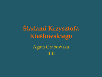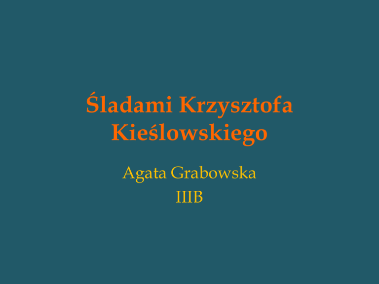 Śladami Krzysztofa Kieślowskiego Agata Grabowska IIIB Krzysztof Kieślowski Kieślowski Krzysztof, ur. 27 VI 1941, Warszawa, zm. 13 III 1996, tamże, reżyser i scenarzysta filmowy; jeden z najwybitniejszych polskich reżyserów filmowych; filmy fabularne — współczesne dramaty społeczno-obyczajowe (Personel, Amator), psychologiczno-filozoficzne (tryptyk Trzy kolory — Niebieski, Biały, Czerwony), cykl moralitetów Dekalog; filmy dokumentalne (Gadające głowy, Życiorys, Z punktu widzenia nocnego portiera). Warszawa W tym mieście urodził się Kieślowski . Uczęszczał do Państwowego Liceum Techniki Teatralnej. Działał m.in. jako garderobiany w Teatrze Współczesnym. Miał wówczas styczność z najwybitniejszymi polskimi aktorami, którzy w przyszłości stawali się członkami obsady jego filmów. Łódź W latach 1964-1968 studiował w Łódzkiej Szkole Filmowej. W 1998 roku w Alei Gwiazd w Łodzi odsłonięto jego gwiazdę. W tym mieście prowadził seminaria w latach 1993-1996. Katowice W tym mieście również prowadził seminaria w latach 1979-1982. Od 2000 roku Wydział Radia i TV Uniwersytetu Śląskiego w Katowicach nosi imię Krzysztofa Kieślowskiego. Berlin W latach 80-tych Kieślowski prowadził seminaria w Berlinie Zachodnim. W 1993 otrzymał Srebrnego Niedźwiedzia na Berlinale za Najlepszą Reżyserię filmu „Biały” Helsinki Jako wielki autorytet w dziedzinie filmu wykładał scenopisarstwo na uczelniach w Helsinkach w 1988 roku. reżyserię i Szwajcaria W tym kraju prowadził seminaria w latach 1985, 1988, 1992. Francja Po sukcesie Dekalogu nakręcił kilka filmów we Francji, mimo że nie znał języka francuskiego. Gdy ukończył pracę nad trylogią Trzy kolory, zapowiedział zakończenie kariery reżyserskiej. Otrzymał nominacja do Cezara - Nagrody Francuskiej Akademii Filmowej w kategorii scenariusz i reżyseria za film „Czerwony”. Cannes W 2007 roku na festiwalu filmowym w Cannes po raz pierwszy została przyznana nagroda imienia Krzysztofa Kieślowskiego. Honoruje ona autorów najlepszych scenariuszy filmowych z Europy Środkowej i Wschodniej. W 1987 otrzymał Nagrodę Jury FIPRESCI w Cannes. W 1991 otrzymał nominację za reżyserię „Podwójnego życia Weroniki” do Złotej Palmy i nagrody FIPRESCI.