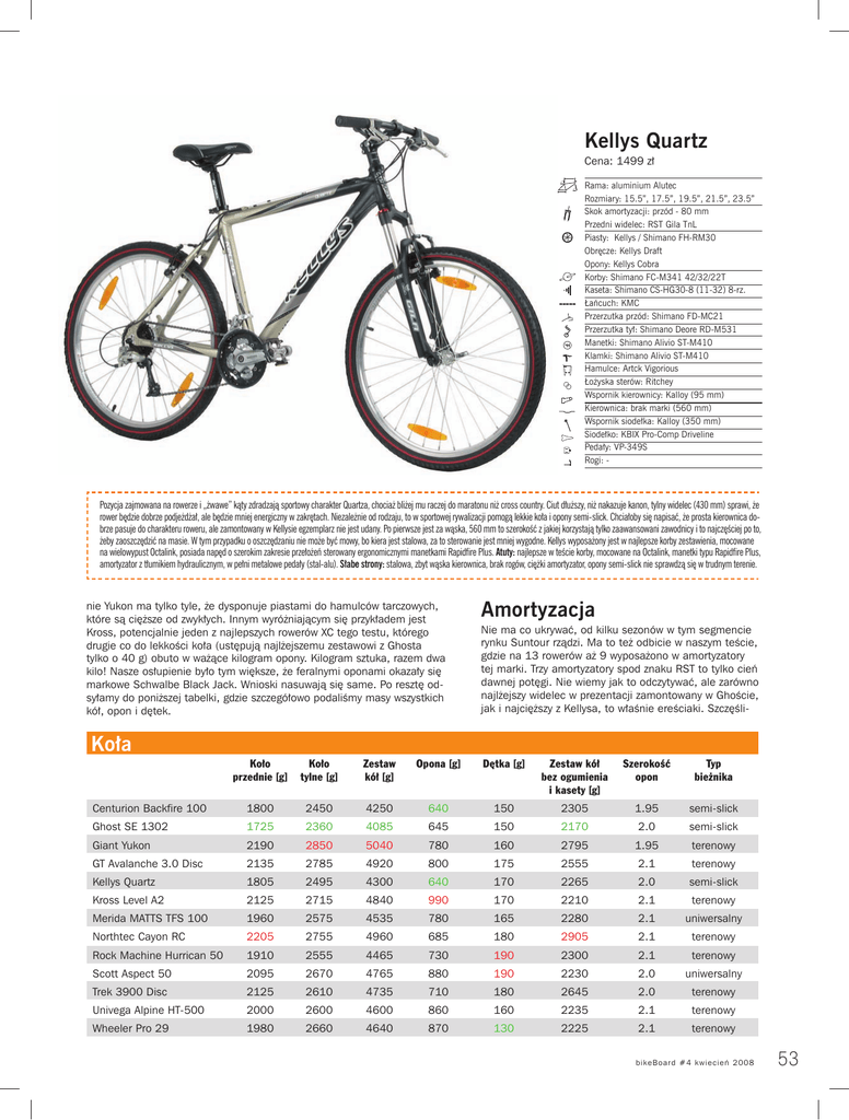 Kellys Quartz Cena: 1499 zł Rama: aluminium Alutec Rozmiary: 15.5”, 17.5”, 19.5”, 21.5”, 23.5” Skok amortyzacji: przód - 80 mm Przedni widelec: RST Gila TnL Piasty: Kellys / Shimano FH-RM30 Obręcze: Kellys Draft Opony: Kellys Cobra Korby: Shimano FC-M341 42/32/22T Kaseta: Shimano CS-HG30-8 (11-32) 8-rz. Łańcuch: KMC Przerzutka przód: Shimano FD-MC21 Przerzutka tył: Shimano Deore RD-M531 Manetki: Shimano Alivio ST-M410 Klamki: Shimano Alivio ST-M410 Hamulce: Artck Vigorious Łożyska sterów: Ritchey Wspornik kierownicy: Kalloy (95 mm) Kierownica: brak marki (560 mm) Wspornik siodełka: Kalloy (350 mm) Siodełko: KBIX Pro-Comp Driveline Pedały: VP-349S Rogi: - Pozycja zajmowana na rowerze i „żwawe” kąty zdradzają sportowy charakter Quartza, chociaż bliżej mu raczej do maratonu niż cross country. Ciut dłuższy, niż nakazuje kanon, tylny widelec (430 mm) sprawi, że rower będzie dobrze podjeżdżał, ale będzie mniej energiczny w zakrętach. Niezależnie od rodzaju, to w sportowej rywalizacji pomogą lekkie koła i opony semi-slick. Chciałoby się napisać, że prosta kierownica dobrze pasuje do charakteru roweru, ale zamontowany w Kellysie egzemplarz nie jest udany. Po pierwsze jest za wąska, 560 mm to szerokość z jakiej korzystają tylko zaawansowani zawodnicy i to najczęściej po to, żeby zaoszczędzić na masie. W tym przypadku o oszczędzaniu nie może być mowy, bo kiera jest stalowa, za to sterowanie jest mniej wygodne. Kellys wyposażony jest w najlepsze korby zestawienia, mocowane na wielowypust Octalink, posiada napęd o szerokim zakresie przełożeń sterowany ergonomicznymi manetkami Rapidfire Plus. Atuty: najlepsze w teście korby, mocowane na Octalink, manetki typu Rapidfire Plus, amortyzator z tłumikiem hydraulicznym, w pełni metalowe pedały (stal-alu). Słabe strony: stalowa, zbyt wąska kierownica, brak rogów, ciężki amortyzator, opony semi-slick nie sprawdzą się w trudnym terenie. nie Yukon ma tylko tyle, że dysponuje piastami do hamulców tarczowych, które są cięższe od zwykłych. Innym wyróżniającym się przykładem jest Kross, potencjalnie jeden z najlepszych rowerów XC tego testu, którego drugie co do lekkości koła (ustępują najlżejszemu zestawowi z Ghosta tylko o 40 g) obuto w ważące kilogram opony. Kilogram sztuka, razem dwa kilo! Nasze osłupienie było tym większe, że feralnymi oponami okazały się markowe Schwalbe Black Jack. Wnioski nasuwają się same. Po resztę odsyłamy do poniższej tabelki, gdzie szczegółowo podaliśmy masy wszystkich kół, opon i dętek. Amortyzacja Nie ma co ukrywać, od kilku sezonów w tym segmencie rynku Suntour rządzi. Ma to też odbicie w naszym teście, gdzie na 13 rowerów aż 9 wyposażono w amortyzatory tej marki. Trzy amortyzatory spod znaku RST to tylko cień dawnej potęgi. Nie wiemy jak to odczytywać, ale zarówno najlżejszy widelec w prezentacji zamontowany w Ghoście, jak i najcięższy z Kellysa, to właśnie ereściaki. Szczęśli- Koła Koło przednie [g] Koło tylne [g] Zestaw kół [g] Opona [g] Dętka [g] Zestaw kół bez ogumienia i kasety [g] Szerokość opon Typ bieżnika Centurion Backfire 100 1800 2450 4250 640 Ghost SE 1302 1725 2360 4085 645 150 2305 1.95 semi-slick 150 2170 2.0 semi-slick Giant Yukon 2190 2850 5040 780 160 2795 1.95 terenowy GT Avalanche 3.0 Disc 2135 2785 4920 800 175 2555 2.1 terenowy Kellys Quartz 1805 2495 4300 640 170 2265 2.0 semi-slick Kross Level A2 2125 2715 4840 990 170 2210 2.1 terenowy Merida MATTS TFS 100 1960 2575 4535 780 165 2280 2.1 uniwersalny Northtec Cayon RC 2205 2755 4960 685 180 2905 2.1 terenowy Rock Machine Hurrican 50 1910 2555 4465 730 190 2300 2.1 terenowy Scott Aspect 50 2095 2670 4765 880 190 2230 2.0 uniwersalny Trek 3900 Disc 2125 2610 4735 710 180 2645 2.0 terenowy Univega Alpine HT-500 2000 2600 4600 860 160 2235 2.1 terenowy Wheeler Pro 29 1980 2660 4640 870 130 2225 2.1 terenowy bi k e Boa rd # 4 k w ie c ie ń 2 0 0 8 53