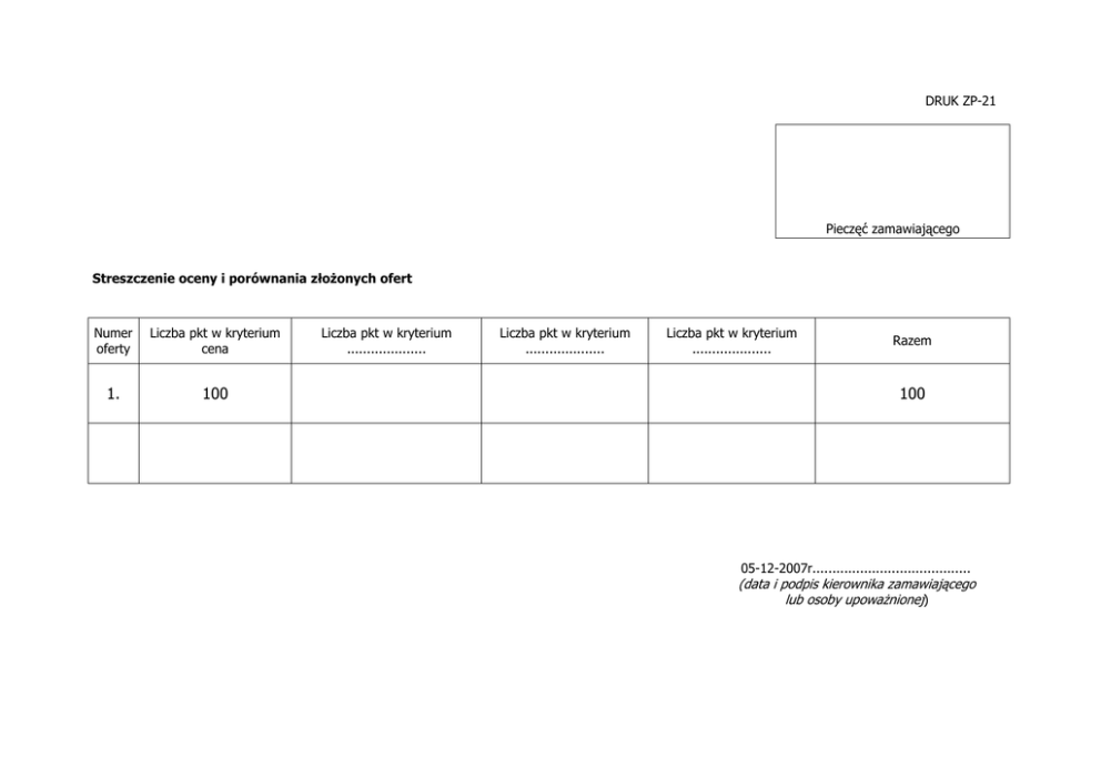DRUK ZP-21 Pieczęć zamawiającego Streszczenie oceny i porównania złoŜonych ofert Numer oferty Liczba pkt w kryterium cena 1. 100 Liczba pkt w kryterium .................... Liczba pkt w kryterium .................... Liczba pkt w kryterium .................... Razem 100 05-12-2007r........................................ (data i podpis kierownika zamawiającego lub osoby upowaŜnionej)