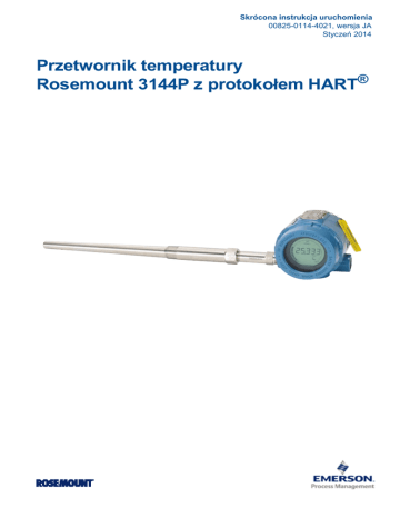 Skrócona instrukcja uruchomienia 00825-0114-4021, wersja JA Styczeń 2014 Przetwornik temperatury Rosemount 3144P z protokołem HART® Styczeń 2014 Skrócona instrukcja UWAGA Skrócona instrukcja instalacji zawiera podstawowe informacje o przetworniku Rosemount 3144P. Nie zawiera szczegółowych informacji na temat konfiguracji, diagnostyki, obsługi, konserwacji, i wykrywania niesprawności oraz instalacji przeciwwybuchowych, ognioszczelnych i iskrobezpiecznych. Szczegółowe informacje można znaleźć w instrukcji obsługi przetwornika 3144P (numer dokumentu 00809-0114-4021). Instrukcja obsługi i skrócona instrukcja instalacji dostępne są w Internecie na stronie www.emersonprocess.com. OSTRZEŻENIE Wybuch może spowodować śmierć lub poważne obrażenia ciała: Instalacja tego przetwornika w środowisku zagrożonym wybuchem musi odbywać się zgodnie z lokalnymi, krajowymi i międzynarodowymi normami, przepisami i procedurami. Przed instalacją należy zapoznać się z rozdziałem poświęconym ograniczeniom, wynikającym ze stosowania się do norm pracy w obszarach zagrożonych. Wycieki mediów procesowych mogą spowodować uszkodzenie ciała lub śmierć. ■ Przed podaniem ciśnienia należy zainstalować i dokręcić osłony lub czujniki. ■ Nie wolno demontować osłony czujnika podczas działania instalacji procesowej. Porażenie prądem elektrycznym może spowodować śmierć lub poważne obrażenia ciała. ■ Nie wolno dotykać przewodów i zacisków. Przewody mogą znajdować się pod wysokim napięciem, grożącym porażeniem elektrycznym. Osłony kablowe/przepusty ■ Jeśli nie podano inaczej, osłony kablowe i przepusty w obudowie przetwornika mają gwint 1/2-14 NPT. ■ Przy instalacji w środowisku zagrożonym wybuchem, w osłonach kablowych/przepustach należy stosować właściwe zaślepki, adaptery i dławiki kablowe lub posiadające atest Ex. Spis treści Sprawdzenie konfiguracji systemu . . . . . . . . . . . . . . . . . . . . . . . . . . . . . . . . . . . . . . . . . . . . . . 3 Weryfikacja konfiguracji . . . . . . . . . . . . . . . . . . . . . . . . . . . . . . . . . . . . . . . . . . . . . . . . . . . . . . 3 Ustawienie przełączników. . . . . . . . . . . . . . . . . . . . . . . . . . . . . . . . . . . . . . . . . . . . . . . . . . . . . 6 Montaż przetwornika. . . . . . . . . . . . . . . . . . . . . . . . . . . . . . . . . . . . . . . . . . . . . . . . . . . . . . . . . 7 Okablowanie i włączenie zasilania . . . . . . . . . . . . . . . . . . . . . . . . . . . . . . . . . . . . . . . . . . . . . . 9 Test pętli . . . . . . . . . . . . . . . . . . . . . . . . . . . . . . . . . . . . . . . . . . . . . . . . . . . . . . . . . . . . . . . . . 12 Systemy bezpieczeństwa SIS. . . . . . . . . . . . . . . . . . . . . . . . . . . . . . . . . . . . . . . . . . . . . . . . . 13 Atesty urządzenia . . . . . . . . . . . . . . . . . . . . . . . . . . . . . . . . . . . . . . . . . . . . . . . . . . . . . . . . . . 14 2 Skrócona instrukcja uruchomienia Styczeń 2014 Krok 1: Sprawdzenie konfiguracji systemu Potwierdzenie wersji HART ■ ■ Jeśli wykorzystywany jest system sterowania lub zarządzania posługujący się protokołem HART, przed instalacją przetwornika należy sprawdzić zgodność protokołu HART tych systemów. Nie wszystkie systemy mogą komunikować się przy użyciu protokołu HART w wersji 7. Przetwornik może być skonfigurowany do korzystania z wersji 5 lub 7 protokołu HART. Sposób zmiany wersji protokołu HART w przetworniku przedstawiono na stronie 4. Identyfikacja urządzenia Sterownik urządzenia polowego Wersja oprogramowania NAMUR Wersja oprogramowania HART Wersja ogólna HART Wersja urządzenia 7 6 Marzec 2012 1.1.1 2 5 5 Luty 2007 Nie dotyczy 1 5 4 Data wydania oprogramowania Instrukcje obsługi Numer dokumentu instrukcji obsługi 00809-0100-4021 00809-0100-4021 Krok 2: Weryfikacja konfiguracji Do komunikacji z przetwornikiem 3144P można wykorzystać komunikator polowy (do komunikacji konieczna jest obecność w pętli rezystancji o wartości od 250 do1100 omów) lub program AMS Device Manager. Nie wolno obsługiwać przetwornika, jeśli napięcie na jego zaciskach zasilania jest mniejsze od 12 V DC. Szczegółowe informacje można znaleźć w instrukcji obsługi przetworników 3144P (numer dokumentu 00809-0100-4021) i w instrukcji obsługi komunikatora polowego (numer dokumentu 00809-0100-4276). Uaktualnienie oprogramowania komunikatora polowego Do uzyskania pełnej komunikacji z przetwornikiem 3144P, komunikator polowy musi mieć oprogramowaniem w wersji v5 lub v6 oraz opisy urządzeń DD v1 lub nowsze. Opisy urządzeń (DD) są dostępne we wszystkich nowych komunikatorach, na stronie lub mogą być uaktualnione w serwisie Emerson Process Management. Opisy urządzeń są następujące: Urządzenie działające w trybie HART 5: wersja urządzenia v5, DD v1 Urządzenie działające w trybie HART 7: wersja urządzenia v6, DD v1 W celu sprawdzenia, czy konieczne jest uaktualnienie oprogramowania, należy wykonać poniższe czynności. Patrz ilustracja 1. 1. Podłączyć czujnik (patrz schemat połączeń znajdujący się wewnątrz pokrywy obudowy przetwornika). 2. Podłączyć zasilanie do zacisków zasilania („+” lub „–”). 3 Styczeń 2014 Skrócona instrukcja 3. Podłączyć komunikator polowy w pętli do zacisków rezystora lub zacisków zasilania/sygnałowych w przetworniku. 4. Jeśli komunikator posiada poprzednią wersję opisów urządzenia (zbiorów DD), to pojawi się następujący komunikat: NOTICE: Upgrade the communicator software to access new XMTR functions (UWAGA: Aby uzyskać dostęp do nowych funkcji przetwornika, należy uaktualnić oprogramowanie komunikatora.). Continue with old description? (Czy kontynuować z opisami w starszych wersjach?) Uwaga: Jeśli ten komunikat nie pojawi się, oznacza to, że komunikator posiada najnowszą wersję opisów urządzenia DD. Jeśli najnowsza wersja opisów jest nied