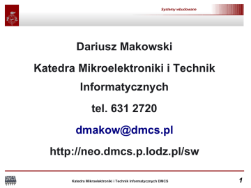 Systemy wbudowane Dariusz Makowski Katedra Mikroelektroniki i Technik Informatycznych tel. 631 2720 [email protected] http://neo.dmcs.p.lodz.pl/sw Katedra Mikroelektroniki i Technik Informatycznych DMCS 1 Systemy wbudowane Zakres przedmiotu Systemy mikroprocesorowe, systemy wbudowane Laboratorium Rodzina procesorów ARM Urządzenia peryferyjne Interfejsy w systemach wbudowanych Programy wbudowane na przykładzie procesorów ARM Metodyki projektowania systemów wbudowanych Systemy czasu rzeczywistego Katedra Mikroelektroniki i Technik Informatycznych DMCS 2 Systemy wbudowane Interfejsy w systemach wbudowanych Katedra Mikroelektroniki i Technik Informatycznych DMCS 3 Systemy wbudowane Definicje podstawowe (3) Pamięć komputerowa (ang. Computer Memory) Pamięć komputerowa to urządzenie elektroniczne lub mechaniczne służące do przechowywania danych i programów (systemu operacyjnego oraz aplikacji). Urządzenia zewnętrzne, peryferyjne (ang. Peripheral Device) Urządzenia elektroniczne dołączone do procesora przez magistrale systemową lub interfejs. Urządzenia zewnętrzne wykorzystywane są do realizowania specjalizowanej funkcjonalności systemu. Magistrala (ang. bus) Połączenie elektryczne umożliwiające przesyłanie danym pomiędzy procesorem, pamięcią i urządzeniami peryferyjnymi. Magistra systemowa zbudowane jest zwykłe z kilkudziesięciu połączeń elektrycznych (ang. Parallel Bus) lub szeregowego połączenia (ang. Serial Bus). Interface (ang. Interface) Urządzenie elektroniczne lub optyczne pozwalające na komunikację między dwoma innymi urządzeniami, których bezpośrednio nie da się ze sobą połączyć. Katedra Mikroelektroniki i Technik Informatycznych DMCS 4 Systemy wbudowane Współpraca procesora z urządzeniami peryferyjnymi Interfejsy dostępne w procesorach rodziny ARM: • Interfejs równoległy PIO (zwykle 32 bity), • Interfejsy szeregowe: – Interfejs DBGU - zgodny ze standardem EIA RS232, – Interfejs uniwersalny USART, – Interfejs Serial Peripheral Interface (SPI), – Interfejs Synchronous Serial Controller (SSC) – Interfejs I2C, Interfajs Two-wire Interface (TWI), – Interfejs Controlled Area Network (CAN), – Interfejs Universal Serial Bus (USB), – Interfejs Ethernet 10/100. Katedra Mikroelektroniki i Technik Informatycznych DMCS 5 Systemy wbudowane Moduł transceivera szeregowego UART (Universal Asynchronous Receiver/Transmitter module) Katedra Mikroelektroniki i Technik Informatycznych DMCS 6 Systemy wbudowane Interfejs szeregowy EIA RS232 Katedra Mikroelektroniki i Technik Informatycznych DMCS 7 Systemy wbudowane Transceiver UART Rejestr przesuwny TxD D0-D7 Nadajnik Clk D0-D7 Odbiornik RxD Clk Katedra Mikroelektroniki i Technik Informatycznych DMCS 8 Systemy wbudowane Ramka danych transmitera UART (1) Mark Space Katedra Mikroelektroniki i Technik Informatycznych DMCS 9 Systemy wbudowane Ramka danych transmitera UART (2) Przesylana dana: 0100.1011b = 0x4B Katedra Mikroelektroniki i Technik Informatycznych DMCS 10 Systemy wbudowane Transmisja synchroniczna vs asynchroniczna? Katedra Mikroelektroniki i Technik Informatycznych DMCS 11 Systemy wbudowane Specyfikacja elektryczna EIA RS232c Katedra Mikroelektroniki i Technik Informatycznych DMCS 12 Systemy wbudowane Kabel null-modem EIA 232 Katedra Mikroelektroniki i Technik Informatycznych DMCS 13 Systemy wbudowane Dodatkowe linie sterujące Hardware Flow Control DTE (ang. Data Terminal Equipment) - urządzenie do przetwarzania danych (końcowe, np. komputer) DCE (ang. Data Circuit-terminating Equipment) – urządzenie do trans. danych (np. Modem) DSR - Data Set Ready - gotowość modemu DTR - Data Terminal Ready - gotowość terminala RTS - Request to Send Data - żądanie wysyłania CTS - Clear to Send - gotowość wysyłania Katedra Mikroelektroniki i Technik Informatycznych DMCS 14 Systemy wbudowane Pełny kabel null-modem Katedra Mikroelektroniki i Technik Informatycznych DMCS 15 Systemy wbudowane Poziomy napięć określone przez standard EIA 232 Wyjście procesora Standard EIA RS 232 Katedra Mikroelektroniki i Technik Informatycznych DMCS 16 Systemy wbudowane Konwerter poziomów napięć MAX 232 (5 V) MAX 3232 (3,3 V) Katedra Mikroelektroniki i Technik Informatycznych DMCS 17 Systemy wbudowane Programy do komunikacji z wykorzystaniem standardu EIA RS232 Program Hyper terminal Program minicom Program ssh Program Terminal (http://www.elester-pkp.com.pl/index.php?id=92&lang=pl&zoom=0) Katedra Mikroelektroniki i Technik Informatycznych DMCS 18 Systemy wbudowane AT91SAM9263 – moduł diagnostyczny DBGU (rozdział 30) Katedra Mikroelektroniki i Technik Informatycznych DMCS 19 Systemy wbudowane Port szeregowy jako interfejs diagnostyczny Cechy portu diagnostycznego DBGU (DeBuG Unit): Asynchroniczna transmisja danych zgodna ze standardem RS232 (8 bitów danych, jeden bit parzystości z możliwością wyłączenia), Możliwość zgłaszania przerwań systemowych współdzielonych (PIT, RTT, WDT,DMA, PMC, RSTC, MC), Azaliza poprawności odebranych ramek, Sygnalizacja przepełnionego bufora TxD lub RxD, Trzy tryby diagnostyczne: zdalny loopback, lokalny loopback oraz echo, Maksymalna szybkość transmisji rzędu 1 Mbit/s, Możliwość komunikacji z rdzeniem procesora COMMRx/COMMTx. Katedra Mikroelektroniki i Technik Informatycznych DMCS 20 Systemy wbudowane Schemat blokowy portu DBGU procesora ARM 9 Wyprowadzenia procesora Transceiver szeregowy Sygnał przerwnia SYS Katedra Mikroelektroniki i Technik Informatycznych DMCS 21 Systemy wbudowane Szybkość transmisji Generator sygnału zegarowego odpowiedzialnego za szybkość transmisji (ang. Baud Rate). Szybkość transmisji danych wyrażona jest wzorem: Baud Rate = MCK / (16 x CD), gdzie CD (Clock Divisor) jest polem rejestru DBGU_BRGR Katedra Mikroelektroniki i Technik Informatycznych DMCS 22 Systemy wbudowane Błędy podczas transmisji danych Przepełnienie bufora odbiorczego BGU_RHR (ang. Buffer Overflow) Błąd parzystości (ang. Par