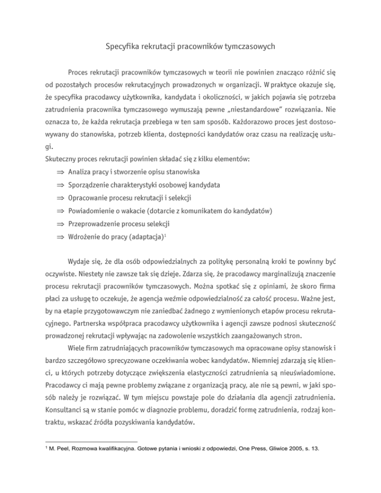 1 M. Peel, Rozmowa kwalifikacyjna. Gotowe pytania i wnioski z odpowiedzi, One Press, Gliwice 2005, s. 13. E. McKenna, N. Beech, Zarządzanie Zasobami Ludzkimi, Wydawnictwo Felberg SJA, Warszawa 1999, s. 120125. 3 Agencje zatrudnienia 2012 – Informacje z działalności agencji zatrudnienia, Ministerstwo Pracy i Polityki Społecznej, Warszawa, 2013r., s. 23. 4 Agencje zatrudnienia 2012 – Informacje z działalności agencji zatrudnienia, Ministerstwo Pracy i Polityki Społecznej, Warszawa, 2013r., s. 21. 5 The agency work industry around the world. Main statistics., CIETT, 2009, s. 34. 2  J.M. Lichtarski, Specyfika doboru pracowników do struktur zadaniowych w teorii i praktyce, Zarządzanie Zasobami Ludzkimi, Nr 6 2007, IPiSP, Warszawa 2007, s. 25-27. 6            Nie Kandydat Rozmowa kwalifikacyjna Tak Nie Test badający zdolności manualne Nie Tak Badanie medycyny pracy Tak 0 min. Czas Umowa o pracę 30 min.  A. Żarczyńska-Dobiesz, Wprowadzenie nowego pracownika do pracy, Zarządzanie Zasobami Ludzkimi Nr 3-4 2007, IPiSP, Warszawa 2007, s. 99-101. 7   8 A.I. Baruk, Marketing personalny jako instrument kreowania wizerunku firmy, Difin, Warszawa 2006, s. 80.
