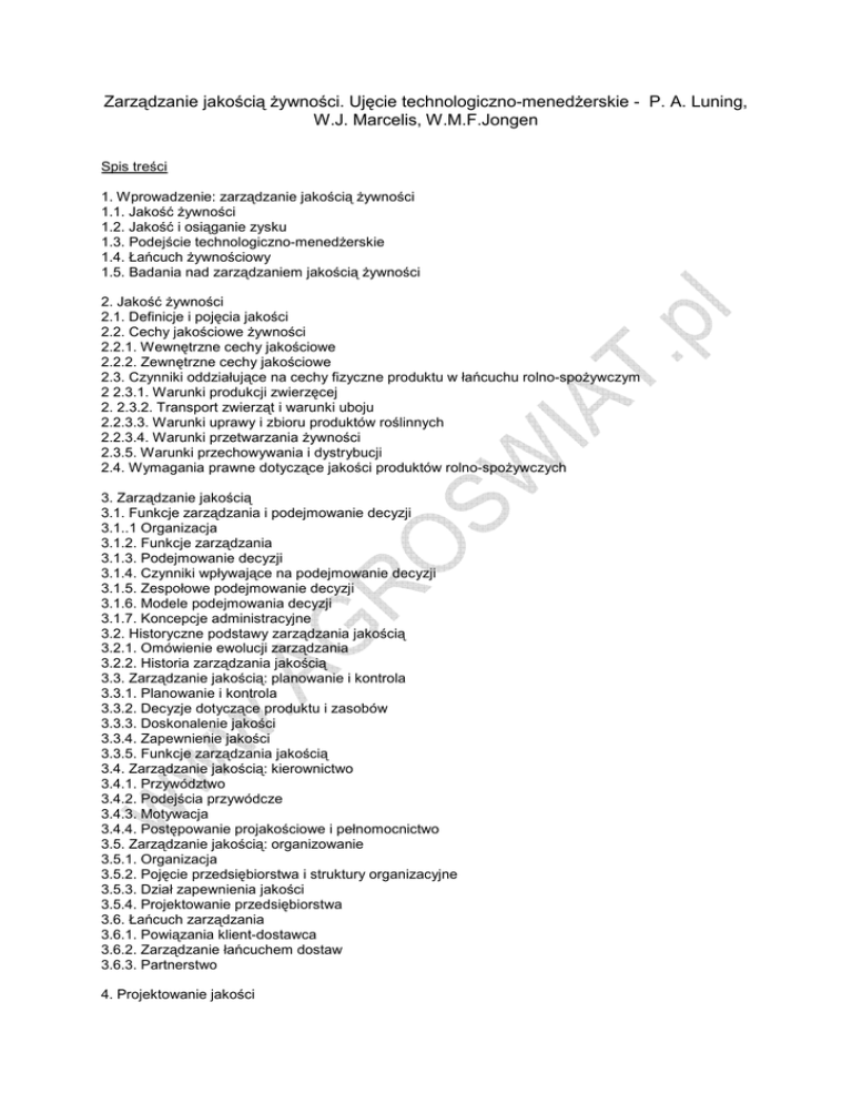 Zarządzanie jakością Ŝywności. Ujęcie technologiczno-menedŜerskie - P. A. Luning, W.J. Marcelis, W.M.F.Jongen Spis treści 1. Wprowadzenie: zarządzanie jakością Ŝywności 1.1. Jakość Ŝywności 1.2. Jakość i osiąganie zysku 1.3. Podejście technologiczno-menedŜerskie 1.4. Łańcuch Ŝywnościowy 1.5. Badania nad zarządzaniem jakością Ŝywności 2. Jakość Ŝywności 2.1. Definicje i pojęcia jakości 2.2. Cechy jakościowe Ŝywności 2.2.1. Wewnętrzne cechy jakościowe 2.2.2. Zewnętrzne cechy jakościowe 2.3. Czynniki oddziałujące na cechy fizyczne produktu w łańcuchu rolno-spoŜywczym 2 2.3.1. Warunki produkcji zwierzęcej 2. 2.3.2. Transport zwierząt i warunki uboju 2.2.3.3. Warunki uprawy i zbioru produktów roślinnych 2.2.3.4. Warunki przetwarzania Ŝywności 2.3.5. Warunki przechowywania i dystrybucji 2.4. Wymagania prawne dotyczące jakości produktów rolno-spoŜywczych 3. Zarządzanie jakością 3.1. Funkcje zarządzania i podejmowanie decyzji 3.1..1 Organizacja 3.1.2. Funkcje zarządzania 3.1.3. Podejmowanie decyzji 3.1.4. Czynniki wpływające na podejmowanie decyzji 3.1.5. Zespołowe podejmowanie decyzji 3.1.6. Modele podejmowania decyzji 3.1.7. Koncepcje administracyjne 3.2. Historyczne podstawy zarządzania jakością 3.2.1. Omówienie ewolucji zarządzania 3.2.2. Historia zarządzania jakością 3.3. Zarządzanie jakością: planowanie i kontrola 3.3.1. Planowanie i kontrola 3.3.2. Decyzje dotyczące produktu i zasobów 3.3.3. Doskonalenie jakości 3.3.4. Zapewnienie jakości 3.3.5. Funkcje zarządzania jakością 3.4. Zarządzanie jakością: kierownictwo 3.4.1. Przywództwo 3.4.2. Podejścia przywódcze 3.4.3. Motywacja 3.4.4. Postępowanie projakościowe i pełnomocnictwo 3.5. Zarządzanie jakością: organizowanie 3.5.1. Organizacja 3.5.2. Pojęcie przedsiębiorstwa i struktury organizacyjne 3.5.3. Dział zapewnienia jakości 3.5.4. Projektowanie przedsiębiorstwa 3.6. Łańcuch zarządzania 3.6.1. Powiązania klient-dostawca 3.6.2. Zarządzanie łańcuchem dostaw 3.6.3. Partnerstwo 4. Projektowanie jakości 4.1. Proces projektowania 4.1.1. RóŜne typy nowych produktów 4.1.2. Etapy w procesie projektowania 4.1.3. Projektowanie i wydajność biznesu 4.2. Rozwój produktu 4.2.1. Technologiczne zmienne projektowania produktu 4.2.2. Narzędzia technologiczne wspierające projektowanie produktu 4.2.3. Metoda Taguchiego w projektowaniu produktu 4.3. Projektowanie procesu 4.3.1. Zmienne projektowania procesu technologicznego 4.3.2. Narzędzia technologiczne wspierające projektowanie procesu 4.3.3. Wydajność procesu i metoda Taguchiego 4.4. Zarządzanie projektem zorientowane na klienta 4.4..1 Informacje konsumenckie 4.4.2 Projektowanie procesów zorientowanych na klienta 4.5 Projekt interdyscyplinarny 4.5.1 InŜynieria współdziałająca 4.5.2 Zespoły interdyscyplinarne 4.6 Zarządzanie procesem projektowania 4.6.1. Strategia projektowania produktu 4.6.2. Zarządzanie projektem 4.7. Projektowanie jakości w przemyśle Ŝywnościowym 5. Kontrola jakości 5.1. Proces kontroli jakości w produkcji rolno-spoŜywczej 5.1.1. Ogólna zasada kontroli jakości 5.1.2. ródła zmienności technologicznych a kontrola w produkcji rolno-spoŜywczej 5.2. Metody i techniki pomiarów stosowane w kontroli jakości 5.2.1. Pobieranie prób do badań 5.2.2. Kontrola statystyczna procesu 5.2.3. Analizy jakości i pomiary 5.3. Kontrola jakości i osiągnięcia przedsiębiorstwa 5.3.1 Kontrola dostawy 5.3.2 Kontrola produkcji 5.3.3 Kontrola dystrybucji 5.4. Zarządzanie procesem kontroli 5.4.1. Efektywne kontrole 5.4.2. Formy kontroli organizacyjnej 5.4.3. Koszty i korzyści z kontroli 5.5. Kontrola jakości w przemyśle Ŝywnościowym 6. Doskonalenie jakości 6.1. Proces doskonalenia 6.2. Guru jakości o doskonaleniu 6.3. Narzędzia doskonalenia jakości 6.4. Zarządzanie procesem doskonalenia jakości 6.4.1. Podstawowe warunki doskonalenia jakości 6.4.2. Praca zespołowa 6.4.3. Realizacja projektu 6.5. Zmiana organizacyjna 6.5.1. Zarządzanie jakością i zmiany organizacyjne 6.5.2. Strategie zmian organizacyjnych 282 6.6. Doskonalenie jakości w przemyśle Ŝywnościowym 7. Zapewnienie jakości 7.1. Dobre praktyki (GP) 7.1.1. Krótka historia i stan prawny 7.1.2. Zasady Dobrej Praktyki Produkcyjnej w produkcji Ŝywności 7.2. Analiza zagroŜeń i krytyczne punkty kontroli (HACCP) 7.2.1. Krótka historia i stan prawny 7.2.2. Rozwój planu HACCP 7.2.3. Ilościowa analiza ryzyka 7.2.4. Ilustracja planu HACCP 7.3. Serie ISO 7.3.1. Krótka historia i stan prawny 7.3.2. Główne zasady serii ISO 9000 7.3.3 Zasady znowelizowanych norm ISO 9001:2000 i ISO 9004:2000 7.4. Międzynarodowe i krajowe systemy jakości dla sektora rolno-spoŜywczego 7.4.1. System jakości w sektorze produkcji zwierzęcej 7.4.2. Systemy jakości dla produkcji warzyw i owoców 7.4.3. Systemy jakości dla produkcji kwiatów i roślin pokojowych 7.4.4. System jakości dla sprzedawców detalicznych 7.5. Zarządzanie zapewnieniem jakości 7.5.1. Proces zapewnienia jakości 7.5.2. Sprawdzanie i certyfikacja jakości 7.6. Zapewnienie jakości w przemyśle Ŝywnościowym 8. Polityka jakości oraz strategia biznesu 8.1. Zarządzanie strategiczne 8.1.1. Proces zarządzania strategicznego 8.1.2. Alternatywy strategiczne 8.1.3. Benchmarking 8.2. Polityka jakości 8.2.1. Filozofie jakości 8.2.2. Koszty jakości 8.2.3. Etapy rozwoju 8.3. Kompleksowe (totalne) zarządzanie jakością (Total Quality Management) 8.3.1. Orientacje polityki 8.3.2. Kompleksowe zarządzanie jakością (Total Quality Management) 8.3.3. WdraŜanie TQM 8.4. Układy strategiczne 8.4.1. System wartości 8.4.2. Układy w łańcuchu dostaw Ŝywności 8.4.3. Układy strategiczne 8.5. Ocena polityki jakości 8.6. Polityka jakości w przemyśle Ŝywnościowym 9. Perspektywy zarządzania jakością Ŝywności 9.1. Dynamika rozwoju jakości Ŝywności 9.2. Cele rozwojowe w zarządzaniu jakością Ŝywności Literatura Skorowidz Wydawca Rok w