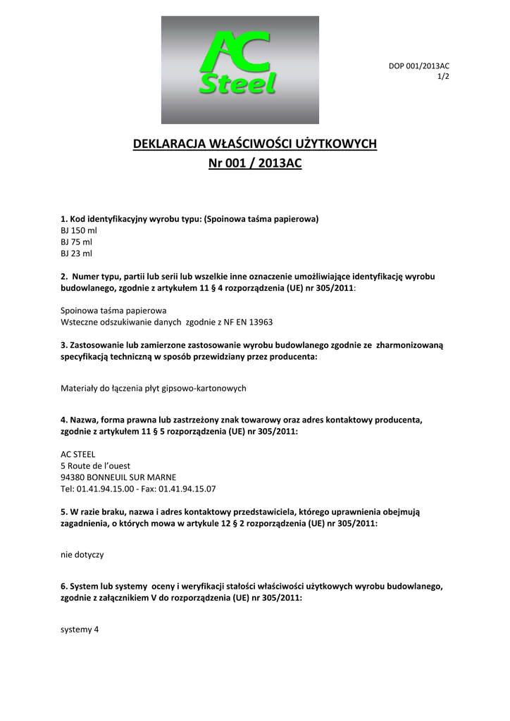 DOP 001/2013AC 1/2 DEKLARACJA WŁAŚCIWOŚCI UŻYTKOWYCH Nr 001 / 2013AC 1. Kod identyfikacyjny wyrobu typu: (Spoinowa taśma papierowa) BJ 150 ml BJ 75 ml BJ 23 ml 2. Numer typu, partii lub serii lub wszelkie inne oznaczenie umożliwiające identyfikację wyrobu budowlanego, zgodnie z artykułem 11 § 4 rozporządzenia (UE) nr 305/2011: Spoinowa taśma papierowa Wsteczne odszukiwanie danych zgodnie z NF EN 13963 3. Zastosowanie lub zamierzone zastosowanie wyrobu budowlanego zgodnie ze zharmonizowaną specyfikacją techniczną w sposób przewidziany przez producenta: Materiały do łączenia płyt gipsowo-kartonowych 4. Nazwa, forma prawna lub zastrzeżony znak towarowy oraz adres kontaktowy producenta, zgodnie z artykułem 11 § 5 rozporządzenia (UE) nr 305/2011: AC STEEL 5 Route de l’ouest 94380 BONNEUIL SUR MARNE Tel: 01.41.94.15.00 - Fax: 01.41.94.15.07 5. W razie braku, nazwa i adres kontaktowy przedstawiciela, którego uprawnienia obejmują zagadnienia, o których mowa w artykule 12 § 2 rozporządzenia (UE) nr 305/2011: nie dotyczy 6. System lub systemy oceny i weryfikacji stałości właściwości użytkowych wyrobu budowlanego, zgodnie z załącznikiem V do rozporządzenia (UE) nr 305/2011: systemy 4 DOP 001/2013AC 2/2 7. W przypadku deklaracji właściwości użytkowych dla wyrobu budowlanego objętego zharmonizowaną normą: Według NF EN 13963 i sprawozdania z badań nr EEM 07 26007807 8. W przypadku deklaracji właściwości użytkowych dla wyrobu budowlanego, dla którego europejska ocena techniczna została wydana: nie dotyczy 9. Deklarowane właściwości: Główne dane techniczne Reakcja na ogień Wytrzymałość na zginanie F Zharmonizowane specyfikacje techniczne EN 13963 : 2005-05 NPD EN 13963 : 2005-05 Właściwości 10. Właściwości użytkowe produktu określonego w punkcie 1 i 2 są zgodne z deklarowanymi właściwościami podanymi w punkcie 9. Niniejsza deklaracja właściwości użytkowych wydana zostaje na wyłączną odpowiedzialność producenta podanego w punkcie 4. Podpisał za i w imieniu producenta: Thierry AZERAD General Manager Bonneuil sur Marne 01 lipca 2013 Podpis:
