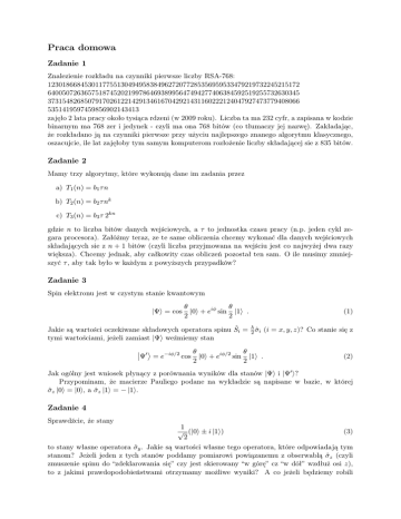Praca domowa Zadanie 1 Znalezienie rozkładu na czynniki pierwsze liczby RSA-768: 123018668453011775513049495838496272077285356959533479219732245215172 640050726365751874520219978646938995647494277406384592519255732630345 373154826850791702612214291346167042921431160222124047927473779408066 5351419597459856902143413 zajęło 2 lata pracy około tysiąca rdzeni (w 2009 roku). Liczba ta ma 232 cyfr, a zapisana w kodzie binarnym ma 768 zer i jedynek - czyli ma ona 768 bitów (co tłumaczy jej nazwę). Zakładając, że rozkładano ją na czynniki pierwsze przy użyciu najlepszego znanego algorytmu klasycznego, oszacujcie, ile lat zajęłoby tym samym komputerom rozłożenie liczby składającej sie z 835 bitów. Zadanie 2 Mamy trzy algorytmy, które wykonują dane im zadania przez a) T1 (n) = b1 τ n b) T2 (n) = b2 τ nk c) T3 (n) = b3 τ 2kn gdzie n to liczba bitów danych wejściowych, a τ to jednostka czasu pracy (n.p. jeden cykl zegara procesora). Załóżmy teraz, ze te same obliczenia chcemy wykonać dla danych wejściowych składających sie z n + 1 bitów (czyli liczba przyjmowana na wejściu jest co najwyżej dwa razy większa). Chcemy jednak, aby całkowity czas obliczeń pozostał ten sam. O ile musimy zmniejszyć τ , aby tak było w każdym z powyższych przypadków? Zadanie 3 Spin elektronu jest w czystym stanie kwantowym |Ψi = cos θ θ |0i + eiφ sin |1i . 2 2 (1) Jakie są wartości oczekiwane składowych operatora spinu Ŝi = ~2 σ̂i (i = x, y, z)? Co stanie się z tymi wartościami, jeżeli zamiast |Ψi weźmiemy stan 0 Ψ = e−iφ/2 cos θ |0i + eiφ/2 sin θ |1i . 2 2 (2) Jak ogólny jest wniosek płynący z porównania wyników dla stanów |Ψi i |Ψ0 i? Przypominam, że macierze Pauliego podane na wykładzie są napisane w bazie, w której σ̂z |0i = |0i, a σ̂z |1i = − |1i. Zadanie 4 Sprawdźcie, że stany 1 √ (|0i ± i |1i) 2 (3) to stany własne operatora σ̂y . Jakie są wartości własne tego operatora, które odpowiadają tym stanom? Jeżeli jeden z tych stanów poddamy pomiarowi powiązanemu z obserwablą σ̂z (czyli zmuszenie spinu do “zdeklarowania się” czy jest skierowany “w górę” cz “w dół” wzdłuż osi z), to z jakimi prawdopodobieństwami otrzymamy możliwe wyniki? A co jeżeli będziemy robili pomiar związany z obserwablą σ̂x ? Wynik można łatwo zgadnąć - ale czy potraficie go uzasadnić (wskazówki: reguła Borna i iloczyn skalarny pomiędzy stanami własnymi σ̂x i σ̂y . Dodatkowe zadanie dla chętnych (i lubiących algebrę liniową): jak uzyskać powyższe stany? Należy zdiagonalizować macierz σ̂y , czyli najpierw sprawdzić, dla jakich λ istnieje rozwiązanie równania 0 −i a a =λ , (4) i 0 b b a następnie rozwiązać to równanie na a i b dla znalezionych dozwolonych wartości λ. Wskazówka: powyższe równanie można zapisać jako a M̂ =0 b (5) gdzie macierz M̂ jest dana przez −λ −i i −λ . (6) Warunkiem koniecznym na istnienie rozwiązania takiego problemu jest zerowanie się wyznacznika macierzy M̂ .