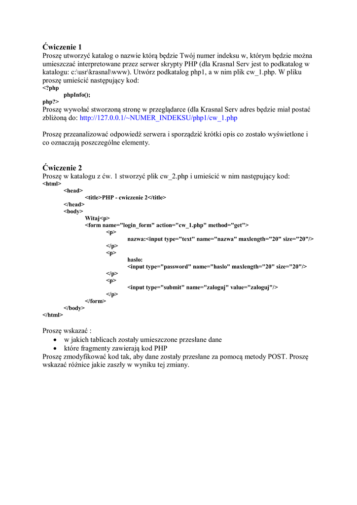 Ćwiczenie 1 Proszę utworzyć katalog o nazwie którą będzie Twój numer indeksu w, którym będzie można umieszczać interpretowane przez serwer skrypty PHP (dla Krasnal Serv jest to podkatalog w katalogu: c:\usr\krasnal\www). Utwórz podkatalog php1, a w nim plik cw_1.php. W pliku proszę umieścić następujący kod: <?php phpInfo(); php?> Proszę wywołać stworzoną stronę w przeglądarce (dla Krasnal Serv adres będzie miał postać zbliżoną do: http://127.0.0.1/~NUMER_INDEKSU/php1/cw_1.php Proszę przeanalizować odpowiedź serwera i sporządzić krótki opis co zostało wyświetlone i co oznaczają poszczególne elementy. Ćwiczenie 2 Proszę w katalogu z ćw. 1 stworzyć plik cw_2.php i umieścić w nim następujący kod: <html> <head> <title>PHP - cwiczenie 2</title> </head> <body> Witaj<p> <form name="login_form" action="cw_1.php" method="get"> <p> nazwa:<input type="text" name="nazwa" maxlength="20" size="20"/> </p> <p> hasło: <input type="password" name="haslo" maxlength="20" size="20"/> </p> <p> <input type="submit" name="zaloguj" value="zaloguj"/> </p> </form> </body> </html> Proszę wskazać : w jakich tablicach zostały umieszczone przesłane dane które fragmenty zawierają kod PHP Proszę zmodyfikować kod tak, aby dane zostały przesłane za pomocą metody POST. Proszę wskazać różnice jakie zaszły w wyniku tej zmiany.