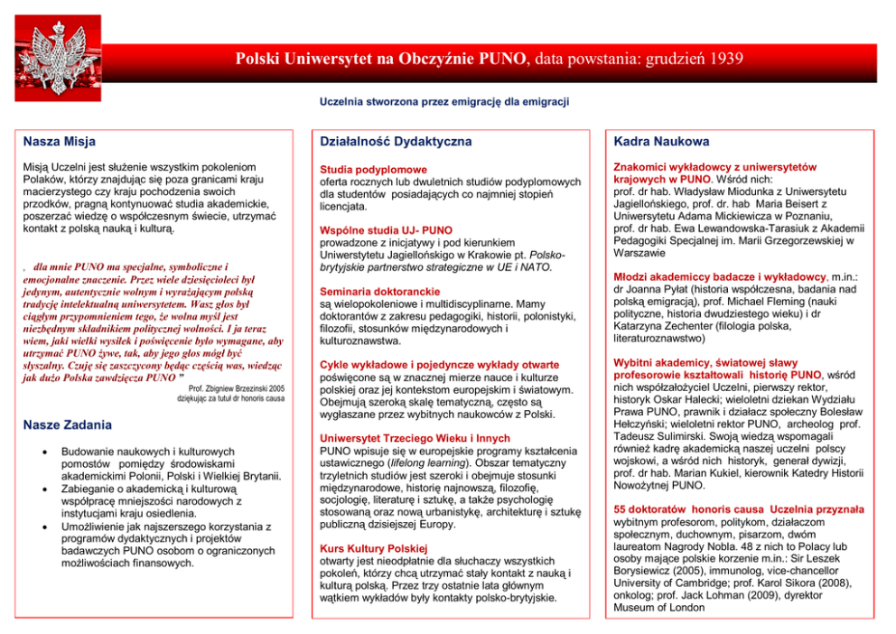 Polski Uniwersytet na Obczy nie PUNO, data powstania: grudzie 1939 Uczelnia stworzona przez emigracj dla emigracji Nasza Misja Dzia alno Misj Uczelni jest s enie wszystkim pokoleniom Polaków, którzy znajduj c si poza granicami kraju macierzystego czy kraju pochodzenia swoich przodków, pragn kontynuowa studia akademickie, poszerza wiedz o wspó czesnym wiecie, utrzyma kontakt z polsk nauk i kultur . Studia podyplomowe oferta rocznych lub dwuletnich studiów podyplomowych dla studentów posiadaj cych co najmniej stopie licencjata. „ dla mnie PUNO ma specjalne, symboliczne i emocjonalne znaczenie. Przez wiele dziesi cioleci by jedynym, autentycznie wolnym i wyra aj cym polsk tradycj intelektualn uniwersytetem. Wasz g os by ci ym przypomnieniem tego, e wolna my l jest niezb dnym sk adnikiem politycznej wolno ci. I ja teraz wiem, jaki wielki wysi ek i po wi cenie by o wymagane, aby utrzyma PUNO ywe, tak, aby jego g os móg by yszalny. Czuj si zaszczycony b c cz ci was, wiedz c jak du o Polska zawdzi cza PUNO ” Prof. Zbigniew Brzezinski 2005 dzi kuj c za tutu dr honoris causa Dydaktyczna Wspólne studia UJ- PUNO prowadzone z inicjatywy i pod kierunkiem Uniwerstytetu Jagiello skigo w Krakowie pt. Polskobrytyjskie partnerstwo strategiczne w UE i NATO. Seminaria doktoranckie wielopokoleniowe i multidiscyplinarne. Mamy doktorantów z zakresu pedagogiki, historii, polonistyki, filozofii, stosunków mi dzynarodowych i kulturoznawstwa. Cykle wyk adowe i pojedyncze wyk ady otwarte po wi cone s w znacznej mierze nauce i kulturze polskiej oraz jej kontekstom europejskim i wiatowym. Obejmuj szerok skal tematyczn , cz sto s wyg aszane przez wybitnych naukowców z Polski. Nasze Zadania Budowanie naukowych i kulturowych pomostów pomi dzy rodowiskami akademickimi Polonii, Polski i Wielkiej Brytanii. Zabieganie o akademick i kulturow wspó prac mniejszo ci narodowych z instytucjami kraju osiedlenia. Umo liwienie jak najszerszego korzystania z programów dydaktycznych i projektów badawczych PUNO osobom o ograniczonych mo liwo ciach finansowych. Uniwersytet Trzeciego Wieku i Innych PUNO wpisuje si w europejskie programy kszta cenia ustawicznego (lifelong learning). Obszar tematyczny trzyletnich studiów jest szeroki i obejmuje stosunki mi dzynarodowe, histori najnowsz , filozofi , socjologi , literatur i sztuk , a tak e psychologi stosowan oraz now urbanistyk , architektur i sztuk publiczn dzisiejszej Europy. Kurs Kultury Polskiej otwarty jest nieodp atnie dla s uchaczy wszystkich pokole , którzy chc utrzyma sta y kontakt z nauk i kultur polsk . Przez trzy ostatnie lata g ównym tkiem wyk adów by y kontakty polsko-brytyjskie. Kadra Naukowa Znakomici wyk adowcy z uniwersytetów krajowych w PUNO. W ród nich: prof. dr hab. W adys aw Miodunka z Uniwersytetu Jagiello skiego, prof. dr. hab Maria Beisert z Uniwersytetu Adama Mickiewicza w Poznaniu, prof. dr hab. Ewa Lewandowska-Tarasiuk z Akademii Pedagogiki Specjalnej im. Marii Grzegorzewskiej w Warszawie odzi akademiccy badacze i wyk adowcy, m.in.: dr Joanna Py at (historia wspó czesna, badania nad polsk emigracj ), prof. Michael Fleming (nauki polityczne, historia dwudziestego wieku) i dr Katarzyna Zechenter (filologia polska, literaturoznawstwo) Wybitni akademicy, wiatowej s awy profesorowie kszta towali histori PUNO, w ród nich wspó za yciel Uczelni, pierwszy rektor, historyk Oskar Halecki; wieloletni dziekan Wydzia u Prawa PUNO, prawnik i dzia acz spo eczny Boles aw He czy ski; wieloletni rektor PUNO, archeolog prof. Tadeusz Sulimirski. Swoj wiedz wspomagali równie kadr akademick naszej uczelni polscy wojskowi, a w ród nich historyk, genera dywizji, prof. dr hab. Marian Kukiel, kierownik Katedry Historii Nowo ytnej PUNO. 55 doktoratów honoris causa Uczelnia przyzna a wybitnym profesorom, politykom, dzia aczom spo ecznym, duchownym, pisarzom, dwóm laureatom Nagrody Nobla. 48 z nich to Polacy lub osoby maj ce polskie korzenie m.in.: Sir Leszek Borysiewicz (2005), immunolog, vice-chancellor University of Cambridge; prof. Karol Sikora (2008), onkolog; prof. Jack Lohman (2009), dyrektor Museum of London
