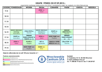GRAFIK FITNESS OD 07.09.2015 r. organizator zastrzega sobie prawo do zmian i zawieszenia zajęć ze względu na niską frekwencję GODZIN PONIEDZIAŁEK WTOREK ŚRODA CZWARTEK PIĄTEK SOBOTA NIEDZIELA JOGA ●○ Karol 9.15 10.15 11.15 15.15 ZDROWY KRĘGOSŁUP/ 16.15 stretching● Marcelina CELLU STOP●● Gocha ZDROWY KRĘGOSŁUP/ funkcjonal ●● Marcelina SHAPE ●● Paulina 17.15 SHAPE ●● Marcelina TRENING FUNKCJONALNY & TABATA ●● Ala JOGA ●○ Karol BODY PUMP ●●● Paulina 18.15 JOGA ●○ Karol PILATES ● Magda ABT ●● Agnieszka TABATA & SUPER BRZUCH ●●● Ala BODY PUMP ●●● Paulina ZUMBA ●●○ Ewa 19.15 ZDROWY KRĘGOSŁUP ● Gocha TRENING FUNKCJONALNY ●● Ala CELLU STOP ●● Gocha Zajęcia odbywają się na sali 103 przy basenie nr 1 Poziomy zaawansowania: ● ●○ ●● ●●○ ●●● Podstawowy Podstawowy/ Średniozaawansowany Średniozaawansowany Średniozaawansowany/Zaawansowany Zaawansowany Kontakt: ul. Teatralna 10-12, 50-055 Wrocław e-mail: [email protected] tel. 71 348 80 19 lub 37, fax 71 343 89 87 ZDROWY KRĘGOSŁUP ● Trening dla każdego od seniora do ucznia, również dla kobiet w ciąży, cel: niwelowanie bólów kręgosłupa, korekcja i kompensacja postawy ciała; intensywność niska. Odmiany: ZDROWY KRĘGOSŁUP/ STRETCHING ZDROWY KRĘGOSŁUP/ funktional PILATES ● zajęcia dla każdego; cel: stworzenie równowagi w ciele, zwany też treningiem "dobrego samopoczucia" wpływa na to jak wygląda ciało, jak je odczuwamy i jak ono pracuje, ćwiczenia bez stresu i męki przy dźwiękach spokojnej muzyki wprowadzają w dobry nastrój i poprawiają wygląd ciała, jedna z najbezpieczniejszych form fitness; intensywność: niska do umiarkowanej JOGA ●○ Zajęcia dedykowane każdemu, bez względu na wiek i poziom zaawansowania. Cel: poprawa równowagi i koncentracji, wzmocnienie i uelastycznienie ciała, polepszenie jakości oddechu. Na zajęciach wykonujemy sekwencje asan, ucząc się zarówno precyzyjnego wykonania pojedynczych pozycji, jak i płynnych przejść pomiędzy poszczególnymi asanami. Dostępne na sali pomoce, używamy wedle indywidualnych potrzeb. Intensywność: umiarkowana. SHAPE ●● Dla osób aktywnych, przyzwyczajonych do zajęć ruchowych; cel: rzeźbienie całego ciała (ramiona, klatka piersiowa, brzuch, plecy, uda, pośladki) oraz podnoszenie wytrzymałości siłowej poprzez zaangażowanie górnych i dolnych partii ciała, z zastosowaniem dostępnych, różnorodnych sprzętów fitness; intensywność: umiarkowana ABT ●● Zajęcia dla początkujących; cel: modelowanie i wzmacnianie dolnych partii ciała (brzuch, biodra, uda, pośladki) bez przyborów, nauka podstawowych kroków fitness i techniki wykonywania ćwiczeń wzmacniających; intensywność: niska do umiarkowanej CELLU STOP ●● Zajęcia dla osób przyzwyczajonych do treningów fitness; cel: redukcja cellulitu z okolic brzucha, ud i pośladków poprzez dużą liczbę powtórzeń ćwiczeń, ćwiczenia połączone w proste układy, wykonywane bez przyborów, intensywność: umiarkowana do wysokiej TRENING FUNKCJONALNY ●● Trening dla osób przyzwyczajonych do wysiłku, cel: przywrócenie równowagi i utraconych funkcji ciała, wzmocnienie prawidłowych wzorców ruchowych poprzez ćwiczenia angażujące całe ciało, modelowanie sylwetki, poprawa wydolności organizmu i wytrzymałości siłowej, intensywność: umiarkowana do wysokiej SUPER BRZUCH ●● Zajęcia przeznaczone dla osób przyzwyczajonych do wysiłku; cel: modelowanie mięśni brzucha oraz wzmacnianie tzw. "środka", budowanie gorsetu mieśniowego, stabilizacja kręgosłupa, trening w oparciu o serie intensywnych ćwiczeń skierowanych na brzuch i plecy w okolicy lędźwiowej przy użyciu dostępnych przyborów lub z oporem własnego ciała; intensywność: umiarkowana ZUMBA ●●○ BODY PUMP ●●● TABATA ●●● Zajęcia dla osób przyzwyczajonych do intensywnego wysiłku fizycznego, lubiących głośną latynoamerykańską muzykę i mających poczucie rytmu, cel: wprawienie w dobry nastrój, kształtowanie sylwetki i wytrzymałości całego ciała, intensywność: wysoka Zajęcia dla osób przyzwyczajonych do wysiłku fizycznego zarówno dla kobiet jak i mężczyzn; cel: poprawa wytrzymałości siłowej oraz modelowanie ciała z wykorzystaniem lekkiej sztangi, gdzie obciążenie dopasowane jest indywidualnie do każdego ćwiczącego, intensywność: wysoka Zajęcia dla osób uprawiających już różne formy aktywności fizycznej; cel: przyspieszenie metabolizmu, intensywne spalanie kalorii poprzez wykonywanie 8 serii ćwiczeń, każda po 20 sekund, z maksymalną intensywnością, ćwiczenia zawarte w treningu angażują jak najwięcej grup mieśniowych, są funkcjonalne; intensywność: wysoka Kontakt: ul. Teatralna 10-12, 50-055 Wrocław e-mail: [email protected] tel. 71 348 80 19 lub 37, fax 71 343 89 87