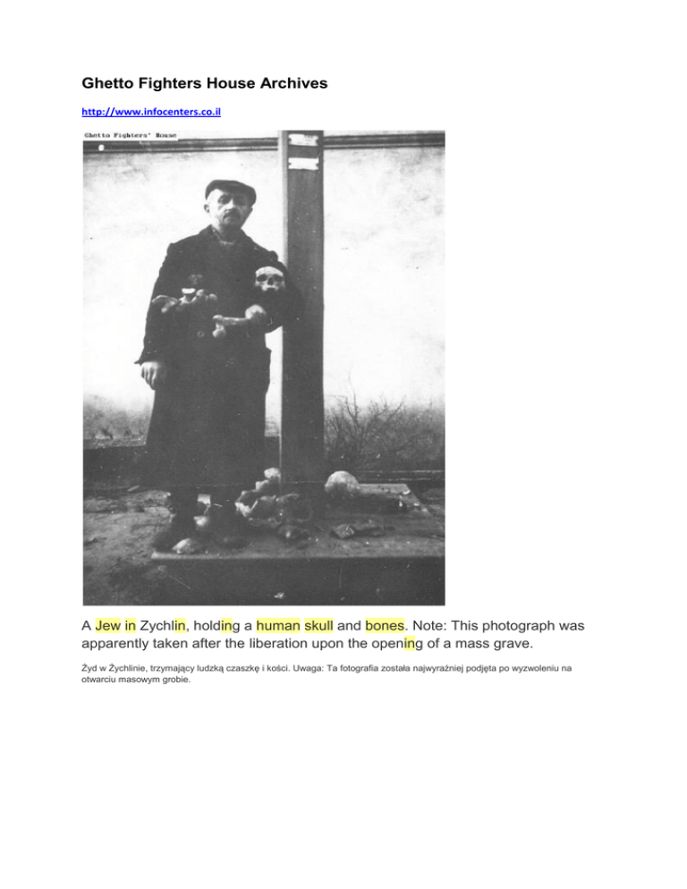 Ghetto Fighters House Archives http://www.infocenters.co.il A Jew in Zychlin, holding a human skull and bones. Note: This photograph was apparently taken after the liberation upon the opening of a mass grave. Żyd w Żychlinie, trzymający ludzką czaszkę i kości. Uwaga: Ta fotografia została najwyraźniej podjęta po wyzwoleniu na otwarciu masowym grobie.