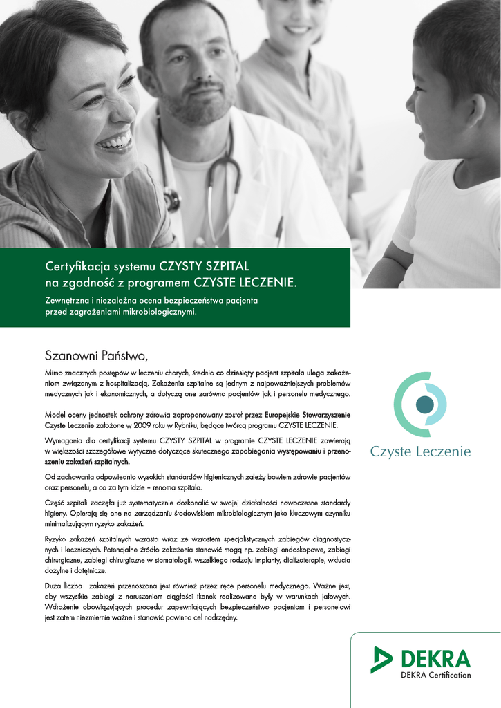 Certyfikacja systemu CZYSTY SZPITAL na zgodność z programem CZYSTE LECZENIE. Zewnętrzna i niezależna ocena bezpieczeństwa pacjenta przed zagrożeniami mikrobiologicznymi. Szanowni Państwo, Mimo znacznych postępów w leczeniu chorych, średnio co dziesiąty pacjent szpitala ulega zakażeniom związanym z hospitalizacją. Zakażenia szpitalne są jednym z najpoważniejszych problemów medycznych jak i ekonomicznych, a dotyczą one zarówno pacjentów jak i personelu medycznego. Model oceny jednostek ochrony zdrowia zaproponowany został przez Europejskie Stowarzyszenie Czyste Leczenie założone w 2009 roku w Rybniku, będące twórcą programu CZYSTE LECZENIE. Wymagania dla certyfikacji systemu CZYSTY SZPITAL w programie CZYSTE LECZENIE zawierają w większości szczegółowe wytyczne dotyczące skutecznego zapobiegania występowaniu i przenoszeniu zakażeń szpitalnych. Od zachowania odpowiednio wysokich standardów higienicznych zależy bowiem zdrowie pacjentów oraz personelu, a co za tym idzie – renoma szpitala. Część szpitali zaczęła już systematycznie doskonalić w swojej działalności nowoczesne standardy higieny. Opierają się one na zarządzaniu środowiskiem mikrobiologicznym jako kluczowym czynniku minimalizującym ryzyko zakażeń. Ryzyko zakażeń szpitalnych wzrasta wraz ze wzrostem specjalistycznych zabiegów diagnostycznych i leczniczych. Potencjalne źródło zakażenia stanowić mogą np. zabiegi endoskopowe, zabiegi chirurgiczne, zabiegi chirurgiczne w stomatologii, wszelkiego rodzaju implanty, dializoterapie, wkłucia dożylne i dotętnicze. Duża liczba zakażeń przenoszona jest również przez ręce personelu medycznego. Ważne jest, aby wszystkie zabiegi z naruszeniem ciągłości tkanek realizowane były w warunkach jałowych. Wdrożenie obowiązujących procedur zapewniających bezpieczeństwo pacjentom i personelowi jest zatem niezmiernie ważne i stanowić powinno cel nadrzędny. DEKRA Certification Środowisko mikrobiologiczne szpitala (powietrze, woda, powierzchnie podłóg i urządzeń) stanowi istotne źródło i sprzyja zakażeniom. Rezerwuarem najgroźniejszych zakażeń mogą być również nawilżacze, urządzenia wentylacyjne, bronchoskopy, endoskopy, woda bieżąca, żywność, leki oraz odpady medyczne. Duża liczba zakażeń przenoszona jest również przez ręce personelu medycznego. Ważne jest, aby wszystkie zabiegi z naruszeniem ciągłości tkanek realizowane były w warunkach jałowych. Wdrożenie obowiązujących procedur zapewniających bezpieczeństwo pacjentom i personelowi jest zatem niezmiernie ważne i stanowić powinno cel nadrzędny. Od czego zależy bezpieczeństwo pacjenta w szpitalach? Do podstawowych kryteriów oceny w programie CZYSTE LECZENIE należą między innymi: »» Zarządzanie personelem / liczba i kwalifikacje zatrudnionego personelu. »» Świadomość i szkolenia personelu. »» Procedury udzielania świadczeń zdrowotnych, zapewniające zapobieganie zakażeniom szpitalnym oraz minimalizujące szerzenie się czynników alarmowych. »» Warunki lokalowe. »» Żywienie chorych. »» Zarządzanie bezpieczeństwem i higieną pracy. »» Analiza zagrożeń biologicznych. »» Procedura postępowania w przypadku zranienia lub kontaktu z materiałem potencjalnie zagrożonym. »» Stosowanie odzieży ochronnej dla personelu i pacjenta. »» Mycie i dezynfekcja rąk. »» Identyfikacja i identyfikowalność wyrobów, sprzętu i narzędzi. »» Dekontaminacja narzędzi i sprzętu medycznego. »» Procedura zakupu usług (np. posiłki dla pacjentów, sprzątanie, usługi medyczne). »» Nadzorowanie infrastruktury zapewniającej higienę. »» Nadzorowanie wyrobów i usług niezgodnych z wymaganiami systemu CZYSTY SZPITAL. »» Działania korygujące i zapobiegawcze. Certyfikat CZYSTY SZPITAL w programie CZYSTE LECZENIE jest prestiżowym wyróżnieniem szpitali dbających o minimalizację ryzyka przenoszenia zakażeń. Certyfikacja realizowana jest przez bezstronną i niezależną w decyzjach, jednostkę certyfikacyjną DEKRA Certification Sp. z o.o. zajmującą czołową pozycję na polskim rynku certyfikacji jednostek ochrony zdrowia. Auditom w zakresie zarządzania jakością przeprowadzonym przez DEKRA Certification poddało się już ponad 400 organizacji związanych ze służbą zdrowia. Proces certyfikacji polega na przeprowadzeniu przeglądu organizacji w oparciu o konkretne standardy i określeniu poziomu ich wdrożenia. W oparciu o wyniki oceny zostaje podjęta decyzja o przyznaniu certyfikatu i umieszczeniu organizacji na stronie internetowej CZYSTE LECZENIE jako szpitala certyfikowanego. Decyzję o przyznaniu certyfikatu podejmuje Gremium Certyfikacyjne na podstawie ustalonych wymagań i po przeprowadzeniu określonej procedury oceniającej. Europejskie Stowarzyszenie Czyste Leczenie specjalizuje się również w realizacji usług doradczych związanych z doskonaleniem nowoczesnych standardów higieny. Zakres usług doradczych może być zróżnicowany w zależności od potrzeb poszczególnych organizacji. Może obejmować szkolenia i warsztaty dla personelu, współpracę przy opracowaniu niezbędnych procedur oraz przygotowanie do certyfikacji. Zachęcam Państwa do uczestnictwa w programie CZYSTE LECZENIE, który dzięki zapewnieniu najwyższych standardów świadczeń i bezpieczeństwa pozwoli zdobyć zaufanie pacjentów i personelu, zapewni Państwa placówce wysoką pozycję na rynku usług medycznych oraz wyróżni Państwa działalność na tle innych szpitali. Z poważaniem, Kontakt: e-mail: [email protected] Georg Jankowski Prezes Zarządu DEKRA Certification DEKRA Certification Sp. z o.o. Ul. Krakowska 19-23 50-424 Wrocław Tel.: +48.71.780-47-77 Fax: +48.71.780-47-79 www.dekra-certification.pl www.czysteleczenie.pl