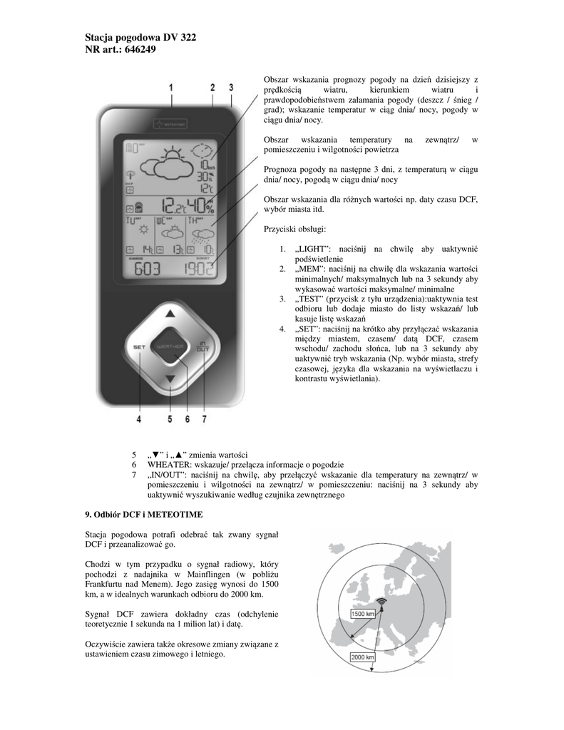 Stacja pogodowa DV 322 NR art.: 646249 Obszar wskazania prognozy pogody na dzień dzisiejszy z prędkością wiatru, kierunkiem wiatru i prawdopodobieństwem załamania pogody (deszcz / śnieg / grad); wskazanie temperatur w ciąg dnia/ nocy, pogody w ciągu dnia/ nocy. Obszar wskazania temperatury na pomieszczeniu i wilgotności powietrza zewnątrz/ w Prognoza pogody na następne 3 dni, z temperaturą w ciągu dnia/ nocy, pogodą w ciągu dnia/ nocy Obszar wskazania dla różnych wartości np. daty czasu DCF, wybór miasta itd. Przyciski obsługi: 1. 2. 3. 4. 5 6 7 „LIGHT”: naciśnij na chwilę aby uaktywnić podświetlenie „MEM”: naciśnij na chwilę dla wskazania wartości minimalnych/ maksymalnych lub na 3 sekundy aby wykasować wartości maksymalne/ minimalne „TEST” (przycisk z tyłu urządzenia):uaktywnia test odbioru lub dodaje miasto do listy wskazań/ lub kasuje listę wskazań „SET”: naciśnij na krótko aby przyłączać wskazania między miastem, czasem/ datą DCF, czasem wschodu/ zachodu słońca, lub na 3 sekundy aby uaktywnić tryb wskazania (Np. wybór miasta, strefy czasowej, języka dla wskazania na wyświetlaczu i kontrastu wyświetlania). „▼” i „▲” zmienia wartości WHEATER: wskazuje/ przełącza informacje o pogodzie „IN/OUT”: naciśnij na chwilę, aby przełączyć wskazanie dla temperatury na zewnątrz/ w pomieszczeniu i wilgotności na zewnątrz/ w pomieszczeniu: naciśnij na 3 sekundy aby uaktywnić wyszukiwanie według czujnika zewnętrznego 9. Odbiór DCF i METEOTIME Stacja pogodowa potrafi odebrać tak zwany sygnał DCF i przeanalizować go. Chodzi w tym przypadku o sygnał radiowy, który pochodzi z nadajnika w Mainflingen (w pobliżu Frankfurtu nad Menem). Jego zasięg wynosi do 1500 km, a w idealnych warunkach odbioru do 2000 km. Sygnał DCF zawiera dokładny czas (odchylenie teoretycznie 1 sekunda na 1 milion lat) i datę. Oczywiście zawiera także okresowe zmiany związane z ustawieniem czasu zimowego i letniego. Stacja pogodowa rozpoznaje sygnał nadajnika znaczników czasu „HGB” w Szwajcarii kompatybilny z DCF. Cechą szczególną stacji jest analiza tak zwanego sygnału „METEOTIME”, który jest zawarty w sygnale DCF/HGB. Sygnał „METEOTIME” zawiera dane prognozy pogody dla 90 róznych regionów Europy. Dla 60 regionów transferowane są dane dotyczące aktualnego dnia i kolejnych trzech dni, a dla 30 regionów dane dla danego i następnego dnia. Transfer danych dla prognozy pogody dokonywany przy pomocy sygnału radiowego z nadajnika DCF lub HGB jest z powodu stosowanej technologii relatywnie wolny, dlatego też zanim stacja pogodowa odbierze wszystkie dane pogodowe mogą minąć 24 godziny. Symbol w aktualnym sektorze wskazywania wskaże status odbioru, patrz kolejna strona. = udany odbiór dzisiejszych informacji pogodowych (w innym przypadku ) = udany odbiór sygnału METEOTIME (w innym przypadku ) = udany odbiór informacji pogodowych na kolejny dzień (w innym przypadku ) = udany odbiór informacji pogodowych na drugi dzień (w innym przypadku ) = udany odbiór dzisiejszych informacji pogodowych dla 3 dni. Właściwy wybór miejsca ustawienia jest decydujący dla odbioru danych radiowych, ponieważ odbiór danych pogodowych odbywa się przez całą godzinę. Nie ustawiaj stacji pogodowej w pobliżu urządzeń elektrycznych/ elektronicznych oraz kabli, gniazd wtykowych lub elementów metalowych. Zachowaj odstęp minimum 1 metra! Złego odbioru można się spodziewać także np. w przypadku okien z metalizowanego szkła izolacyjnego, konstrukcji stalowej, powlekanych specjalnych tapet lub piwnicach. Dla 30 regionów, w których transferowane są dane pogodowe na dziś i jutro, w kolejnych następujących po sobie dniach w obszarze wskazywania dla temperatury dnia pojawią się jedynie dwie kreski „—„. Po uruchomieniu (rozdział 10) i wyborze miejsca ustawienia / montażu (rozdział 11) można przy pomocy przycisku „TEST” na tylnej stronie można wykonać test odbioru dla sygnału „METEOTIME”, patrz rozdział 12 d). Pozycja dla 90 obszarów pogodowych (powiększenie przekroju dla Europy Środkowej znajduje się na kolejnej stronie): 10. Uruchomienie a) Informacje ogólne Pamiętaj: Włóż najpierw baterie do czujnika zewnętrznego, a dopiero potem do stacji pogodowej. Jeśli czynności zostaną wykonane w innej kolejności, może się zdarzyć, że stacja pogodowa nie rozpozna czujnika zewnętrznego. W takim przypadku może zostać wykonane ręczne wyszukiwanie według czujnika zewnętrznego. Jeśli chcesz wypróbować stację pogodową i czujnik zewnętrzny w przypadku pierwszego uruchomienia np. w pokoju, wówczas nie powinieneś kłaść czujnika zewnętrznego w pobliżu stacji pogodowej. W przeciwnym razie ze względu na interferencje radiowe mogą wystąpić problemy z odbiorem. Zachowaj odstęp co najmniej 1 metra między stacją pogodową a czujnikiem zewnętrznym. Dzięki temu testowi funkcjonowania upewnisz się, że późniejsze problemy z odbiorem należy powiązać z umieszczeniem stacji pogodowej i czujnika zewnętrznego. Zakres na wolnej przestrzeni przyjmuje wartość do 30 m (bez zakłóceń, bezpośredni kontakt czujnika zewnętrznego i stacji pogodowej). Efektywny możliwy do osiągnięcia zakres w budynkach jest naturalnie mniejszy i wynosi 10-20 m, zależnie od miejsca ustawienia. Zastosuj się do rozdziału „zasięg”. b) uruchomienie czujnika zewnętrznego • • • Otwórz pojemnik na baterie czujnika zewnętrznego, odkręcając 4 śruby znajdujące się z tyłu, przy pomocy przeznaczonego do tego celu śrubokręta Następnie należy włożyć dwie baterie typu AAA zgodnie z ich biegunowością (Plus/ + i Minus -) Nałóż ponownie wieko pojemnika na baterie i dokręć je. c) Uruchomienie stacji pogodowej • Otwórz pojemnik na baterie z tyłu stacji pogodowej • Włóż do pojemnika na baterie cztery baterie typu AA/Mignon zgodnie z biegunowością (Plus/ + i M
