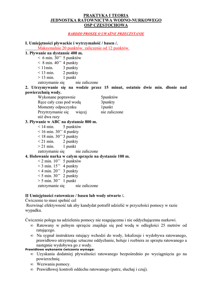 PRAKTYKA I TEORIA JEDNOSTKA RATOWNICTWA WODNO-NURKOWEGO OSP CZĘSTOCHOWA BARDZO PROSZĘ O UWAŻNE PRZECZYTANIE I. Umiejętności pływackie i wytrzymałość / basen /. Maksymalnie 20 punktów, zaliczenie od 12 punktów. 1. Pływanie na dystansie 400 m. < 6 min. 30’’ 5 punktów < 8 min. 40’’ 4 punkty < 11min. 3 punkty < 13 min. 2 punkty > 13 min. 1 punkt zatrzymanie się nie zaliczone 2. Utrzymywanie się na wodzie przez 15 minut, ostatnie dwie min. dłonie nad powierzchnią wody. Wykonane poprawnie 5punktów Ręce cały czas pod wodą 3punkty Momenty odpoczynku 1punkt Przytrzymanie się więcej nie zaliczone niż dwa razy 3. Pływanie w ABC na dystansie 800 m. < 14 min. 5 punktów < 16 min. 30’’ 4 punkty < 18 min. 30’’ 3 punkty < 21 min. 2 punkty > 21 min. 1 punkt zatrzymanie się nie zaliczone 4. Holowanie nurka w całym sprzęcie na dystansie 100 m. < 2 min. 10’’ 5 punktów < 3 min. 15’’ 4 punkty < 4 min. 20’’ 3 punkty < 5 min. 30’’ 2 punkty > 5 min. 30’’ 1 punkt zatrzymanie się nie zaliczone II Umiejętności ratownicze / basen lub wody otwarte /. Ćwiczenie to musi spełnić cel Rozwinąć efektywność tak aby kandydat potrafił udzielić w przyszłości pomocy w razie wypadku. Ćwiczenie polega na udzieleniu pomocy nie reagującemu i nie oddychającemu nurkowi. • Ratowany w pełnym sprzęcie znajduje się pod wodą w odległości 25 metrów od ratującego. • Na sygnał instruktora ratujący wchodzi do wody, lokalizuje i wydobywa ratowanego, prawidłowo utrzymując sztuczne oddychanie, holuje i rozbiera ze sprzętu ratowanego a następnie wydobywa go z wody. Prawidłowe wykonanie ćwiczenia wymaga: • Uzyskania dodatniej pływalności ratowanego bezpośrednio po wyciągnięciu go na powierzchnię. • Wezwania pomocy. • Prawidłowej kontroli oddechu ratowanego (patrz, słuchaj i czuj). • Wykonania dwóch początkowych wydechów przy poprawnie udrożnionych drogach oddechowych. • Prowadzenia efektywnej wentylacji ratowanego, bez zbędnych przerw. • Poprzedzenia każdej przerwy w wentylacji dwoma wolnymi wydechami. • Wykonania całego ćwiczenia bez pomocy innych osób (poza sytuacją gdy możliwości fizyczne ratującego lub okoliczności wyjścia wymagały by pomocy) III. Umiejętności nurkowe / basen /. Ta część stawia sobie dwa cele: zweryfikowanie czy kandydat potrafi wykonać poprawnie podstawowe ćwiczenia nurkowe Część I Rozwinięcie umiejętności demonstracyjnych na przykładzie ćwiczenia: zdjęcie i założenie maski. minimum 4 punkty. Celem ćwiczenie jest wykonanie go tak aby patrzący mogli zauważyć kolejne kroki i krytyczne momenty ćwiczenia. Kryteria oceny: 1. Kandydat nie jest w stanie wykonać ćwiczenia. 2. Ćwiczenie wykonane z widoczną trudnością lub błędem. 3. Ćwiczenie wykonane poprawnie ale zbyt szybko aby przedstawić jego detale. 4. Ćwiczenie wykonane poprawnie i wystarczająco powoli aby przedstawić jego detale. 5. Ćwiczenie wykonane poprawnie, powoli i z podkreśleniem kluczowych czynności. Część II Wykonanie ćwiczeń ocenianych w skali od 1-5 punktów. Każde należy wykonać na minimum 3 p. suma punktów minimum 84 p. 1. Przygotowanie, zmontowanie i rozmontowanie sprzętu 2. Kontrola sprzętu partnera przed nurkowaniem 3. Skok na nogi /3 sposoby/ 4. Sprawdzenie pływalności na powierzchni 5. Prawidłowe zanurzenie zanurzenie + (znaki nurkowe ) 6. Zdjęcie i założenie pasa balastowego pod wodą 7. Balansowanie na płetwach /pływalność/ 8. Zdjęcie i założenie sprzętu pod wodą 9. Utrzymywanie stałej pływalności bez ruchu 10. Prawidłowe wynurzenie + (znaki nurkowe ) 11. Wymiana automatu na fajkę 12. Oddychanie partnerskie-w miejscu (podający i biorący) 13. Oddychanie partnerskie-płynąc (podający) 14. Zdjęcie, ubranie i przedmuchanie maski 15. Oddychanie partnerskie-płynąc (biorący) 16. Oddychanie z alternatywnego źródła powietrza stacjonarnie 17. Oddychanie ze wzbudzonego automatu na głębokości 2–3 m 18. Kontrolowane wynurzenie awaryjne ( z automatem w ustach) 19. Kontrola pływalności w skafandrze, pasie balastowym i w sprzęcie podstawowym 20. Pływanie na dystansie 25 m pod wodą w ABC / z zatrzymanym oddechem / 21. Pływanie na dystansie 25 m pod wodą bez płetw / z zatrzymanym oddechem / 22. Nurkowanie z zatrzymanym oddechem na głębokość 7 m 23. Poprawne założenie i zdjęcie sprzętu nurkowego na powierzchni wody 24. Poszukiwanie ustnika automatu oddechowego dwoma sposobami 25. Poszukiwanie manometru , odczyt oraz odpowiedź (ile masz powietrza) 26. Nadawanie i odbieranie znaków nurkowych 27. Przepływanie w pełnym sprzęcie nurkowym dystansu 1000 m po powierzchni w czasie poniżej 50 minut 28.Kontrola prędkości wynurzania się ( 10 m / min ) / w pełnym sprzęcie nurkowym/ IV. WYDOBYWANIE NIEPRZYTOMNEGO PŁETWONURKA Z 15 M DO GŁĘBOKOŚCI 5 M 1. Bez użycia kamizelki ratunkowo-wypornościowej 2. Na kamizelce ratunkowo-wypornościowej ratującego 3. Na kamizelce ratunkowo-wypornościowej ratowanego WYPŁYWANIE BEZ PŁETW Z GŁĘBOKOŚCI 15 M DO GŁĘBOKOŚCI 5 M POSŁUGIWANIE SIĘ KOŁOWROTKIEM I BOJĄ DEKOMPRESYJNĄ POSZUKIWANIE I WYDOBYWANIE MAŁYCH PRZEDMIOTÓW 1. Oznakowanie terenu poszukiwań 2. Wybór techniki poszukiwań 3. Przygotowanie wyposażenia 4. Wybór techniki wydobywania 5.Wydobycie obiektu na brzeg lub przeniesienie w wyznaczone miejsce 6.Bezpieczeństwo podczas prac wydobywczych RATOWNICTWO PODWODNE 1. Wypływanie z głębokości 15 m do głębokości 5 m bez korzystania z automatu oddechowego 2. Wypływanie z partnerem z głębokości 15 m do głębokości 5 m z wykorzystaniem jednego automatu oddechowego 3. Wydobywanie nurka z głębokości 15 m bez użycia kamizelki ratunkowowypornościowej 4. Wydobywanie nurka z głębokości 15 m do głębokości 5 metrów przy użyciu jego kamizelki ratunkowo-wypornościowej 5.Wydobywanie nurka z głębokości 15 m przy użyciu własnej kamizelki ratunkowowypornościowej. RA