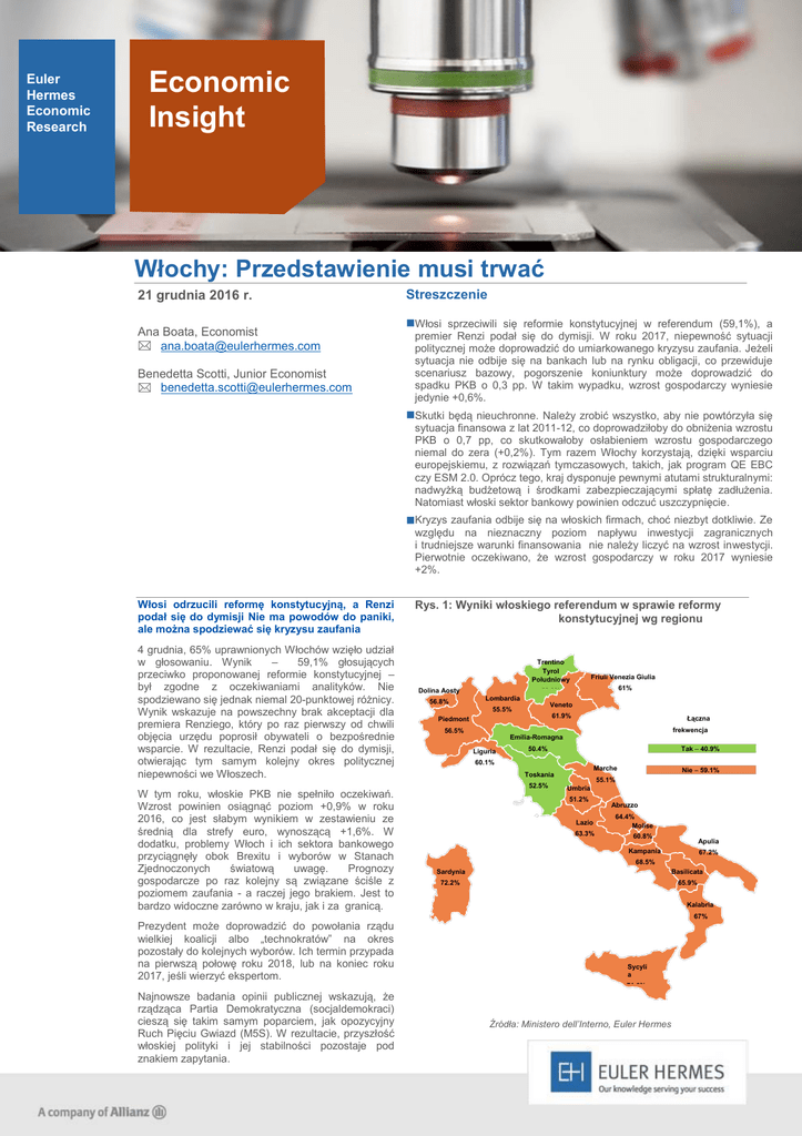 Euler Hermes Economic Research Economic Insight Włochy: Przedstawienie musi trwać 21 grudnia 2016 r. Ana Boata, Economist [email protected] Benedetta Scotti, Junior Economist [email protected] Streszczenie Włosi sprzeciwili się reformie konstytucyjnej w referendum (59,1%), a premier Renzi podał się do dymisji. W roku 2017, niepewność sytuacji politycznej może doprowadzić do umiarkowanego kryzysu zaufania. Jeżeli sytuacja nie odbije się na bankach lub na rynku obligacji, co przewiduje scenariusz bazowy, pogorszenie koniunktury może doprowadzić do spadku PKB o 0,3 pp. W takim wypadku, wzrost gospodarczy wyniesie jedynie +0,6%. Skutki będą nieuchronne. Należy zrobić wszystko, aby nie powtórzyła się sytuacja finansowa z lat 2011-12, co doprowadziłoby do obniżenia wzrostu PKB o 0,7 pp, co skutkowałoby osłabieniem wzrostu gospodarczego niemal do zera (+0,2%). Tym razem Włochy korzystają, dzięki wsparciu europejskiemu, z rozwiązań tymczasowych, takich, jak program QE EBC czy ESM 2.0. Oprócz tego, kraj dysponuje pewnymi atutami strukturalnymi: nadwyżką budżetową i środkami zabezpieczającymi spłatę zadłużenia. Natomiast włoski sektor bankowy powinien odczuć uszczypnięcie. Kryzys zaufania odbije się na włoskich firmach, choć niezbyt dotkliwie. Ze względu na nieznaczny poziom napływu inwestycji zagranicznych i trudniejsze warunki finansowania nie należy liczyć na wzrost inwestycji. Pierwotnie oczekiwano, że wzrost gospodarczy w roku 2017 wyniesie +2%. Włosi odrzucili reformę konstytucyjną, a Renzi podał się do dymisji Nie ma powodów do paniki, ale można spodziewać się kryzysu zaufania 4 grudnia, 65% uprawnionych Włochów wzięło udział w głosowaniu. Wynik – 59,1% głosujących przeciwko proponowanej reformie konstytucyjnej – był zgodne z oczekiwaniami analityków. Nie spodziewano się jednak niemal 20-punktowej różnicy. Wynik wskazuje na powszechny brak akceptacji dla premiera Renziego, który po raz pierwszy od chwili objęcia urzędu poprosił obywateli o bezpośrednie wsparcie. W rezultacie, Renzi podał się do dymisji, otwierając tym samym kolejny okres politycznej niepewności we Włoszech. W tym roku, włoskie PKB nie spełniło oczekiwań. Wzrost powinien osiągnąć poziom +0,9% w roku 2016, co jest słabym wynikiem w zestawieniu ze średnią dla strefy euro, wynoszącą +1,6%. W dodatku, problemy Włoch i ich sektora bankowego przyciągnęły obok Brexitu i wyborów w Stanach Zjednoczonych światową uwagę. Prognozy gospodarcze po raz kolejny są związane ściśle z poziomem zaufania - a raczej jego brakiem. Jest to bardzo widoczne zarówno w kraju, jak i za granicą. Rys. 1: Wyniki włoskiego referendum w sprawie reformy konstytucyjnej wg regionu Trentino Tyrol Południowy Dolina Aosty 56.8% Friuli Venezia Giulia 61% 53.9% Lombardia Veneto 55.5% 61.9% Piedmont Łączna frekwencja 56.5% Emilia-Romagna Liguria wyborcza Tak – 40.9% 65.47% 50.4% 60.1% Marche Toskania 52.5% Nie – 59.1% 55.1% Umbria 51.2% Lazio 63.3% Abruzzo 64.4% Molise 60.8% Apulia Kampania 67.2% 68.5% Sardynia Basilicata 72.2% 65.9% Kalabria 67% Prezydent może doprowadzić do powołania rządu wielkiej koalicji albo „technokratów” na okres pozostały do kolejnych wyborów. Ich termin przypada na pierwszą połowę roku 2018, lub na koniec roku 2017, jeśli wierzyć ekspertom. Sycyli a 71.6% Najnowsze badania opinii publicznej wskazują, że rządząca Partia Demokratyczna (socjaldemokraci) cieszą się takim samym poparciem, jak opozycyjny Ruch Pięciu Gwiazd (M5S). W rezultacie, przyszłość włoskiej polityki i jej stabilności pozostaje pod znakiem zapytania. Źródła: Ministero dell’Interno, Euler Hermes Ponadto, nieustalony status dwóch izb parlamentu będzie utrudniał wdrożenie strategicznych reform. W rezultacie, rynki mogą testować wytrzymałość włoskich banków i długu publicznego. Zaufanie inwestorów ulegnie osłabieniu, co będzie miało negatywny wpływ na przedsiębiorstwa i banki. Reformy gospodarcze mogą stanąć w martwym punkcie, odsłaniając kolejne słabe punkty strukturalne Włoch. Nasz scenariusz bazowy sugeruje, że Włochy unikną kryzysu zaufania, jaki miał miejsce w latach 2011-12 i odbił się mocno na gospodarce. Obligacje państwowe są zabezpieczone przez zakup przez EBC w ramach QE (luzowania polityki pieniężnej), a europejskie ramy instytucjonalne uległy wzmocnieniu. Jeśli zmiany polityczne zostaną przeprowadzone sprawnie i przejrzyście, ich negatywne skutki nie powinny wymknąć się spod kontroli. W tym scenariuszu, spodziewany wzrost PKB w roku 2017 wynosi +0,6%. Jest to wartość o 0,3pp niższa w porównaniu z poprzednio prognozowaną. Jednak, jeśli kryzys zaufania dotknie banków i/lub rynku obligacji, przynosząc skutki podobne do tych, jakie miały miejsce w latach 2011-12, konsekwencje mogą być poważne. W roku 2017, wzrost gospodarczy może spaść o 0,7 pp, sprowadzając PKB do poziomu +0,2% (Rys. 2). Obawa przed skutkami? Nie spodziewajmy się powrotu roku 2011-12 W porównaniu z kryzysami przeszłości, Włochy dysponują atutów. politycznymi w dziś szeregiem (i) EBC (Europejski Bank Centralny). Nadal będzie pełnić rolę ratunkową, kupując włoskie obligacje w ramach programu QE, być może aż do końca roku 2017. Od marca 2015 r., kwota miesięcznych zakupów netto włoskich państwowych dłużnych papierów wartościowych przez EBC wynosiła średnio 10 mld EUR. Plan ma łączną wartość 188,5 mld EUR, co stanowi równowartość 10% włoskiego rynku obligacji. Ten poziom zakupów, ograniczony przez wdrażane przez EBC zasady klucza kapitałowego, będzie wystarczający, aby skompensować sprzedaż na poziomie zbliżonym do okresu 2011-12. Pewne zachwiania są jednak możliwe (Rys. 3): Rys. 2: Wpływ kryzysu zaufania na wzrost PKB we Włoszech Wpływ kryzysu zaufania przy skutkach dla gospodarki Zrealizowany/ oczekiwany wzrost w przypadku kryzysu zaufania ze sk