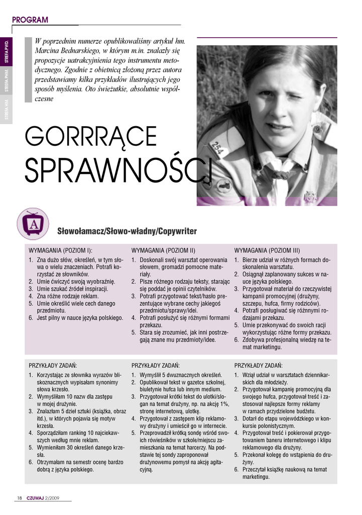 PROGRAM STREFA HM. STREFA PHM. STREFA PWD. W poprzednim numerze opublikowaliœmy artyku³ hm. Marcina Bednarskiego, w którym m.in. znalaz³y siê propozycje uatrakcyjnienia tego instrumentu metodycznego. Zgodnie z obietnic¹ z³o¿on¹ przez autora przedstawiamy kilka przyk³adów ilustruj¹cych jego sposób myœlenia. Oto œwie¿utkie, absolutnie wspó³czesne GORRR¥CE SPRAWNOŒCI S³owo³amacz/S³owo-w³adny/Copywriter 18 WYMAGANIA (POZIOM I): WYMAGANIA (POZIOM II) WYMAGANIA (POZIOM III) 1. Zna du¿o s³ów, okreœleñ, w tym s³owa o wielu znaczeniach. Potrafi korzystaæ ze s³owników. 2. Umie æwiczyæ swoj¹ wyobraŸniê. 3. Umie szukaæ Ÿróde³ inspiracji. 4. Zna ró¿ne rodzaje reklam. 5. Umie okreœliæ wiele cech danego przedmiotu. 6. Jest pilny w nauce jêzyka polskiego. 1. Doskonali swój warsztat operowania s³owem, gromadzi pomocne materia³y. 2. Pisze ró¿nego rodzaju teksty, staraj¹c siê poddaæ je opinii czytelników. 3. Potrafi przygotowaæ tekst/has³o prezentuj¹ce wybrane cechy jakiegoœ przedmiotu/sprawy/idei. 4. Potrafi pos³u¿yæ siê ró¿nymi formami przekazu. 5. Stara siê zrozumieæ, jak inni postrzegaj¹ znane mu przedmioty/idee. 1. Bierze udzia³ w ró¿nych formach doskonalenia warsztatu. 2. Osi¹gn¹³ zaplanowany sukces w nauce jêzyka polskiego. 3. Przygotowa³ materia³ do rzeczywistej kampanii promocyjnej (dru¿yny, szczepu, hufca, firmy rodziców). 4. Potrafi pos³ugiwaæ siê ró¿nnymi rodzajami przekazu. 5. Umie przekonywaæ do swoich racji wykorzystuj¹c ró¿ne formy przekazu. 6. Zdobywa profesjonaln¹ wiedzê na temat marketingu. PRZYK£ADY ZADAÑ: PRZYK£ADY ZADAÑ: PRZYK£ADY ZADAÑ: 1. Korzystaj¹c ze s³ownika wyrazów bliskoznacznych wypisa³am synonimy s³owa krzes³o. 2. Wymyœli³am 10 nazw dla zastêpu w mojej dru¿ynie. 3. Znalaz³am 5 dzie³ sztuki (ksi¹¿ka, obraz itd.), w których pojawia siê motyw krzes³a. 4. Sporz¹dzi³am ranking 10 najciekawszych wed³ug mnie reklam. 5. Wymieni³am 30 okreœleñ danego krzes³a. 6. Otrzyma³am na semestr ocenê bardzo dobr¹ z jêzyka polskiego. 1. Wymyœli³ 5 dwuznacznych okreœleñ. 2. Opublikowa³ tekst w gazetce szkolnej, biuletynie hufca lub innym medium. 3. Przygotowa³ krótki tekst do ulotki/slogan na temat dru¿yny, np. na akcjê 1%, stronê internetow¹, ulotkê. 4. Przygotowa³ z zastêpem klip reklamowy dru¿yny i umieœci³ go w internecie. 5. Przeprowadzi³ krótk¹ sondê wœród swoich rówieœników w szkole/miejscu zamieszkania na temat harcerzy. Na podstawie tej sondy zaproponowa³ dru¿ynowemu pomys³ na akcjê agitacyjn¹. 1. Wzi¹³ udzia³ w warsztatach dziennikarskich dla m³odzie¿y. 2. Przygotowa³ kampaniê promocyjn¹ dla swojego hufca, przygotowa³ treœæ i zastosowa³ najlepsze formy reklamy w ramach przydzielone bud¿etu. 3. Dotar³ do etapu wojewódzkiego w konkursie polonistycznym. 4. Przygotowa³ treœæ i pokierowa³ przygotowaniem baneru internetowego i klipu reklamowego dla dru¿yny. 5. Przekona³ kolegê do wst¹pienia do dru¿yny. 6. Przeczyta³ ksi¹¿kê naukow¹ na temat marketingu. CZUWAJ 2/2009 PROGRAM STREFA PWD. Wyginacz/Mistrz parkietu/Biboj-Bigerl WYMAGANIA (POZIOM III): 1. Osi¹gn¹³ wiêksz¹ sprawnoœæ fizyczn¹ i gibkoœæ ni¿ jego rówieœnicy. 2. W sposób planowy æwiczy potrzebne partie miêœni. 3. Potrafi wykonaæ przynajmniej dwa rodzaje power moves. 4. Zaprezentowa³ przynajmniej dwa kompletne uk³ady do wybranych podk³adów muzycznych. 5. Posiada wiedzê na temat œrodowiska i sceny breakdance. 6. Rozwija swój w³asny styl tañca. 1. Osi¹gn¹³ wiêksz¹ sprawnoœæ fizyczn¹ ni¿ jego rówieœnicy. 2. Regularnie æwiczy sprawnoœæ fizyczn¹ oraz breakdance. 3. Zaprezentowa³ improwizacjê do zadanego podk³adu muzycznego. 4. Osi¹gn¹³ sukces w bitwie lub pojedynku osobiœcie lub z zespo³em. 5. W miarê swoich mo¿liwoœci uczestniczy w ¿yciu spo³ecznoœci tancerzy. 6. Wypracowa³ swój styl i wizerunek. PRZYK£ADY ZADAÑ: PRZYK£ADY ZADAÑ: PRZYK£ADY ZADAÑ: 1. Otrzyma³ ocenê bardzo dobr¹ z w-f na sprawdzianie z gibkoœci (mostek, skok przez koz³a itp.). 2. Na zbiórce dru¿yny pokaza³ prezentacjê zdjêæ i opowiedzia³ o powstaniu breakdance'u, a tak¿e o ró¿nych stylach tañca, wykorzystuj¹c materia³y dostêpne w internecie. 3. Podczas imprezy rodzinnej/szkolnej/ w dru¿ynie zaprezentowa³ figury breakdance. 4. Gra³ na bêbenku i tamburynie podczas œpiewanek dru¿yny. 1. Potrafi staæ/chodziæ na rêkach. 2. Zaplanowa³ z fachowcem zestaw domowych æwiczeñ i regularnie je wykonuje. 3. Podczas akcji agitacyjnej dru¿yny zaprezentowa³ uk³ad zawieraj¹cy power moves. 4. Zebra³ informacje o grupach breakdance, które dzia³aj¹ w jego okolicy. Potrafi wymieniæ kilka najlepszych zespo³ów i tancerzy w kraju. 1. Potrafi wykonaæ stanie na jednej rêce. 2. Zapisa³ siê na zajêcia breakdance i regularnie w nich uczestniczy. 3. Zebra³ informacje o grupach breakdance, które dzia³aj¹ w jego okolicy. Potrafi wymieniæ kilka najlepszych zespo³ów i tancerzy w kraju. 4. Stworzy³ stronê internetow¹ o sobie, na której zaprezentowa³ swój styl tañca i umiejêtnoœci. STREFA HM. WYMAGANIA (POZIOM II): 1. Rozwija swoj¹ sprawnoœæ fizyczn¹. 2. Zna historiê breakdance'u i jego miejsce w kulturze hip-hop. 3. Potrafi wykonaæ figury tañca breakdance z rodzaju toprock, footwork, freezy. 4. Rozpoznaje ró¿ne style tañca breakdance. 5. Æwiczy poczucie rytmu. STREFA PHM. WYMAGANIE (POZIOM I): £¹cznik/Telekomunikator/Mobilny WYMAGANIA (POZIOM I): WYMAGANIA (POZIOM II): WYMAGANIA (POZIOM III): 1. Skonfigurowa³ przynajmniej trzy kana³y kontaktu dla swojego zastêpu (np. telefon komórkowy, e-mail, komunikator). 2. Potrafi poprawnie wys³aæ SMS i MMS z telefonu komórkowego z potwierdzeniem odbioru. 3. W telefonie komórkowym lub domowym ma wpisane wszystkie wa¿ne telefony (posterunek policji, pogotowie, numer ICE itp.). 4. Za³o¿y³ konto poczty elektronicznej, potrafi z niego korzystaæ w r