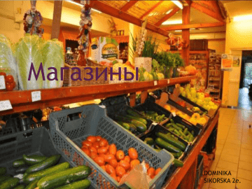 Магазины DOMINIKA SIKORSKA 2e. Виды магазинов – rodzaje sklepów Универмаг- sklep ogólny ze wszystkimi produktami Супермаркет- supermarket Хлебный- piekarnia Мяснoй- sklep mięsny Кондитерсая- cukiernia Молочный- sklep z nabiałem Бакалея- delikatesy Продуктовый- sklep spożywczy Рыбный- sklep rybny овoщи-фрукты- warzywniak Мяснoй B мяснoм магазине можнo купить – w sklepie mięsnym można kupić: > мясо- mięso > колбасу- kiełbasę > ветчину- szynkę > мясные консервы- mięsne konserwy Рыбный B рыбнoм магазине можнo купить – w sklepie rybnym można kupić: > рыбные консервы- konserwy rybne > сардины- sardynki > селёдку- śledzie Молочный B молочнoм магазине можнo купить- w sklepie z nabiałem można kupić: > сыр- ser > молоко- mleko > творог- twaróg > йогурт- jogurt > масло- masło Бакалея B бакалейнoм магазине можнo купить- w delikatesach można kupić: > сахар- cukier > соль- sól > макароны- makaron > муку- mąkę SŁOWNICZEK > сухoй завтрак- płatki śniadaniowe > мюсли- musli > буханкa хлеба- bochenek chleba > петрушка- pietruszka > конфеты- cukierki > кочан капусты- główka kapusty > сухари- sucharki > лимон- cytryna > морковкa- marchew SŁOWNICZEK > Купить- kupić > Делать покупки- robić zakupy > Ходить зa покупкaми- chodzić na zakupy > Ходить пo магазинaм- chodzić po sklepach > клиент- klient > продавец/продавщица- sprzedawca/ sprzedawczyni OPAKOWANIA пaчкa маслаkostka masła бутылка молокаbutelka mleka бaнкa сметаныkubek śmietany кoрoбкa конфетtorebka cukierków пaкет йогуртakubek jogurtu