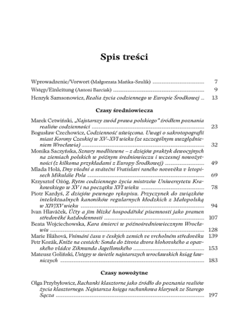 Spis treści Wprowadzenie/Vorwort (Małgorzata Mańka-Szulik) .............................................. 7 Wstęp/Einleitung (Antoni Barciak) ................................................................................. 9 Henryk Samsonowicz, Realia życia codziennego w Europie Środkowej ... 13 Czasy średniowiecza Marek Cetwiński, „Najstarszy zwód prawa polskiego” źródłem poznania realiów codzienności .................................................................................................... Bogusław Czechowicz, Codzienność uświęcona. Uwagi o sakrotopografii miast Korony Czeskiej w XV–XVI wieku (ze szczególnym uwzględnieniem Wrocławia) ............................................................................................................. Monika Saczyńska, Sznury modlitewne – z dziejów praktyk dewocyjnych na ziemiach polskich w późnym średniowieczu i wczesnej nowożytności (z kilkoma przykładami z Europy Środkowej) ................................... Mlada Holá, Dny všední a sváteční Vratislavi raného novověku v letopisech Mikuláše Pola ........................................................................................................ Krzysztof Ożóg, Rytm codziennego życia mistrzów Uniwersytetu Krakowskiego w XV i na początku XVI wieku ........................................................ Piotr Kardyś, Z dziejów pewnego rękopisu. Przyczynek do związków intelektualnych kanoników regularnych kłodzkich z Małopolską w XIV/XV wieku .............................................................................................................. Ivan Hlaváček, Účty a jim blízké hospodářské písemnosti jako pramen středověké každodennosti ......................................................................................... Beata Wojciechowska, Kara śmierci w późnośredniowiecznym Wrocławiu ......................................................................................................................................... Marie Bláhová, Vnímání času v českých zemích ve vrcholném středověku Petr Kozák, Kníže na cestách: Sonda do života dvora hlohovského a opavského vládce Zikmunda Jagellonského ............................................................... Mateusz Goliński, Ustępy w świetle najstarszych wrocławskich ksiąg ławniczych ................................................................................................................................ 23 32 49 69 78 94 107 128 139 153 183 Czasy nowożytne Olga Przybyłowicz, Rachunki klasztorne jako źródło do poznania realiów życia klasztornego. Najstarsza księga rachunkowa klarysek ze Starego Sącza .................................................................................................................................... 197 6 Spis treści ks. Kazimierz Dola, Życie codzienne proboszcza w ostatniej ćwierci XVII wieku na pograniczu diecezji krakowskiej i wrocławskiej („Wielkie Zabrze”) .............................................................................................................................. 221 Anna Markiewicz, Wokół przygotowań do peregrynacji. Instrukcja Stanisława Wincentego Jabłonowskiego dla starosty buskiego Józefa Aleksandra Jabłonowskiego z 1728 roku ......................................................... 233 Czasy nowsze i najnowsze Jan Pacholski, Życie codzienne mieszkańców Karkonoszy oraz turystów w powieściach Theodora Fontane i Paula Kellera ......................................... Teresa Kulak, Kobiece trudności codziennego życia we Wrocławiu w czasie pierwszej wojny światowej ................................................................................. Grzegorz Bębnik, Życie codzienne w województwie śląskim w przededniu wybuchu drugiej wojny światowej ................................................................. Bogusław Tracz, Życie codzienne mieszkańców Górnego Śląska w warunkach kryzysu gospodarczego lat osiemdziesiątych XX wieku ................. Sebastian Rosenbaum, Hotele robotnicze jako przestrzeń życiowa w okręgu przemysłowym Górnego Śląska w drugiej połowie XX wieku .......... Wojciech Iwańczak, Życie codzienne w powojennych syntezach dziejów Śląska .................................................................................................................................. Sebastian Ligarski, Proza życia. Życie codzienne na Śląsku w świetle ogłoszeń drobnych w latach 1945–1949 ................................................................... Zdzisław Jedynak, Życie codzienne w Zabrzu (w realiach wsi i osady przemysłowej) od połowy XVIII wieku do 1914 roku .......................................... Rudolf Žáček, Národní a regionální specifika v materiální kultuře Rakouského Slezska ........................................................................................................... Arkadiusz Markowski, Havířov, Žiar nad Hronom i Tychy – pierwsze lata budowy trzech miast socjalistycznych w oczach ich mieszkańców ...... Jarosław Koneczny, Łukasz Kondziołka, O pracowitości naszych przodków, czyli dlaczego w XVII wieku wybierano metody łączenia wymagające większych nakładów pracy, podczas gdy dostępne były łatwiejsze… Zygmunt Woźniczka, Realia życia codziennego w czasach stalinowskich na Górnym Śląsku ......................................................................................................... 250 270 287 303 324 341 351 384 395 405 412 426 Krótkie podsumowanie (Wojciech Iwańczak) ........................................................... 456 Aneks Tymoteusz Król, Wilamowice – język, kultura i strój .......................................... 459 Zapis panelu dyskusyjnego na temat: „Realia życia codziennego na Śląsku a tworzenie elit” .......................................................................
