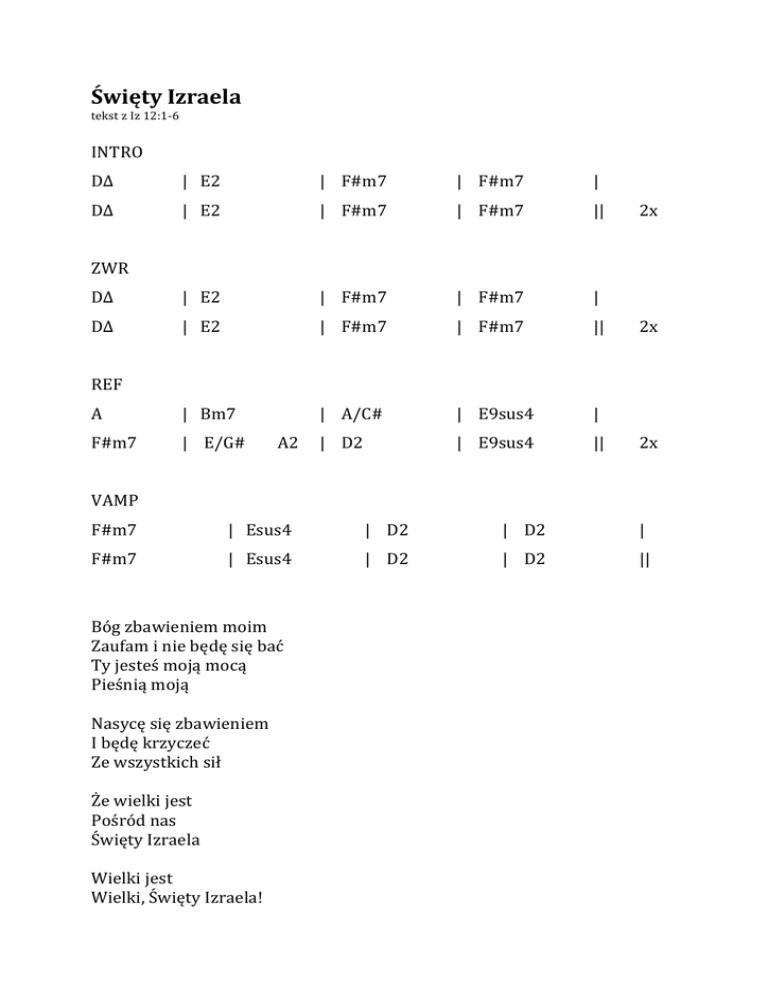 Święty Izraela tekst z Iz 12:1-‐6 INTRO D∆ | E2 | F#m7 | F#m7 | D∆ | E2 | F#m7 | F#m7 || D∆ | E2 | F#m7 | F#m7 | D∆ | E2 | F#m7 | F#m7 || | Bm7 | A/C# | E9sus4 | | E9sus4 || 2x 2x ZWR 2x REF A F#m7 | E/G# A2 | D2 VAMP F#m7 | Esus4 | D2 | D2 | F#m7 | Esus4 | D2 | D2 || Bóg zbawieniem moim Zaufam i nie będę się bać Ty jesteś moją mocą Pieśnią moją Nasycę się zbawieniem I będę krzyczeć Ze wszystkich sił Że wielki jest Pośród nas Święty Izraela Wielki jest Wielki, Święty Izraela!