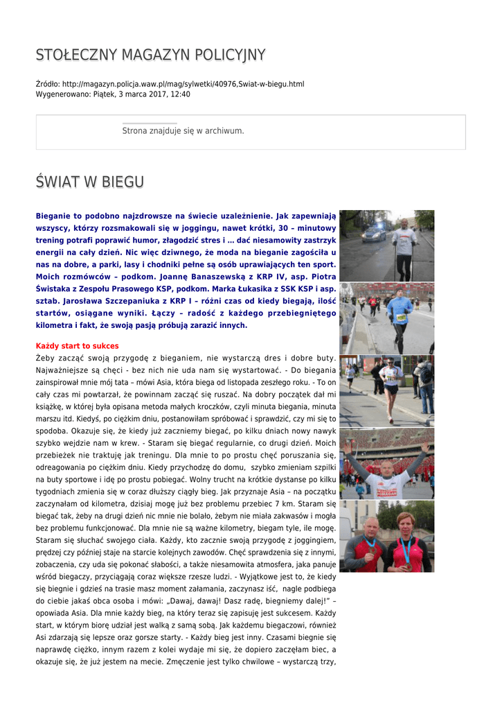 STOŁECZNY MAGAZYN POLICYJNY Źródło: http://magazyn.policja.waw.pl/mag/sylwetki/40976,Swiat-w-biegu.html Wygenerowano: Piątek, 3 marca 2017, 12:40 Strona znajduje się w archiwum. ŚWIAT W BIEGU Bieganie to podobno najzdrowsze na świecie uzależnienie. Jak zapewniają wszyscy, którzy rozsmakowali się w joggingu, nawet krótki, 30 – minutowy trening potrafi poprawić humor, złagodzić stres i … dać niesamowity zastrzyk energii na cały dzień. Nic więc dziwnego, że moda na bieganie zagościła u nas na dobre, a parki, lasy i chodniki pełne są osób uprawiających ten sport. Moich rozmówców – podkom. Joannę Banaszewską z KRP IV, asp. Piotra Świstaka z Zespołu Prasowego KSP, podkom. Marka Łukasika z SSK KSP i asp. sztab. Jarosława Szczepaniuka z KRP I – różni czas od kiedy biegają, ilość startów, osiągane wyniki. Łączy – radość z każdego przebiegniętego kilometra i fakt, że swoją pasją próbują zarazić innych. Każdy start to sukces Żeby zacząć swoją przygodę z bieganiem, nie wystarczą dres i dobre buty. Najważniejsze są chęci - bez nich nie uda nam się wystartować. - Do biegania zainspirował mnie mój tata – mówi Asia, która biega od listopada zeszłego roku. - To on cały czas mi powtarzał, że powinnam zacząć się ruszać. Na dobry początek dał mi książkę, w której była opisana metoda małych kroczków, czyli minuta biegania, minuta marszu itd. Kiedyś, po ciężkim dniu, postanowiłam spróbować i sprawdzić, czy mi się to spodoba. Okazuje się, że kiedy już zaczniemy biegać, po kilku dniach nowy nawyk szybko wejdzie nam w krew. - Staram się biegać regularnie, co drugi dzień. Moich przebieżek nie traktuję jak treningu. Dla mnie to po prostu chęć poruszania się, odreagowania po ciężkim dniu. Kiedy przychodzę do domu, szybko zmieniam szpilki na buty sportowe i idę po prostu pobiegać. Wolny trucht na krótkie dystanse po kilku tygodniach zmienia się w coraz dłuższy ciągły bieg. Jak przyznaje Asia – na początku zaczynałam od kilometra, dzisiaj mogę już bez problemu przebiec 7 km. Staram się biegać tak, żeby na drugi dzień nic mnie nie bolało, żebym nie miała zakwasów i mogła bez problemu funkcjonować. Dla mnie nie są ważne kilometry, biegam tyle, ile mogę. Staram się słuchać swojego ciała. Każdy, kto zacznie swoją przygodę z joggingiem, prędzej czy później staje na starcie kolejnych zawodów. Chęć sprawdzenia się z innymi, zobaczenia, czy uda się pokonać słabości, a także niesamowita atmosfera, jaka panuje wśród biegaczy, przyciągają coraz większe rzesze ludzi. - Wyjątkowe jest to, że kiedy się biegnie i gdzieś na trasie masz moment załamania, zaczynasz iść, nagle podbiega do ciebie jakaś obca osoba i mówi: „Dawaj, dawaj! Dasz radę, biegniemy dalej!” – opowiada Asia. Dla mnie każdy bieg, na który teraz się zapisuję jest sukcesem. Każdy start, w którym biorę udział jest walką z samą sobą. Jak każdemu biegaczowi, również Asi zdarzają się lepsze oraz gorsze starty. - Każdy bieg jest inny. Czasami biegnie się naprawdę ciężko, innym razem z kolei wydaje mi się, że dopiero zaczęłam biec, a okazuje się, że już jestem na mecie. Zmęczenie jest tylko chwilowe – wystarczą trzy, cztery wdechy i znów można normalnie funkcjonować. Teraz jestem na takim etapie, że myślę już o poprawieniu swojego czasu na 5 km. Chcę zejść poniżej 30 min. Mam nadzieję, że w przyszłości wystartuję w półmaratonie i maratonie. Chyba każdy biegacz stawia przed sobą taki cel. Dla Asi każda osoba, która przekracza linię mety, już wygrywa. Nie ma dla niej znaczenia to, które miejsce zajmuje się w tej rywalizacji. - Dla mnie przegrani to ci, którzy nie biorą udziału w danym biegu. Bieganie wciąga. Kiedy zakładam buty i robię moją przebieżkę, wpadam na najlepsze pomysły. Jeżeli podczas biegu danego problemu nie uda mi się rozwiązać, godzina biegu nie pomoże, to znaczy, że sprawa musi jeszcze zaczekać. Walka z samym sobą Asi do swojej pasji udało się przekonać kolegę z pokoju – asp. Piotra Świstaka. - Można powiedzieć, że moja historia z bieganiem zaczęła się przez chorobę taty Asi. Problem ze zdrowiem spowodował, że nie mógł wystartować w biegu, na który był już zapisany. Żeby nie zmarnował się pakiet, postanowiłem go zastąpić i wystartowałem w „Biegu Niepodległości”. Praktycznie bez przygotowania udało się przebiec w dobrym czasie poniżej godziny – wspomina Piotrek. Niestety, taki wyczyn możliwy jest tylko dla nielicznych. Sport dla Piotrka nigdy nie był czymś obcym. Przez wiele lat intensywnie grał w piłkę nożną, teraz pięć razy w tygodniu ćwiczy na siłowni. - Zazwyczaj biegam dla przyjemności za … piłką. Zdarza się, że podczas treningów na siłowni biegam na bieżni. To wszystko dobrze wpływa na moją kondycję. O Piotrku można powiedzieć, że to prawdziwy twardziel. Podczas jednego z biegów, w którym startował (półmaraton warszawski), kilka kilometrów przed metą odnowiła mu się stara kontuzja kolana. Miałem chwilę zwątpienia, ale powiedziałem sobie, że dam radę i ukończę ten bieg. W kolejnym zaplanowanym starcie też wziąłem udział, tyle że zamiast biec … szedłem z kijkami nordic walking. Mimo, że zaczął biegać kilka miesięcy temu, teraz jest w trakcie przygotowań do sierpniowego Biegu Katorżnika, który odbędzie się w Lublińcu. Trasa jest bardzo trudna – trzeba zmierzyć się nie tylko ze sobą, ale przede wszystkim z bagnem, błotem, zaroślami i różnymi przeszkodami naturalnymi i sztucznymi. - Z tego co wiem, nie każdy kończy ten ekstremalny, 10 km bieg. Mam nadzieję, że mnie się uda. Bieganie to nie tylko super atmosfera, niesamowita frajda i sposób na naładowanie akumulatorów. To także sposób na pomaganie innym, którzy sami nie mogą stanąć na starcie. - Często organizowane są biegi