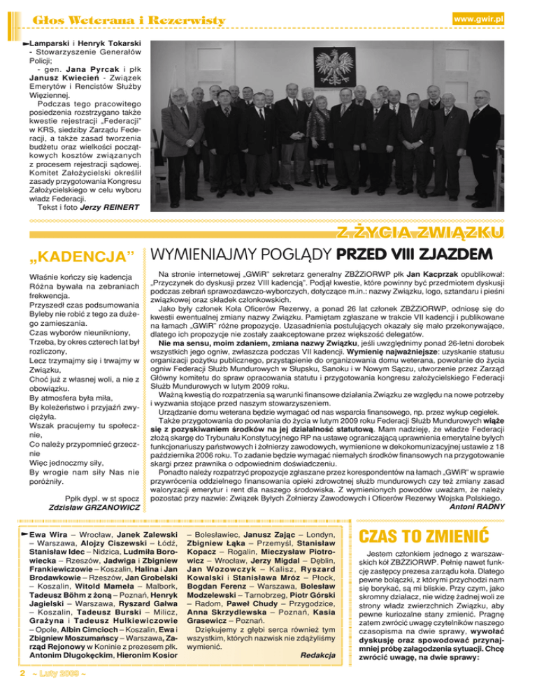 G³os Weterana i Rezerwisty www.gwir.pl Lamparski i Henryk Tokarski - Stowarzyszenie Generałów Policji; - gen. Jana Pyrcak i płk Janusz Kwiecień - Związek Emerytów i Rencistów Służby Więziennej. Podczas tego pracowitego posiedzenia rozstrzygano także kwestie rejestracji „Federacji” w KRS, siedziby Zarządu Federacji, a także zasad tworzenia budżetu oraz wielkości początkowych kosztów związanych z procesem rejestracji sądowej. Komitet Założycielski określił zasady przygotowania Kongresu Założycielskiego w celu wyboru władz Federacji. Tekst i foto Jerzy REINERT z życia związku „Kadencja” Wymieniajmy poglądy przed VIII zjazdem Właśnie kończy się kadencja Różna bywała na zebraniach frekwencja. Przyszedł czas podsumowania Byleby nie robić z tego za dużego zamieszania. Czas wyborów nieunikniony, Trzeba, by okres czterech lat był rozliczony, Lecz trzymajmy się i trwajmy w Związku, Choć już z własnej woli, a nie z obowiązku. By atmosfera była miła, By koleżeństwo i przyjaźń zwyciężyła. Wszak pracujemy tu społecznie, Co należy przypomnieć grzecznie Więc jednoczmy siły, By wrogie nam siły Nas nie poróżniły. Ppłk dypl. w st spocz Zdzisław GRZANOWICZ Na stronie internetowej „GWiR” sekretarz generalny ZBŻZiORWP płk Jan Kacprzak opublikował: „Przyczynek do dyskusji przez VIII kadencją”. Podjął kwestie, które powinny być przedmiotem dyskusji podczas zebrań sprawozdawczo-wyborczych, dotyczące m.in.: nazwy Związku, logo, sztandaru i pieśni związkowej oraz składek członkowskich. Jako były członek Koła Oficerów Rezerwy, a ponad 26 lat członek ZBŻZiORWP, odniosę się do kwestii ewentualnej zmiany nazwy Związku. Pamiętam zgłaszane w trakcie VII kadencji i publikowane na łamach „GWiR” różne propozycje. Uzasadnienia postulujących okazały się mało przekonywające, dlatego ich propozycje nie zostały zaakceptowane przez większość delegatów. Nie ma sensu, moim zdaniem, zmiana nazwy Związku, jeśli uwzględnimy ponad 26-letni dorobek wszystkich jego ogniw, zwłaszcza podczas VII kadencji. Wymienię najważniejsze: uzyskanie statusu organizacji pożytku publicznego, przystąpienie do organizowania domu weterana, powołanie do życia ogniw Federacji Służb Mundurowych w Słupsku, Sanoku i w Nowym Sączu, utworzenie przez Zarząd Główny komitetu do spraw opracowania statutu i przygotowania kongresu założycielskiego Federacji Służb Mundurowych w lutym 2009 roku. Ważną kwestią do rozpatrzenia są warunki finansowe działania Związku ze względu na nowe potrzeby i wyzwania stojące przed naszym stowarzyszeniem. Urządzanie domu weterana będzie wymagać od nas wsparcia finansowego, np. przez wykup cegiełek. Także przygotowania do powołania do życia w lutym 2009 roku Federacji Służb Mundurowych wiąże się z pozyskiwaniem środków na jej działalność statutową. Mam nadzieję, że władze Federacji złożą skargę do Trybunału Konstytucyjnego RP na ustawę ograniczającą uprawnienia emerytalne byłych funkcjonariuszy państwowych i żołnierzy zawodowych, wymienione w dekokomunizacyjnej ustawie z 18 października 2006 roku. To zadanie będzie wymagać niemałych środków finansowych na przygotowanie skargi przez prawnika o odpowiednim doświadczeniu. Ponadto należy rozpatrzyć propozycje zgłaszane przez korespondentów na łamach „GWiR” w sprawie przywrócenia oddzielnego finansowania opieki zdrowotnej służb mundurowych czy też zmiany zasad waloryzacji emerytur i rent dla naszego środowiska. Z wymienionych powodów uważam, że należy pozostać przy nazwie: Związek Byłych Żołnierzy Zawodowych i Oficerów Rezerwy Wojska Polskiego. Antoni RADNY Ewa Wira – Wrocław, Janek Zalewski – Warszawa, Alojzy Ciszewski – Łódź, Stanisław Idec – Nidzica, Ludmiła Borowiecka – Rzeszów, Jadwiga i Zbigniew Frankiewiczowie – Koszalin, Halina i Jan Brodawkowie – Rzeszów, Jan Grobelski – Koszalin, Witold Mameła – Malbork, Tadeusz Böhm z żoną – Poznań, Henryk Jagielski – Warszawa, Ryszard Gałwa – Koszalin, Tadeusz Burski – Milicz, Grażyna i Tadeusz Hulkiewiczowie – Opole, Albin Cimcioch – Koszalin, Ewa i Zbigniew Moszumańscy – Warszawa, Zarząd Rejonowy w Koninie z prezesem płk. Antonim Długokęckim, Hieronim Kosior ~ Luty 2009 ~ – Bolesławiec, Janusz Zając – Londyn, Zbigniew Łąka – Przemyśl, Stanisław Kopacz – Rogalin, Mieczysław Piotrowicz – Wrocław, Jerzy Migdal – Dęblin, Jan Wozowczyk – Kalisz, Ryszard Kowalski i Stanisława Mróz – Płock, Bogdan Ferenz – Warszawa, Bolesław Modzelewski – Tarnobrzeg, Piotr Górski – Radom, Paweł Chudy – Przygodzice, Anna Skrzydlewska – Poznań, Kasia Grasewicz – Poznań. Dziękujemy z głębi serca również tym wszystkim, których nazwisk nie zdążyliśmy wymienić. Redakcja CZAS TO ZMIENIĆ Jestem członkiem jednego z warszawskich kół ZBŻZiORWP. Pełnię nawet funkcję zastępcy prezesa zarządu koła. Dlatego pewne bolączki, z którymi przychodzi nam się borykać, są mi bliskie. Przy czym, jako skromny działacz, nie widzę żadnej woli ze strony władz zwierzchnich Związku, aby pewne kuriozalne stany zmienić. Pragnę zatem zwrócić uwagę czytelników naszego czasopisma na dwie sprawy, wywołać dyskusję oraz spowodować przynajmniej próbę załagodzenia sytuacji. Chcę zwrócić uwagę, na dwie sprawy: