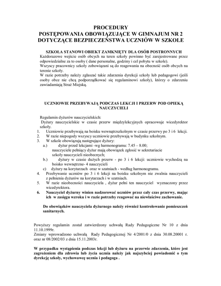 PROCEDURY POSTĘPOWANIA OBOWIĄZUJĄCE W GIMNAJUM NR 2 DOTYCZĄCE BEZPIECZEŃSTWA UCZNIÓW W SZKOLE SZKOŁA STANOWI OBIEKT ZAMKNIĘTY DLA OSÓB POSTRONNYCH Każdorazowe wejście osób obcych na teren szkoły powinno być zarejestrowane przez odpowiedzialne za to osoby ( dane personalne, godziny i cel pobytu w szkole). Wszyscy pracownicy szkoły zobowiązani są do reagowania na obecność osób obcych na terenie szkoły. W razie potrzeby należy zgłaszać takie zdarzenia dyrekcji szkoły lub pedagogowi (jeśli osoby obce nie chcą podporządkować się regulaminowi szkoły), którzy o zdarzeniu zawiadamiają Straż Miejską. UCZNIOWIE PRZEBYWAJĄ PODCZAS LEKCJI I PRZERW POD OPIEKĄ NAUCZYCIELI Regulamin dyżurów nauczycielskich: Dyżury nauczycielskie w czasie przerw międzylekcyjnych opracowuje wicedyrektor szkoły. 1. Uczniowie przebywają na boisku wewnątrzszkolnym w czasie przerwy po 3 i 6 lekcji. 2. W razie niepogody wszyscy uczniowie przebywają w budynku szkolnym. 3. W szkole obowiązują następujące dyżury: a.) dyżur przed lekcjami -wg harmonogramu: 7.45 – 8.00; nauczyciele pełniący dyżur mają obowiązek zgłosić w sekretariacie szkoły nauczycieli nieobecnych; b.) dyżury w czasie dużych przerw - po 3 i 6 lekcji: uczniowie wychodzą na boisko wewnętrzne- 4 nauczycieli c) dyżury na korytarzach oraz w szatniach - według harmonogramu. 4. Przebywanie uczniów po 3 i 6 lekcji na boisku szkolnym nie zwalnia nauczycieli z pełnienia dyżurów na korytarzach i w szatniach. 5. W razie nieobecności nauczyciela , dyżur pełni ten nauczyciel wyznaczony przez wicedyrektora. 6. Nauczyciel dyżurny winien nadzorować uczniów przez cały czas przerwy, mając ich w zasięgu wzroku i w razie potrzeby reagować na niewłaściwe zachowanie. Do obowiązków nauczyciela dyżurnego należy również kontrolowanie pomieszczeń sanitarnych. Powyższy regulamin został zatwierdzony uchwałą Rady Pedagogiczne Nr 10 z dnia 11.10.1999r. Zmiany wprowadzono uchwałą Rady Pedagogicznej Nr 4/2001/0 z dnia 30.08.20001 r. oraz nr 08/2002/03 z dnia 15.11.2003r. W przypadku wystąpienia podczas lekcji lub dyżuru na przerwie zdarzenia, które jest zagrożeniem dla zdrowia lub życia ucznia należy jak najszybciej powiadomić o tym dyrekcję szkoły, wychowawcę ucznia i pedagoga . PROCEDURA POSTEPOWANIA W PRZYPADKU WYSTĄPIENIA NA TERENIE SZKOŁY WYPADKU 1. Zapewnienie poszkodowanemu pomocy medycznej. 2.Powiadomienie rodziców, opiekunów poszkodowanego. 3.Powiadomienie organu prowadzącego szkołę. 4. Powiadomienie pracownika służby BHP.. 5. Powiadomienie społecznego inspektora pracy ( protokół) wypadku). 6.Powiadomienie Rady Rodziców. Procedura postępowania w przypadku uzyskania informacji o popełnieniu przestępstwa ściganego z urzędu na terenie szkoły Wybrane kategorie przestępstw z Kodeksu karnego „ścigane z urzędu” ( postępowanie wszczyna się niezależnie od woli pokrzywdzonego a nawet wbrew jego woli !) • Udział w bójce - starcie co najmniej 3 osób, z których każda występuje w roli napastnika i napadniętego – ze świadomością, że zajście naraża człowieka na niebezpieczeństwo utraty życia, uszkodzenia ciała lub rozstroju zdrowia lub pobiciu – występują co najmniej 3 osoby ,z których 1 broni się a 2 atakują. Przez udział w bójce rozumie się również uczestnictwo w niej w postaci zachęcania słownego lub stwarzania warunków do rozwinięcia bójki np. zgaszenia światła, przetrzymywanie ofiary • Doprowadzenie małoletniego poniżej 15 lat do obcowania płciowego lub poddania się innej czynności seksualnej ; zgoda małoletniego nie ma znaczenia dla istoty czynu) • Znęcanie się – bicie, grożenie, znieważanie, niszczenie mienia, odmawianie pożywienia czy leczenia osoby chorej. Czynności te są popełniane świadomie i rozciągnięte w czasie lub jednorazowe ale intensywne. • Kradzież, przywłaszczenie, wymuszenie • Oszustwo • Naruszenie nietykalności cielesnej funkcjonariusza • Podrabianie dokumentów • Wywieranie wpływu na świadka – groźba lub przemoc użyta wobec świadka w celu skłonienia go do cofnięcia skargi lub wpłynięcia na złożone zeznania • Nie zawiadomienie o przestępstwie – szkoła jako instytucja OBOWIĄZKI SZKOŁY 1. Nauczyciel, uczeń ma obowiązek zgłosić zdarzenie dyrektorowi lub pedagogowi. Osoba przyjmująca powinna zapewnić zgłaszającemu dyskrecję, poprzez wysłuchanie go bez świadków, przy drzwiach zamkniętych, odnotować godzinę zgłoszenia oraz zapytać o przyczynę ewentualnej zwłoki w podaniu tej informacji. 2.W miarę potrzeby zapewnić pomoc lekarską pokrzywdzonym. 3. Sprawdzić w dostępny sposób wiarygodność informacji : a- jeżeli uczeń podaje świadków, to w rozmowie z jak najmniejszą ilością osób uwiarygodnić informację b- sprawdzić czy zdarzenie miało miejsce na terenie szkoły i w trakcie zajęć lekcyjnych c- w rozmowie z pokrzywdzonym ustalić liczbę sprawców i zapisać ich dane personalne d- nie nagłaśniać zdarzenia 4.O ile jest to konieczne i możliwe zatrzymać sprawcę i ofiarę do momentu przybycia policji ( dot. zakończenia zajęć, próby ucieczki). Zawiadomić rodziców. a – odizolować ofiarę od sprawcy b – jeśli sprawców jest kilku umieścić ich w oddzielnych pomieszczeniach c – udzielić wsparcia psychologicznego pokrzywdzonym jeśli sytuacja tego wymaga. 5. Zabezpieczyć rzeczy pochodzące z przestępstwa. 6. Zawiadomić rodziców. 7. ZAWIDOMIĆ : POLICJĘ – SĄD - ORGAN PROWADZĄCY- WIZYTATORA– KURATORIUM OŚWIATY PROCEDURA POSTĘPOWANIA W PRZYPADKU UJAWNIENIA PRZESTĘPSTWA ŚCIGANEGO NA WNIOSEK POKRZYWDZONEGO NA TERENIE SZKOŁY : • • • zniszczenie lub uszkodzenie cudzej rzeczy, czyniąc ją niezdatną do użytku groźby karalne – grożenie innej osobie popełnieniem przestępstwa w taki sposób, że będzie ona obawiać się urzeczywistnienia zapowiedzi i krępuje to swobodę jej działania np. g