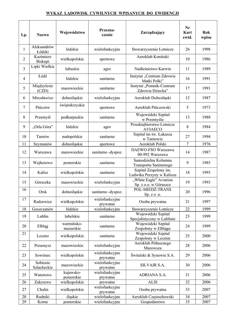 WYKAZ LĄDOWISK CYWILNYCH WPISANYCH