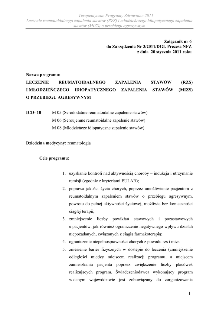 Terapeutyczne Programy Zdrowotne 2011 Leczenie reumatoidalnego zapalenia stawów (RZS) i młodzieńczego idiopatycznego zapalenia stawów (MIZS) o przebiegu agresywnym Załącznik nr 6 do Zarządzenia Nr 3/2011/DGL Prezesa NFZ z dnia 20 stycznia 2011 roku Nazwa programu: LECZENIE REUMATOIDALNEGO I MŁODZIEŃCZEGO ZAPALENIA IDIOPATYCZNEGO ZAPALENIA STAWÓW STAWÓW (RZS) (MIZS) O PRZEBIEGU AGRESYWNYM ICD- 10 M 05 (Serododatnie reumatoidalne zapalenie stawów) M 06 (Seroujemne reumatoidalne zapalenie stawów) M 08 (Młodzieńcze idiopatyczne zapalenie stawów) Dziedzina medycyny: reumatologia Cele programu: 1. uzyskanie kontroli nad aktywnością choroby – indukcja i utrzymanie remisji (zgodnie z kryteriami EULAR); 2. poprawa jakości życia chorych, poprzez umożliwienie pacjentom z reumatoidalnym zapaleniem stawów o przebiegu agresywnym, powrotu do pełnej aktywności życiowej, możliwie bez konieczności ciągłej terapii; 3. zmniejszenie liczby powikłań stawowych i pozastawowych u pacjentów, jak również ograniczenie negatywnego wpływu działań niepożądanych, związanych z ciągłą farmakoterapią; 4. ograniczenie niepełnosprawności chorych z powodu rzs i mizs. 5. zniesienie barier fizycznych w dostępie do leczenia (zmniejszenie odległości miedzy miejscem realizacji programu, a miejscem zamieszkania pacjenta poprzez zwiększenie liczby placówek realizujących program. Świadczeniodawca wykonujący program w danym województwie jest zobowiązany do zorganizowania 1 Terapeutyczne Programy Zdrowotne 2011 Leczenie reumatoidalnego zapalenia stawów (RZS) i młodzieńczego idiopatycznego zapalenia stawów (MIZS) o przebiegu agresywnym podania leku pacjentom uczestniczącym w programie, za pośrednictwem świadczeniodawców w powiatach województwa, z uwzględnieniem zarówno dostępności dla świadczeniobiorców, jak i optymalizacji ponoszonych przez płatnika kosztów podania leku. Opis problemu medycznego Reumatoidalne zapalenie stawów (rzs) jest przewlekłą, zapalną, układową chorobą tkanki łącznej, o podłożu autoimmunologicznym, charakteryzującą się nieswoistym, symetrycznym zapaleniem błony maziowej, występowaniem zmian pozastawowych i powikłań narządowych. Choroba prowadzi do uszkodzenia integralności strukturalnej i funkcjonalnej narządu ruchu oraz narządów wewnętrznych, czego konsekwencjami są niepełnosprawność, kalectwo i przedwczesna śmierć chorych. Przebieg choroby jest uwarunkowany wzajemnym oddziaływaniem na organizm elementów inicjujących proces chorobowy oraz mechanizmów odpowiedzialnych za jego rozwój. Komórki stale obecne w stawie, tj. fibroblasty, makrofagi i komórki dendrytyczne, poddawane są działaniom komórek infiltrujących błonę maziową stawu, limfocytów T i B, monocytów i mastocytów. Interakcja między różnymi komórkami a tkanką błony maziowej wyzwala działanie cząsteczek adhezyjnych, które biorą udział w dalszych oddziaływaniach międzykomórkowych oraz w prezentacji antygenu, sekrecji cytokin i enzymów odpowiedzialnych za degradację macierzy. RZS charakteryzuje się symetrycznym zajęciem stawów. Na początku zajęte są stawy rąk (stawy międzypaliczkowe bliższe, stawy śródręczno-paliczkowe), stawy nadgarstkowe, stawy stóp (stawy międzypaliczkowe stóp, stawy śródstopno-paliczkowe), potem także inne stawy (stawy kolanowe, barkowe, łokciowe, biodrowe, skokowe, skroniowo-żuchwowe, szyjny odcinek kręgosłupa). Występuje bolesność, obrzęk oraz ograniczenie ruchomości zajętych stawów. W późnym okresie widoczne są deformacje stawów (podwichnięcia, deformacje typu łabędziej szyjki/palce butonierkowe, odchylenie łokciowe). Choroba atakuje także tkanki okołostawowe oraz pozastawowe. Objawy pozastawowe rzs to: guzki reumatoidalne, zajęcie serca i płuc, objawy oczne, zajęcie układu nerwowego, zespół Felty’ego, zapalenie naczyń, zespół Sjögrena, amyloidoza. Przebieg kliniczny stanowi podstawę do wyodrębnienia następujących typów choroby: 2 Terapeutyczne Programy Zdrowotne 2011 Leczenie reumatoidalnego zapalenia stawów (RZS) i młodzieńczego idiopatycznego zapalenia stawów (MIZS) o przebiegu agresywnym - typ samoograniczający – cechuje go łagodny przebieg, rzadkie występowanie czynnika reumatoidalnego, dobra odpowiedź na leki modyfikujące, częściej niż w innych typach występuje pełna remisja choroby; - typ z niewielką progresją choroby – słabsza odpowiedź na leczenie lekami modyfikującymi przebieg choroby, stały powolny postęp zmian stawowych; - typ z szybką progresją choroby - wysokie miano czynnika reumatoidalnego u większości chorych od początku choroby, ograniczona odpowiedź na tradycyjne leki modyfikujące, stała szybka progresja zmian i postępująca destrukcja stawów, szybki rozwój niepełnosprawności i inwalidztwa. Młodzieńcze idiopatyczne zapalenie stawów (mizs) jest najczęstszą przewlekłą artropatią w wieku rozwojowym. Pojęcie to jest wspólne dla zapaleń stawów rozpoczynających się przed 16 rokiem życia i trwających co najmniej 6 tygodni. Warunkiem jest wykluczenie innych przyczyn zapaleń stawów jak np. infekcyjne zapalenie stawów, reaktywne zapalenie stawów, alergiczne i toksyczne zapalenie stawów, artropatie występujące w przebiegu chorób nowotworowych, chorób krwi, chorób metabolicznych i in. Obraz kliniczny początkowego okresu choroby (pierwszych 6 miesięcy) warunkuje dalszy jej przebieg. Wyróżniamy 3 podstawowe typy początku mizs: - początek uogólniony (ok. 20% chorych), przebiegający z hektyczną gorączką, wysypkami, powiększonymi węzłami chłonnymi oraz wątrobą i/lub śledzioną, z objawami zapalenia stawów i błon surowiczych; - początek wielostawowy (ok. 30% chorych) przebiegający z zapaleniem, co najmniej 5 stawów, stanami podgorączkowymi, miernym podwyższeniem wskaźników ostrej fazy, obniżeniem wartości Hb, obecnością czynnika reumatoidalnego klasy 