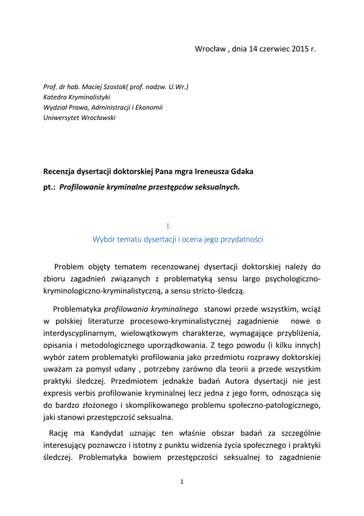 Wrocław , dnia 14 czerwiec 2015 r. Prof. dr hab. Maciej Szostak( prof. nadzw. U.Wr.) Katedra Kryminalistyki Wydział Prawa, Administracji i Ekonomii Uniwersytet Wrocławski Recenzja dysertacji doktorskiej Pana mgra Ireneusza Gdaka pt.: Profilowanie kryminalne przestępców seksualnych. I. Wybór tematu dysertacji i ocena jego przydatności Problem objęty tematem recenzowanej dysertacji doktorskiej należy do zbioru zagadnień związanych z problematyką sensu largo psychologicznokryminologiczno-kryminalistyczną, a sensu stricto-śledczą. Problematyka profilowania kryminalnego stanowi przede wszystkim, wciąż w polskiej literaturze procesowo-kryminalistycznej zagadnienie nowe o interdyscyplinarnym, wielowątkowym charakterze, wymagające przybliżenia, opisania i metodologicznego uporządkowania. Z tego powodu (i kilku innych) wybór zatem problematyki profilowania jako przedmiotu rozprawy doktorskiej uważam za pomysł udany , potrzebny zarówno dla teorii a przede wszystkim praktyki śledczej. Przedmiotem jednakże badań Autora dysertacji nie jest expresis verbis profilowanie kryminalnej lecz jedna z jego form, odnosząca się do bardzo złożonego i skomplikowanego problemu społeczno-patologicznego, jaki stanowi przestępczość seksualna. Rację ma Kandydat uznając ten właśnie obszar badań za szczególnie interesujący poznawczo i istotny z punktu widzenia życia społecznego i praktyki śledczej. Problematyka bowiem przestępczości seksualnej to zagadnienie 1 należące do szczególnego typu problemów wymagających z pewnością nie tylko wiedzy specjalnej w zakresie procesów rozpoznawczych, wykrywczych, dowodowych czy profilaktyczno-prewencyjnych ale i wiedzy w zakresie nauk społecznych i penalnych w tym kryminologii czy wiktymologii . Z ww. powodów wybór tematu przedmiotowej dysertacji oceniam pozytywnie. II. Ocena zawartości merytorycznej dysertacji . Praca doktorska Pana I. Gdaka składa się z: VII rozdziałów , wstępu, podsumowania i wniosków oraz spisu bibliograficznego. W rozdziale pierwszym pt.: Kryminologiczne ujęcie przestępczości seksualnej i jej problematyki Autor dokonał umiejętnego wprowadzenia do problematyki przestępczości seksualnej uwzględniając zagadnienia: etiologiczne, biologiczne ,społeczne i kulturowe, a także czynniki ryzyka, procesu resocjalizacji i leczenia przestępców seksualnych oraz problematykę urazów i ich skutków wywołanych u ofiar przestępstw seksualnych . Rozdział II pt.: Charakterystyka przestępstw na tle seksualnym stanowi dobre wprowadzenie czytelnika w zakres społecznych zagadnień związanych z przestępczością seksualną w aspekcie społeczno-patologicznym, kryminologicznym , kulturowym, karno-prawno-publicznym. Rozdział trzeci poświęcony Taktyce wykrywania przestępstw na tle seksualnym stanowi dobrze przemyślaną i skonstruowaną „narrację” wprowadzającą czytelnika w zakres karno-prawno-procesowy, ze szczególnym akcentem taktyczno-kryminalistycznym, związanym z czynnościami 2 wykrywczymi . Ma rację Doktorant twierdząc iż: „(…) Wykrywanie sprawców przestępstw seksualnych należy do najtrudniejszych ze wszystkich kategorii przestępstw”(…). (wstęp) Dopiero rozdział IV stanowi expresis verbis charakterystykę problematyki profilowania kryminalnego sensu stricto. Autor odniósł się w nim do zagadnień umiejscowienia profilowania w systemie czynności śledczych tj.: rozpytanie, i przesłuchanie, a przede wszystkim przedstawił syntetycznie historię profilowania, jako metody śledczej opierając się w przeważającej mierze na anglo-amerykańskiej literaturze przedmiotu. Problematyka profilowania kryminalnego umiejscowiona w systemie tzw. analizy kryminalnej wydaje się ciekawą metodologiczną propozycją wychodzącą na przeciw nowym, naukowośledczym trendom poznawczym. „(…)Ściśle biorąc , FBI zrezygnowało ze stosowania terminu „ profilowanie kryminalne” ( a także podobnych jak „profilowanie psychologiczne” czy „profilowanie zachowania”) dla opisu metod badania zachowania przestępczego. Zostały one zastąpione szeroko rozumianym „ blankietowym” zwrotem „kryminalna analiza śledcza” obejmującym profilowanie, ale także pośrednie oszacowanie osobowości, analizę przypadków wątpliwych co do przyczyny śmierci i propozycje co do strategii procesowej. W tym kontekście celem profilowania jest określenie takich cech niezidentyfikowanego przestępcy, które umożliwiają wyróżnienie go w populacji generalnej(…).” ( str. 109). Dalsze zagadnienia omówione w tym rozdziale odnoszą się do podstaw metodyki profilowania i praktyk tworzenia profilu. Rozdział V-ty pt.: Metodologiczna charakterystyka profilowania obejmuje zagadnienia: przedmiotu profilowania, wyjściowej bazy informacyjnej, generalizacji, rozumowania i odrębnie zagadnienia profilowania jako dowodu naukowego. Rozdział VI- najobszerniejszy, oceniam najwyżej. Autor dokonał w nim omówienia kluczowych zagadnień związanych z tworzeniem etapów budowy profilu sprawców seksualnych, roli i funkcji profilowania przestępstw na tle seksualnym, ustalania modus operandi sprawców przestępstw seksualnych, rozpoznawania motywów przestępstw seksualnych, analizy tzw. podpisu 3 sprawców przestępstw seksualnych, wnioskowania z oględzin zwłok ofiary oraz miejsc przestępstw profilowania sprawców zgwałceń, czy zabójstw seksualnych. Rozdział VII –ostatni, pt. Problematyka funkcjonowania i ewolucji specyfiki profilowania kryminalnego przestępców seksualnych zawiera: prawne podstawy profilowania, charakterystyki osoby tzw. „ profilera”,możliwości wykorzystania profilowania przestępców seksualnych w procesie karnym oraz zamówienie profilu jako dokumentu. Reasumując stwierdzam, że zakres i ułożenie treści dysertacji wskazuje na sprawną orientację Doktoranta w przedmiocie nauk penalnych, potrzebną w odniesieniu do realizacji założonego zamierzenia badawcze