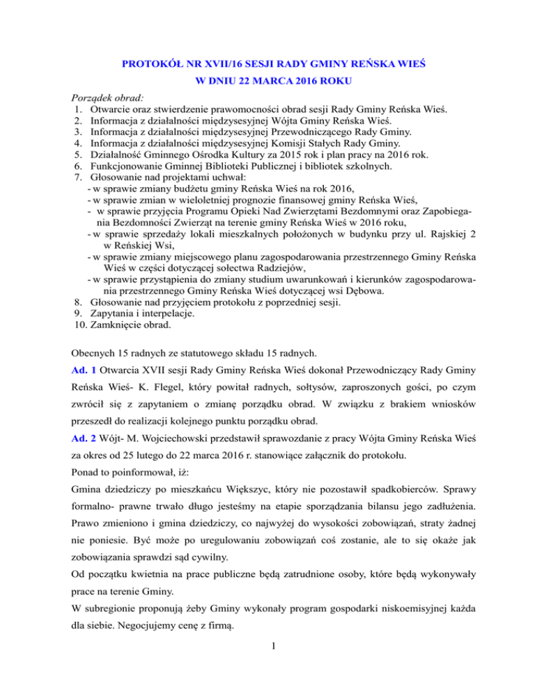PROTOKÓŁ NR XVII/16 SESJI RADY GMINY REŃSKA WIEŚ W DNIU 22 MARCA 2016 ROKU Porządek obrad: 1. Otwarcie oraz stwierdzenie prawomocności obrad sesji Rady Gminy Reńska Wieś. 2. Informacja z działalności międzysesyjnej Wójta Gminy Reńska Wieś. 3. Informacja z działalności międzysesyjnej Przewodniczącego Rady Gminy. 4. Informacja z działalności międzysesyjnej Komisji Stałych Rady Gminy. 5. Działalność Gminnego Ośrodka Kultury za 2015 rok i plan pracy na 2016 rok. 6. Funkcjonowanie Gminnej Biblioteki Publicznej i bibliotek szkolnych. 7. Głosowanie nad projektami uchwał: - w sprawie zmiany budżetu gminy Reńska Wieś na rok 2016, - w sprawie zmian w wieloletniej prognozie finansowej gminy Reńska Wieś, - w sprawie przyjęcia Programu Opieki Nad Zwierzętami Bezdomnymi oraz Zapobiegania Bezdomności Zwierząt na terenie gminy Reńska Wieś w 2016 roku, - w sprawie sprzedaży lokali mieszkalnych położonych w budynku przy ul. Rajskiej 2 w Reńskiej Wsi, - w sprawie zmiany miejscowego planu zagospodarowania przestrzennego Gminy Reńska Wieś w części dotyczącej sołectwa Radziejów, - w sprawie przystąpienia do zmiany studium uwarunkowań i kierunków zagospodarowania przestrzennego Gminy Reńska Wieś dotyczącej wsi Dębowa. 8. Głosowanie nad przyjęciem protokołu z poprzedniej sesji. 9. Zapytania i interpelacje. 10. Zamknięcie obrad. Obecnych 15 radnych ze statutowego składu 15 radnych. Ad. 1 Otwarcia XVII sesji Rady Gminy Reńska Wieś dokonał Przewodniczący Rady Gminy Reńska Wieś- K. Flegel, który powitał radnych, sołtysów, zaproszonych gości, po czym zwrócił się z zapytaniem o zmianę porządku obrad. W związku z brakiem wniosków przeszedł do realizacji kolejnego punktu porządku obrad. Ad. 2 Wójt- M. Wojciechowski przedstawił sprawozdanie z pracy Wójta Gminy Reńska Wieś za okres od 25 lutego do 22 marca 2016 r. stanowiące załącznik do protokołu. Ponad to poinformował, iż: Gmina dziedziczy po mieszkańcu Większyc, który nie pozostawił spadkobierców. Sprawy formalno- prawne trwało długo jesteśmy na etapie sporządzania bilansu jego zadłużenia. Prawo zmieniono i gmina dziedziczy, co najwyżej do wysokości zobowiązań, straty żadnej nie poniesie. Być może po uregulowaniu zobowiązań coś zostanie, ale to się okaże jak zobowiązania sprawdzi sąd cywilny. Od początku kwietnia na prace publiczne będą zatrudnione osoby, które będą wykonywały prace na terenie Gminy. W subregionie proponują żeby Gminy wykonały program gospodarki niskoemisyjnej każda dla siebie. Negocjujemy cenę z firmą. 1 Pojawił się przedstawiciel firmy, zainteresowanej budową stacji benzynowej w okolicy ronda w Reńskiej Wsi. Nie jest to pierwsza osoba zainteresowana tą lokalizacją inwestycji. Pośredniczymi w rozmowach z osobą prywatną. Na spotkaniu w Miejskich Wodociągach i Kanalizacji w Kędzierzynie- Koźlu w sprawie budowy tranzytu kanalizacji sanitarnej większość zarzutów pana Radnego została wyjaśniona. Ad. 3 Sprawozdanie z pracy Przewodniczącego Rady Gminy- K. Flegel w okresie od 25 lutego do 22 marca 2016 r.: - 5 marca- Zjazd Gminny TSKN. - 14 marca- udział w części posiedzenia Komisji Społeczno- Oświatowej. - 16 marca- udział w części posiedzenia Komisja Finansowo- Gospodarcza, - spotkanie w sprawie kupna prze Gminę działki w Reńskiej Wsi. - 21 marca- udział w posiedzeniu Komisji Rewizyjnej, Spotkanie w sprawie pisma pana Pazurka, który chce zbyć działki na rzecz gminy. W spotkaniu udział wzięli ks. Proboszcz, Wójt. Idea była tak chce to sprzedać dlatego, że otrzymał za stosowne pieniądze urząd gminy bo tam od pewnego czasu parking istnieje. Podał kwotę 80.000 zł i z tej kwoty nie chce się wycofać. W poczcie wpłynęły pisma: 24 lutego- Radnego Domina do Regionalnej Dyrekcji Ochrony Środowiska w Opolu w sprawie budowy rurociągu tłocznego kanalizacji sanitarnej z Dębowej. 4 marca- List Komitetu dla Samorządności dotyczących miejscowości Dąbrowa, Dobrzeń Wielki, Komprachcice, Pruszków i Turawa sprzeciw w sprawie niszczenia idei samorządności i braku poszanowania głosu sprzeciwu społeczeństwa wobec pomysłu Prezydenta Opola poszerzenia granic Opola. 7 marca- Rady Sołeckiej Większyc i Radziejowa oraz Zarządu Mniejszości o wydłużeniu czasu pracy oddziału przedszkola w roku szkolnym 2016/ 2017. Pismo to nie do rady tylko do Wicewójta- Domka należy skierować. Uchwała Rady Miejskiej w Krapkowicach, gdzie informują, że kierują pismo do pani Premier Beaty Szydło i pani Minister Edukacji Anny Zalewskiej w sprawie utworzenia zasiłków wyrównawczych dla dzieci 6-letnich pozostających rok dłużej w przedszkolach. Pismo przekaże Z-cy Wójta- J. Domek. 10 marca- pismo Rady Miejskiej w Prószkowie, która informuje, że popiera apel Sejmiku Samorządowego Województwa Opolskiego w sprawie współfinansowania Muzeum w Łambinowicach przez Ministra Kultury i Dziedzictwa Narodowego. 16 marca- pismo dotyczące uzgodnień zmian w Statucie Związku Gmin Śląska Opolskiego. 2 Od 1 stycznia 2016 r. obowiązują nowe przepisy znowelizowanej ustawy z dnia 8 marca 1990 r. o samorządzie gminnym i wszelkie zmiany w statutach muszą być konsultowane z Wojewodą. Ad. 4 Przewodniczący Rady Gminy- K. Flegel przekazał, kolejno głos przewodniczącym Komisji e Stałych Rady Gminy Reńska Wieś w celu przedstawienia informacji z działalności Komisji w okresie od 25 lutego do 22 marca 2016 r. Przewodnicząca Komisji Rewizyjnej- I. Mainka: Komisja Rewizyjna miała posiedzenie 21 marca. Tematem posiedzenia była analiza dokumentacji przetargowej z 2015 roku wybranych zadań inwestycyjnych. W 2015 roku było przeprowadzonych 6 postępowań przetargowych powyżej 30.000 euro. Pierwszy przetarg przeprowadzony był na budowę dróg dojazdowych do gruntów rolnych w Długomiłowicach i na Dębowej, drugi przetarg. Przebudowa ul. Strażaków w Gierałtowicach, trzeci Remont ul. Bocznej 