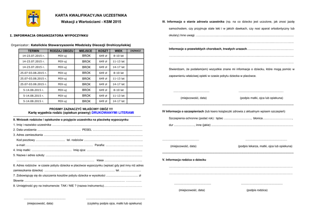 KARTA KWALIFIKACYJNA UCZESTNIKA Wakacji z Wartościami - KSM 2015 III. Informacja o stanie zdrowia uczestnika (np. na co dziecko jest uczulone, jak znosi jazdę samochodem, czy przyjmuje stale leki i w jakich dawkach, czy nosi aparat ortodontyczny lub I. INFORMACJA ORGANIZATORA WYPOCZYNKU okulary) Inne uwagi. ………………….……...................................................................................... Organizator: Katolickie Stowarzyszenie Młodzieży Diecezji Drohiczyńskiej TERMIN RODZAJ OBOZU MIEJSCE KOSZT WIEK ZAZNACZ ……………………………………………………….............…………………………...……………....... Informacje o przewlekłych chorobach, trwałych urazach…………………………………..……. 14-23.07.2015 r. MIX-uj BROK 649 zł 8-10 lat ………………………………………………………………………………...…………………………….. 14-23.07.2015 r. MIX-uj BROK 649 zł 11-13 lat ……………………………………………………….............…………………………...……………....... 14-23.07.2015 r. MIX-uj BROK 649 zł 14-17 lat 25.07-03.08.2015 r. MIX-uj BROK 649 zł 8-10 lat 25.07-03.08.2015 r. MIX-uj BROK 649 zł 11-13 lat 25.07-03.08.2015 r. MIX-uj BROK 649 zł 14-17 lat 5-14.08.2015 r. MIX-uj BROK 649 zł 8-10 lat 5-14.08.2015 r. MIX-uj BROK 649 zł 11-13 lat 5-14.08.2015 r. MIX-uj BROK 649 zł 14-17 lat Stwierdzam, że podałam(em) wszystkie znane mi informacje o dziecku, które mogą pomóc w zapewnieniu właściwej opieki w czasie pobytu dziecka w placówce. ............................................ (miejscowość, data) ....................................................... (podpis matki, ojca lub opiekuna) -------------------------------------------------------------------------------------------------------------------------------------PROSIMY ZAZNACZYĆ WŁAŚCIWY OBÓZ !!!! Kartę wypełnia rodzic (opiekun prawny) DRUKOWANYMI LITERAMI IV Informacja o szczepieniach (lub ksero książeczki zdrowia z aktualnym wpisem szczepień) ---------------------------------------------------------------------------------------------------------------------------------II. Wniosek rodziców / opiekunów o przyjęcie uczestnika na placówkę wypoczynku Szczepienia ochronne (podać rok) : tężec ................................., błonica...................................., 1. Imię i nazwisko uczestnika …………................................................................................................ dur ........................., inne (jakie) .................................................................................................... 2. Data urodzenia ..................................................... PESEL ............................................................. 3. Adres zamieszkania ......................................................................................................................... Kod pocztowy .................................... tel. rodziców ........................................................................ e-mail:……………………...................................................... Parafia: …………………………..….... 4. Imię matki: ................................................. Imię ojca: .................................................................... 5. Nazwa i adres szkoły: ...................................................................................................................... ............................................................................................... klasa .............................................. 6. Adres rodziców w czasie pobytu dziecka w placówce wypoczynku (wpisać gdy jest inny niż adres zamieszkania dziecka) ……............................................................................... tel. ......................... 7. Zobowiązuję się do uiszczenia kosztów pobytu dziecka w wysokości ....................................... zł Słownie ........................................................................................................................... ……………. 8. Umiejętność gry na instrumencie: TAK / NIE ? (nazwa instrumentu)………………………………… ............................................. (miejscowość, data) (miejscowość, data) ........................................................................ (czytelny podpis ojca, matki lub opiekuna) (podpis lekarza, matki, ojca lub opiekuna) -------------------------------------------------------------------------------------------------------------------------------------V. Informacja rodzica o dziecku ……………………………………………………………………………………………………………… ……………………………………………………………………………………………………………… ............................................. (miejscowość, data) ................................................... ................................................... ................................................... (podpis rodzica) VI. Decyzja o kwalifikacji uczestnika X. Akceptacja warunków obozu Postanawia się: 1. Zakwalifikować i skierować dziecko do placówki wypoczynku 2. Odmówić skierowania dziecka ze względu na ...................................................................... ............................................. ................................................... (miejscowość, data) (podpis organizatora) ------------------------------------------------------------------------------------------------------------------------------------VII. Potwierdzenie pobytu uczestnika w placówce wypoczynku Uczestnik przebywał na warsztatach …………………....……….…. w dniach ……………...…………… ...............