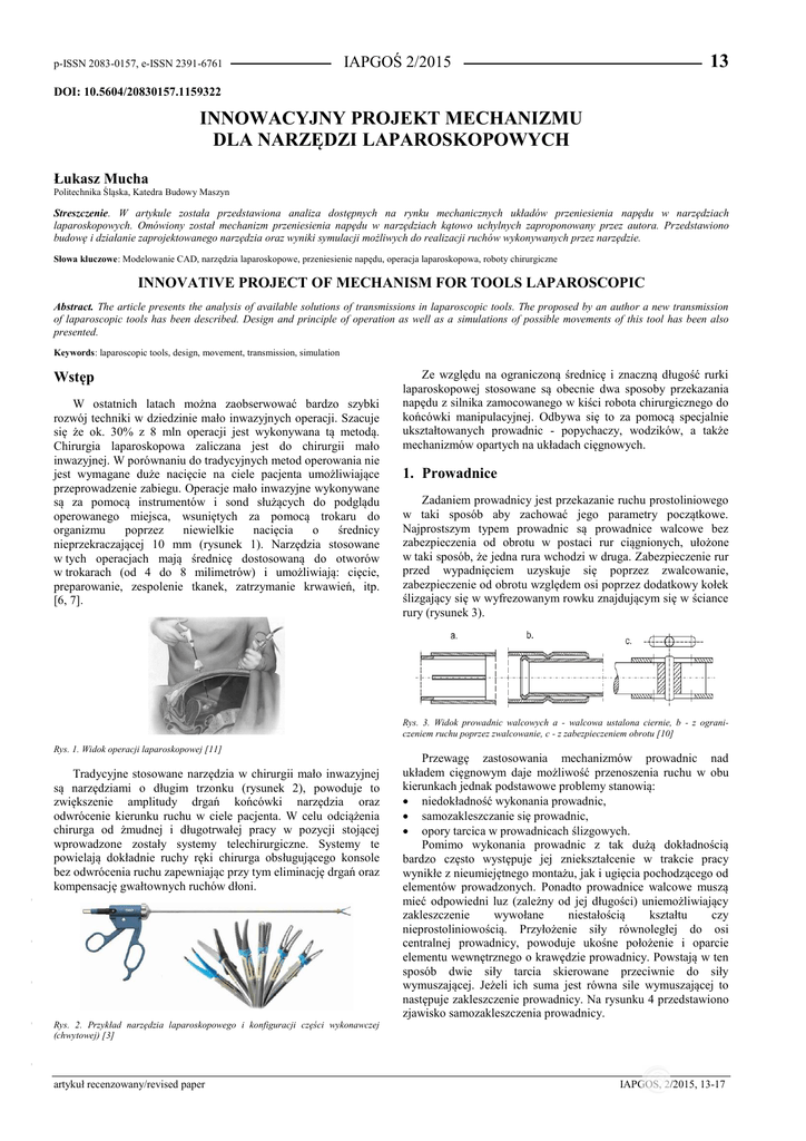 p-ISSN 2083-0157, e-ISSN 2391-6761 IAPGOŚ 2/2015 13 DOI: 10.5604/20830157.1159322 INNOWACYJNY PROJEKT MECHANIZMU DLA NARZĘDZI LAPAROSKOPOWYCH Łukasz Mucha Politechnika Śląska, Katedra Budowy Maszyn Streszczenie. W artykule została przedstawiona analiza dostępnych na rynku mechanicznych układów przeniesienia napędu w narzędziach laparoskopowych. Omówiony został mechanizm przeniesienia napędu w narzędziach kątowo uchylnych zaproponowany przez autora. Przedstawiono budowę i działanie zaprojektowanego narzędzia oraz wyniki symulacji możliwych do realizacji ruchów wykonywanych przez narzędzie. Słowa kluczowe: Modelowanie CAD, narzędzia laparoskopowe, przeniesienie napędu, operacja laparoskopowa, roboty chirurgiczne INNOVATIVE PROJECT OF MECHANISM FOR TOOLS LAPAROSCOPIC Abstract. The article presents the analysis of available solutions of transmissions in laparoscopic tools. The proposed by an author a new transmission of laparoscopic tools has been described. Design and principle of operation as well as a simulations of possible movements of this tool has been also presented. Keywords: laparoscopic tools, design, movement, transmission, simulation Wstęp W ostatnich latach można zaobserwować bardzo szybki rozwój techniki w dziedzinie mało inwazyjnych operacji. Szacuje się że ok. 30% z 8 mln operacji jest wykonywana tą metodą. Chirurgia laparoskopowa zaliczana jest do chirurgii mało inwazyjnej. W porównaniu do tradycyjnych metod operowania nie jest wymagane duże nacięcie na ciele pacjenta umożliwiające przeprowadzenie zabiegu. Operacje mało inwazyjne wykonywane są za pomocą instrumentów i sond służących do podglądu operowanego miejsca, wsuniętych za pomocą trokaru do organizmu poprzez niewielkie nacięcia o średnicy nieprzekraczającej 10 mm (rysunek 1). Narzędzia stosowane w tych operacjach mają średnicę dostosowaną do otworów w trokarach (od 4 do 8 milimetrów) i umożliwiają: cięcie, preparowanie, zespolenie tkanek, zatrzymanie krwawień, itp. [6, 7]. Ze względu na ograniczoną średnicę i znaczną długość rurki laparoskopowej stosowane są obecnie dwa sposoby przekazania napędu z silnika zamocowanego w kiści robota chirurgicznego do końcówki manipulacyjnej. Odbywa się to za pomocą specjalnie ukształtowanych prowadnic - popychaczy, wodzików, a także mechanizmów opartych na układach cięgnowych. 1. Prowadnice Zadaniem prowadnicy jest przekazanie ruchu prostoliniowego w taki sposób aby zachować jego parametry początkowe. Najprostszym typem prowadnic są prowadnice walcowe bez zabezpieczenia od obrotu w postaci rur ciągnionych, ułożone w taki sposób, że jedna rura wchodzi w druga. Zabezpieczenie rur przed wypadnięciem uzyskuje się poprzez zwalcowanie, zabezpieczenie od obrotu względem osi poprzez dodatkowy kołek ślizgający się w wyfrezowanym rowku znajdującym się w ściance rury (rysunek 3). Rys. 3. Widok prowadnic walcowych a - walcowa ustalona ciernie, b - z ograniczeniem ruchu poprzez zwalcowanie, c - z zabezpieczeniem obrotu [10] Rys. 1. Widok operacji laparoskopowej [11] Rys. 2. Przykład narzędzia laparoskopowego i konfiguracji części wykonawczej (chwytowej) [3] Przewagę zastosowania mechanizmów prowadnic nad układem cięgnowym daje możliwość przenoszenia ruchu w obu kierunkach jednak podstawowe problemy stanowią: niedokładność wykonania prowadnic, samozakleszczanie się prowadnic, opory tarcica w prowadnicach ślizgowych. Pomimo wykonania prowadnic z tak dużą dokładnością bardzo często występuje jej zniekształcenie w trakcie pracy wynikłe z nieumiejętnego montażu, jak i ugięcia pochodzącego od elementów prowadzonych. Ponadto prowadnice walcowe muszą mieć odpowiedni luz (zależny od jej długości) uniemożliwiający zakleszczenie wywołane niestałością kształtu czy nieprostoliniowością. Przyłożenie siły równoległej do osi centralnej prowadnicy, powoduje ukośne położenie i oparcie elementu wewnętrznego o krawędzie prowadnicy. Powstają w ten sposób dwie siły tarcia skierowane przeciwnie do siły wymuszającej. Jeżeli ich suma jest równa sile wymuszającej to następuje zakleszczenie prowadnicy. Na rysunku 4 przedstawiono zjawisko samozakleszczenia prowadnicy. - - - - - Tradycyjne stosowane narzędzia w chirurgii mało inwazyjnej są narzędziami o długim trzonku (rysunek 2), powoduje to zwiększenie amplitudy drgań końcówki narzędzia oraz odwrócenie kierunku ruchu w ciele pacjenta. W celu odciążenia chirurga od żmudnej i długotrwałej pracy w pozycji stojącej wprowadzone zostały systemy telechirurgiczne. Systemy te powielają dokładnie ruchy ręki chirurga obsługującego konsole bez odwrócenia ruchu zapewniając przy tym eliminację drgań oraz kompensację gwałtownych ruchów dłoni. artykuł recenzowany/revised paper IAPGOS, 2/2015, 13-17 IAPGOŚ 2/2015 14 p-ISSN 2083-0157, e-ISSN 2391-6761 zbudowanie szczelnego urządzenia zabezpieczonego przed zanieczyszczeniami, lecz powoduje to znaczny rozrost mechanizmu. Opierając się na mechanizmie starannie wykonanych prowadnic ślizgowych dla powierzchni niesmarowanych metal-metal współczynnik tarcia wynosi 0,15 do 0,22 [2, 10]. Przy projektowaniu układów opartych na prowadnicach należy uwzględnić powyższe zależności, aby swoboda ich ruchu była zapewniona z odpowiednim bezpieczeństwem, uwzględniając opory ruchu powstałe z niewspółosiowości elementów, skośnego działania siły, sił tarcia. 2. Cięgna Rys. 4. Rozkład sił w prowadnicy walcowej obciążonej niewspółosiowo siłą równoległą do osi [10] Uwzględniając parametry geometryczne i przyjęte oznaczenia można zapisać następujące równanie[10]: P T1 T2 b T1 b T2 l 2 e l 1l2 e 2 N e 2 N gdzie: T1, T2 - siła tarcia ≤ N, - współczynnik tarcia, e - ramię działania siły w odniesieniu do osi prowadnicy, l - długość prowadnicy, b - średnica wewnętrzna prowadnicy. Rozwiązaniem równania są warunki