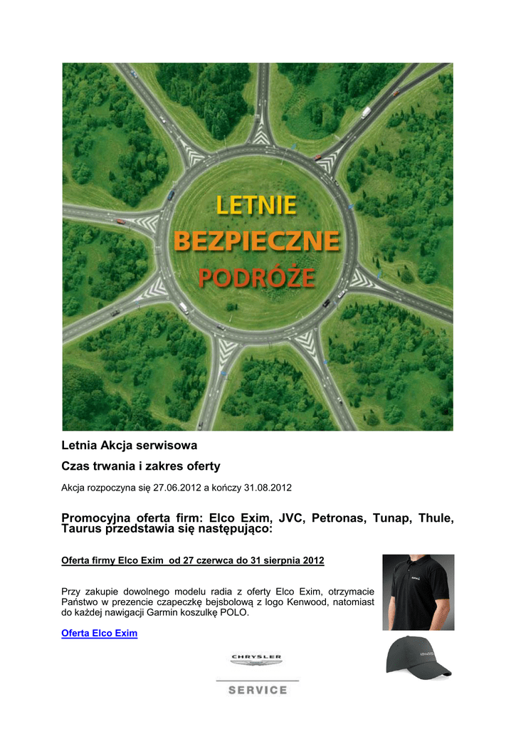 Letnia Akcja serwisowa Czas trwania i zakres oferty Akcja rozpoczyna się 27.06.2012 a kończy 31.08.2012 Promocyjna oferta firm: Elco Exim, JVC, Petronas, Tunap, Thule, Taurus przedstawia się następująco: Oferta firmy Elco Exim od 27 czerwca do 31 sierpnia 2012 Przy zakupie dowolnego modelu radia z oferty Elco Exim, otrzymacie Państwo w prezencie czapeczkę bejsbolową z logo Kenwood, natomiast do każdej nawigacji Garmin koszulkę POLO. Oferta Elco Exim Oferta firmy JVC od 27 czerwca do 31 sierpnia 2012 Szanowni Państwo, zachęcamy do zapoznania się z gamą produktów oferowanych przez JVC, gdzie przy zakupie radioodtwarzacza JVC (modele: KD-R331, KD-R431, KD-SD631, KD-R731BT, KD-X30, KD-X40, KD-X50BT, KD-R50, KD-SD80BT) w Salonach Sprzedaży Fiata, w terminie od dnia 27.06.2012 r. do dnia 31.08.2012 r, otrzymujecie Państwo 40% rabat na kamery cyfrowe JVC. Zakup jednego z wyżej wymienionych radioodtwarzaczy, w czasie trwania promocji, uprawnia do skorzystania z 40% RABATU na dowolny model kamery JVC, w sklepie internetowym http://sklep.jvc.pl Aby uaktywnić 40% RABAT, należy podczas rejestracji w sklepie internetowym, w polu VIP CODE wpisać hasło: FIAT. Szczegółowe informacje znajdą Państwo w załączonym regulaminie JVC. Regulamin Oferta JVC Oferta firmy THULE od 27 czerwca do 31 sierpnia 2012 Przy zakupie haka holowniczego firmy Thule z oferty Fiata otrzymacie Państwo w prezencie T-shirt. Oferta Thule Oferta firmy TAURUS od 27 czerwca do 31 sierpnia 2012 Przy zakupie produktów z oferty firmy Taurus za wyjątkiem nr. Kat 60798058 i 60798060 otrzymacie Państwo kamizelkę odblaskową w prezencie. Oferta Taurus Oferta firmy PETRONAS od 27 czerwca do 31 sierpnia 2012 Przy zakupie 4 litrów oleju z gamy SELENIA, otrzymają Państwo w prezencie SB 01 Arexons, wielozadaniowy preparat 6w1. Uniwersalny środek smarująco-konserwujący posiada szerokie spectrum zastosowań: naniesiony na powierzchnię zapewnia płynną współpracę smarowanych elementów, czyści, penetruje, odblokowuje, usuwa wodę oraz zabezpiecza przed korozją. Oferta Petronas Arexons Oferta Petronas Arexons Tutela Oferta firmy TUNAP 27 czerwca do 31 sierpnia 2012 Do każdej zakupionej pianki czyszczącej kanały powietrzne nr kat.: 59110175 otrzymacie Państwo w prezencie koncentrat płynu do spryskiwaczy nr kat.: 59110645. Oferta Tunap Więcej szczegółów oferty u Dealerów Chrysler