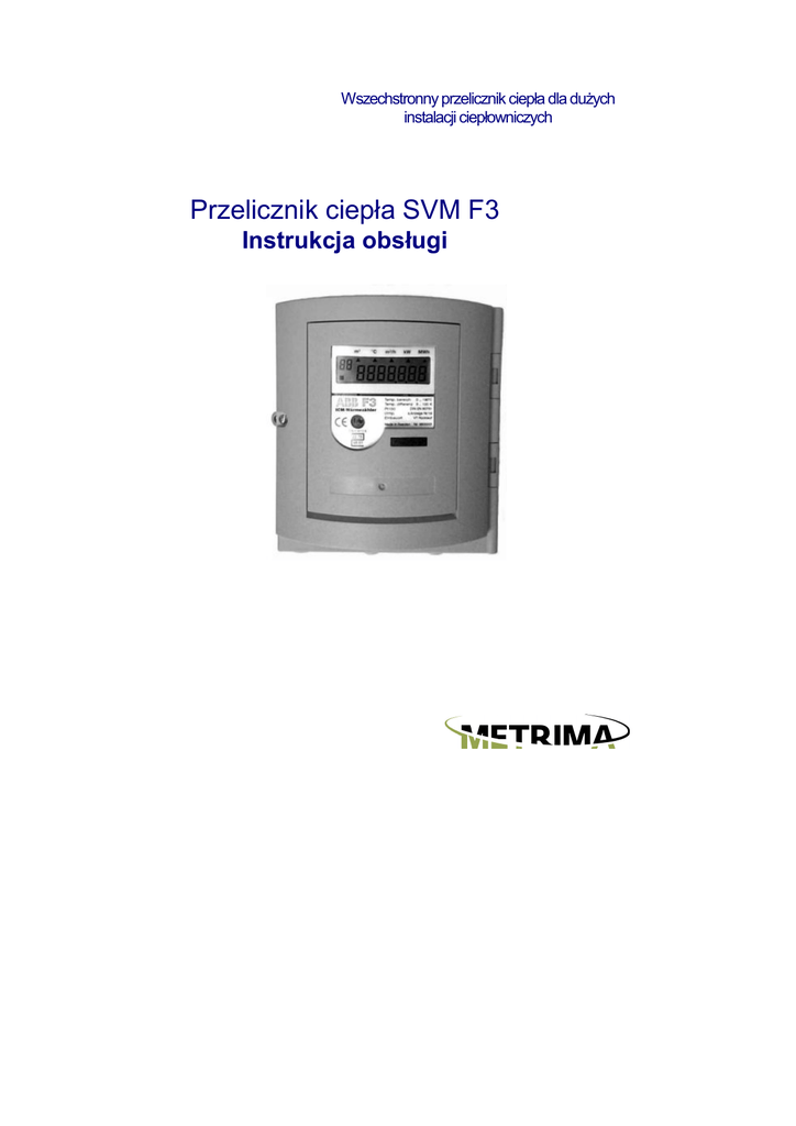 Wszechstronny przelicznik ciepła dla dużych instalacji ciepłowniczych Przelicznik ciepła SVM F3 Instrukcja obsługi 1. Instalacja 3 1.1 Dostawa 3 1.2 Połączenia 3 1.3 Montaż 4 1.4 Test 4 2. Praca 5 2.1 Wyświetlane wielkości 5 2.1.1 Kody błędów 2.1.2 Wartości chwilowe 8 8 2.2 Serwis 8 2.2.1 Ustawianie zegara czasu rzeczywistego 9 2.2.2 Ustawianie daty 10 2.2.3 Ustawianie wartości impulsowania 10 2.2.4 Ustawianie dni rozliczeniowych 10 2.2.5 Ustawianie adresu komunikacyjnego 10 2.2.6 Kasowanie całkowitego czasu trwania błędu przelicznika 10 2.2.7 Miejsce montażu przetwornika przepływu 11 2.2.8 Ustawianie zalecanej daty wymiany baterii 11 2.2.9 Powrót z trybu serwisowego 11 3. Plomby 12 4. Tryb testowy 13 5. Dane techniczne 14 5.1 Zasilanie 14 5.1.1 Zanik zasilania 14 5.2 Czujniki temperatury 14 5.3 Przepływomierz 14 5.4 Dynamika 14 5.5 Zakresy temperatur 14 5.6 Wyświetlacz 14 5.7 Wyjście danych 15 5.8 Wyjścia impulsowe 15 5.9 Wejścia impulsowe 15 5.10 Wyjście alarmowe 15 5.11 Temperatura otoczenie / Klasa odporności na środ. 15 5.12 Miejsce montażu przepływomierza 15 5.13 Wartość impulsowania dla max. wartości mocy 15 5.14 Karty rozszerzeń 6. Wyjście danych 16 17 po opuszczeniu trybu transport przelicznik ustawia się w trybie serwis. W trybie serwis można zmieniać niektóre ustawienia przelicznika. Szczegóły p. 2.2. Serwis. 1. Instalacja 1.1 Dostawa SVM F3 jest dostarczany w trybie transport. Oznacza to, że aktywny jest tylko zegar czasu rzeczywistego. Brak jakichkolwiek pomiarów w tym trybie. Tryb transport jest zaznaczony poprzez wyświetlanie "no" w lewym górnym rogu. Oznaką tego, że przelicznik opuścił tryb transport, jest zniknięcie "no" na wyświetlaczu i zastąpienie przez: "00" – tryb serwis. 1.2 Połączenia Rysunek 1 oraz tabela 1 przedstawia podłączenia przewodów. Zanim rozpoczniemy instalacje przelicznik musi być ustawiony w trybie praca. Odbywa się to poprzez naciskanie przycisku przez około 5 sekund. Zazwyczaj Podłączenia przewodów opisane są poniżej: Złącze nr. Zgodnie z EN1434 1 Opis sygnału Czujnik temperatury zasilania * 2 Czujnik temperatury zasilania * 3 Czujnik temperatury powrotu * 4 Czujnik temperatury powrotu * 5 Czujnik temperatury zasilania 6 Czujnik temperatury zasilania 7 Czujnik temperatury powrotu 8 Czujnik temperatury powrotu 10 Przepływomierz wejście sygnałowe(+) 11 Przepływomierz wyjście sygnałowe(-) 24 Interfejs komunikacyjny bus 25 Interfejs komunikacyjny bus Sygnały oznaczone * wykorzystuje się tylko przy podłączeniach 4przewodowych. 3 Rysunek 1 Oznaczenia podłączeń zacisków, w dolnej listwie, czytane od lewej strony: 5, 1, 2, 6, 3, 7, 8, 4, 10, 11, 24, 25. 1.3 Montaż SVM F3 jest przeznaczony do montażu na ścianie. 1.4 Test Po zakończeniu instalacji trzeba przeprowadzić prosty test sprawdzający poprawność montażu przelicznika. Należy poczekać na nadejście impulsu z przepływomierza. Impuls powinien zostać zasygnalizowany poprzez pojawienie się na wyświetlaczu symbolu oznaczającego impulsowanie, patrz p.2.1, i wyświetlenie prawidłowych temperatur. Ponadto należy sprawdzić, czy wbudowany zegar czasu rzeczywistego pracuje poprawnie. patrz p.2.2. Serwis. 4 2. Praca Wygląd wyświetlacza: 2.1 Wyświetlane wielkości SVM F3 posiada wyświetlacz LCD (ciekłokrystaliczny) – rys 3. Opcjonalnie wyświetlacz możne być podświetlany. Podświetlenie następuje po naciśnięciu przycisku, gaśnie zaś gdy przycisk nie był naciskany przez zdefiniowany czas 2 1 3 4 Rysunek 2 1. Cyfry sekwencji określające wyświetlaną wartość 2. Strzałka pod jednostką wyświetlanej wartości 3. Punkt zapalający się przy każdym impulsie z przepływomierza 4. Wartość bieżąca, max. 7 cyfr. Wartości przedstawiane są w sekwencjach. Lewa cyfra z zestawu (patrz rys. 2) określa numer sekwencji. Prawa cyfra określa która wartość w danej sekwencji jest wyświetlana. Krótkie, szybkie naciśnięcie przycisku powoduje przejście do następnej wartości w danej, sekwencji. Aby zmienić sekwencję należy trzymać przyciśnięty przycisk do czasu, gdy lewa cyfra zacznie się zmieniać. Puścić przycisk przy odpowiedniej wartości. Zmiana drugiej cyfry, czyli wartości w danej sekwencji opisana jest powyżej. Jeśli przycisk nie będzie przyciskany przez określony czas wyświetlacz powróci do pozycji normalnej. Wyświetlacz Przycisk Interfejs-Opto Rysunek 3 5 Tabela 2 przedstawiająca dostępne sekwencje oraz wartości w danej sekwencji. Sekwencja Wartość 1 1 1 1 1 1 1 2 2 2 2 2 3 0 1 2 3 4 5 6 0 1 2 3 4 0 3 3 3 3 3 3 3 1 2 3 4 5 6 7 Opis Energia – Pozycja Normalna Objętość z przepływomierza1 Test wyświetlacza Objętość dla wejścia impulsowego 1 Objętość dla wejścia impulsowego 2 Kod błędu Czas występowania błędu Moc Przepływ Temperatura zasilania Temperatura powrotu Różnica temperatur Dni rozliczeniowe2, Data rejestracji danych dla Energii Objętości z przepływomierza Objętości odpowiadającej zliczonej energii Objętość dla wejścia impulsowego 1 Objętość dla wejścia impulsowego 2 Kod błędu (jeśli wystąpił w tym okresie) Czas występowania błędu (jeśli wystąpił w tym okresie) 1 Format Minuty RRMMDD Minuty SVM F3 posiada dwa rejestry objętości. Jeden rejestr - sekwencja 11, zwiększa się po przyjściu każdego impulsu z przepływomierza. Drugi rejestr - sekwencja 70, zwiększa się tylko wówczas gdy impuls z przepływomierza został wykorzystany do obliczenia energii. 2 Aby zmienić na następny dzień rozliczeniowy należy trzymać przycisk naciśnięty, do momentu gdy data zacznie przyrastać, wtedy puścić. Po wyświetleniu 37, patrz tab., następny dzień rozliczeniowy będzie wyświetlany. Uwaga. Jeśli przycisk zostanie naciśnięty jeszcze raz wyświetlacz wróci do pozycji normalnej. 6 Sekwencja Wartość 4 0 4 4 4 1 2 3 4 4 4 4 5 6 4 7 5 5 5 5 6 A B 6 6 0 1 2 3 0 X X 3 4 7 0 7 1 7 7 7 7 2 3 4 5 Opis Rejestry miesięczn