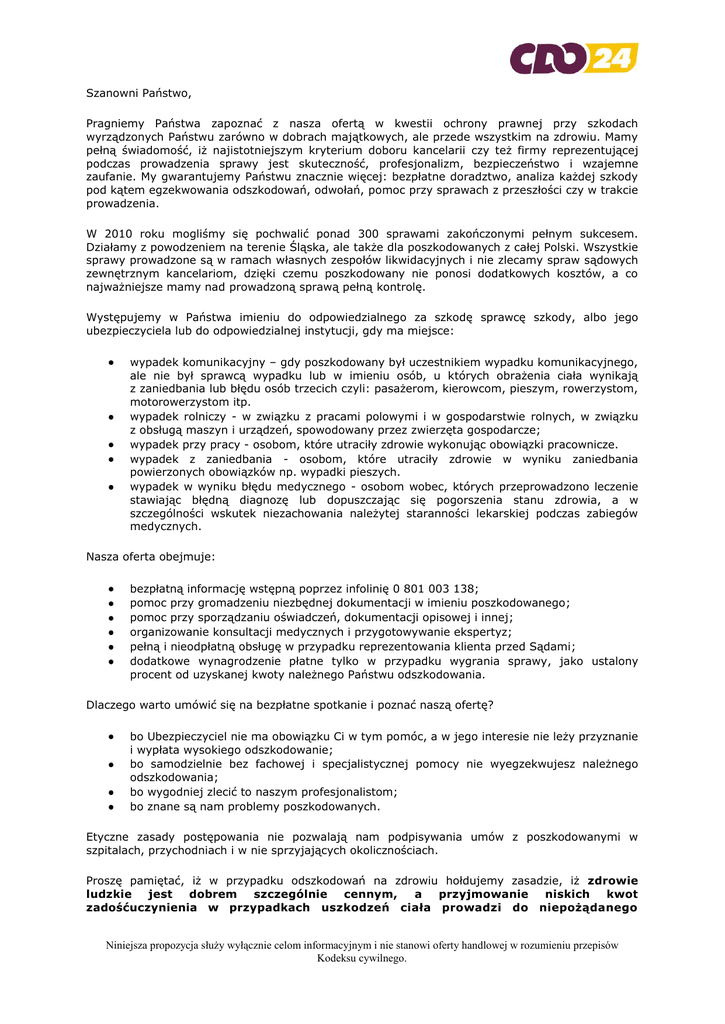 Szanowni Państwo, Pragniemy Państwa zapoznać z nasza ofertą w kwestii ochrony prawnej przy szkodach wyrządzonych Państwu zarówno w dobrach majątkowych, ale przede wszystkim na zdrowiu. Mamy pełną świadomość, iż najistotniejszym kryterium doboru kancelarii czy też firmy reprezentującej podczas prowadzenia sprawy jest skuteczność, profesjonalizm, bezpieczeństwo i wzajemne zaufanie. My gwarantujemy Państwu znacznie więcej: bezpłatne doradztwo, analiza każdej szkody pod kątem egzekwowania odszkodowań, odwołań, pomoc przy sprawach z przeszłości czy w trakcie prowadzenia. W 2010 roku mogliśmy się pochwalić ponad 300 sprawami zakończonymi pełnym sukcesem. Działamy z powodzeniem na terenie Śląska, ale także dla poszkodowanych z całej Polski. Wszystkie sprawy prowadzone są w ramach własnych zespołów likwidacyjnych i nie zlecamy spraw sądowych zewnętrznym kancelariom, dzięki czemu poszkodowany nie ponosi dodatkowych kosztów, a co najważniejsze mamy nad prowadzoną sprawą pełną kontrolę. Występujemy w Państwa imieniu do odpowiedzialnego za szkodę sprawcę szkody, albo jego ubezpieczyciela lub do odpowiedzialnej instytucji, gdy ma miejsce: wypadek komunikacyjny – gdy poszkodowany był uczestnikiem wypadku komunikacyjnego, ale nie był sprawcą wypadku lub w imieniu osób, u których obrażenia ciała wynikają z zaniedbania lub błędu osób trzecich czyli: pasażerom, kierowcom, pieszym, rowerzystom, motorowerzystom itp. wypadek rolniczy - w związku z pracami polowymi i w gospodarstwie rolnych, w związku z obsługą maszyn i urządzeń, spowodowany przez zwierzęta gospodarcze; wypadek przy pracy - osobom, które utraciły zdrowie wykonując obowiązki pracownicze. wypadek z zaniedbania - osobom, które utraciły zdrowie w wyniku zaniedbania powierzonych obowiązków np. wypadki pieszych. wypadek w wyniku błędu medycznego - osobom wobec, których przeprowadzono leczenie stawiając błędną diagnozę lub dopuszczając się pogorszenia stanu zdrowia, a w szczególności wskutek niezachowania należytej staranności lekarskiej podczas zabiegów medycznych. Nasza oferta obejmuje: bezpłatną informację wstępną poprzez infolinię 0 801 003 138; pomoc przy gromadzeniu niezbędnej dokumentacji w imieniu poszkodowanego; pomoc przy sporządzaniu oświadczeń, dokumentacji opisowej i innej; organizowanie konsultacji medycznych i przygotowywanie ekspertyz; pełną i nieodpłatną obsługę w przypadku reprezentowania klienta przed Sądami; dodatkowe wynagrodzenie płatne tylko w przypadku wygrania sprawy, jako ustalony procent od uzyskanej kwoty należnego Państwu odszkodowania. Dlaczego warto umówić się na bezpłatne spotkanie i poznać naszą ofertę? bo Ubezpieczyciel nie ma obowiązku Ci w tym pomóc, a w jego interesie nie leży przyznanie i wypłata wysokiego odszkodowanie; bo samodzielnie bez fachowej i specjalistycznej pomocy nie wyegzekwujesz należnego odszkodowania; bo wygodniej zlecić to naszym profesjonalistom; bo znane są nam problemy poszkodowanych. Etyczne zasady postępowania nie pozwalają nam podpisywania umów z poszkodowanymi w szpitalach, przychodniach i w nie sprzyjających okolicznościach. Proszę pamiętać, iż w przypadku odszkodowań na zdrowiu hołdujemy zasadzie, iż zdrowie ludzkie jest dobrem szczególnie cennym, a przyjmowanie niskich kwot zadośćuczynienia w przypadkach uszkodzeń ciała prowadzi do niepożądanego Niniejsza propozycja służy wyłącznie celom informacyjnym i nie stanowi oferty handlowej w rozumieniu przepisów Kodeksu cywilnego. zaniżenia wartości tegoż dobra (tak orzekł Sąd Najwyższy w uzasadnienie wyroku z dnia 16 lipca 1997 r., sygn. akt II CKN 273/97). OFERTA CENOWA W nasza oferta dla grup zawodowych, to przede wszystkim korzystny rabat, opłaty miesięczne na poziomie kilku złotych od osoby, naliczane adekwatnie do ilości osób objętych ochroną prawną w danym miesiącu. W przypadku objęcia ochroną prawną grupy min. 1000 członków organizacji proponujemy poniższe stawki: Pakiet Standard Pakiet Premium Pakiet Rodzinny Opłata miesięczna 1,50 zł/ osobę (18zł rocznie) Opłata miesięczna 2,50zł/ osobę (30zł rocznie) Opłata miesięczna 5,00zł/ osobę (60zł rocznie) PAKIET STANDARD Przedmiot Umowy w przypadku wyboru przez KLIENTA Pakietu Standard obejmuje jeden wybrany przez KLIENTA wariant ochrony prawnej: wypadki komunikacyjne, wypadki w pracy, błędy w sztuce lekarskiej PAKIET PREMIUM Przedmiot umowy w przypadku wyboru przez KLIENTA Pakietu Premium obejmuje wszystkie formy ochrony prawnej: wypadki komunikacyjne, wypadki w rolnictwie, błędy w sztuce lekarskiej (błędy medyczne), wypadki w pracy, wypadki na skutek zaniedbania osób trzecich, wypadki na skutek powodzi. PAKIET RODZINNY Przedmiot Umowy w przypadku wyboru przez KLIENTA Pakietu Rodzinnego obejmuje wszystkie formy ochrony prawnej: wypadki komunikacyjne, wypadki w rolnictwie, błędy w sztuce lekarskiej (błędy medyczne), wypadki w pracy, wypadki na skutek zaniedbania osób trzecich, wypadki na skutek powodzi. Ochroną objęci są wskazani przez KLIENTA członkowie z jego najbliższej rodzinny (małżonek, dziadkowie, dzieci) max. 5 osób. Wariant dotyczący obsługi związków zawodowych CDO24 zapewnia: kompleksową obsługę i wsparcie organizacyjno-prawne zarządów organizacji związkowych włącznie z dyżurami radców prawnych w siedzibie organizacji związkowej; doradztwo i porady prawne dla członków związków zawodowych, w tym w szczególności z zakresu prawa pracy, prawa cywilnego, ubezpieczeń społecznych, prawa karnego; reprezentację organizacji związkowych wobec organów administracji publicznej, w tym rządowej i organów jednostek samorządu terytorialnego, sądów oraz wszelkiego rodzaju innych organów, instytucji i podmiotów w szerokim spektrum postępowań; reprezentację organizacji związkowych wobec pracodawców; sporządzanie opinii, analiz i informacji prawnych z r