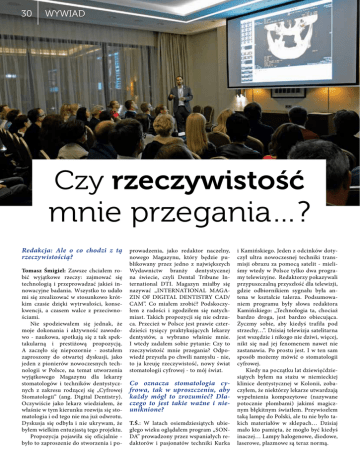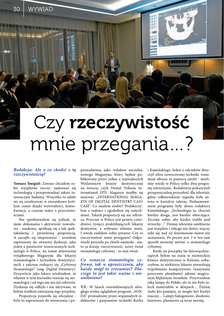 30 WYWIAD Czy rzeczywistość mnie przegania…? Redakcja: Ale o co chodzi z tą prowadzenia, jako redaktor naczelny, i Kamińskiego. Jeden z odcinków dotyrzeczywistością? nowego Magazynu, który będzie pu- czył ultra nowoczesnej techniki transTomasz Śmigiel: Zawsze chciałem robić wyjątkowe rzeczy: zajmować się technologią i przeprowadzać jakieś innowacyjne badania. Wszystko to udało mi się zrealizować w stosunkowo krótkim czasie dzięki wytrwałości, konsekwencji, a czasem walce z przeciwnościami. Nie spodziewałem się jednak, że moje dokonania i aktywność zawodowo - naukowa, spotkają się z tak spektakularną i prestiżową propozycją. A zaczęło się niepozornie - zostałem zaproszony do otwartej dyskusji, jako jeden z pionierów nowoczesnych technologii w Polsce, na temat utworzenia wyjątkowego Magazynu dla lekarzy stomatologów i techników dentystycznych z zakresu rodzącej się „Cyfrowej Stomatologii” (ang. Digital Dentistry). Oczywiście jako lekarz wiedziałem, że właśnie w tym kierunku rozwija się stomatologia i od tego nie ma już odwrotu. Dyskusja się odbyła i nie ukrywam, że byłem wielkim entuzjastą tego projektu. Propozycja pojawiła się oficjalnie było to zaproszenie do stworzenia i po- blikowany przez jedno z największych Wydawnictw branży dentystycznej na świecie, czyli Dental Tribune International DTI. Magazyn miałby się nazywać „INTERNATIONAL MAGAZIN OF DIGITAL DENTISTRY CAD/ CAM”. Co miałem zrobić? Podskoczyłem z radości i zgodziłem się natychmiast. Takich propozycji się nie odrzuca. Przecież w Polsce jest prawie czterdzieści tysięcy praktykujących lekarzy dentystów, a wybrano właśnie mnie. I wtedy zadałem sobie pytanie: Czy to rzeczywistość mnie przegania? Odpowiedź przyszła po chwili namysłu - nie, to ja kreuję rzeczywistość, nowy świat stomatologii cyfrowej - to mój świat. Co oznacza stomatologia cyfrowa, tak w uproszczeniu, aby każdy mógł to zrozumieć? Dlaczego to jest takie ważne i nieuniknione? T.Ś.: W latach osiemdziesiątych ubiegłego wieku oglądałem program „SONDA” prowadzony przez wspaniałych redaktorów i pasjonatów techniki Kurka misji obrazu za pomocą satelit - mieliśmy wtedy w Polsce tylko dwa programy telewizyjne. Redaktorzy pokazywali przypuszczalną przyszłość dla telewizji, gdzie odbiornikiem sygnału była antena w kształcie talerza. Podsumowaniem programu były słowa redaktora Kamińskiego: „Technologia ta, chociaż bardzo droga, jest bardzo obiecująca. Życzmy sobie, aby kiedyś trafiła pod strzechy…”. Dzisiaj telewizja satelitarna jest wszędzie i nikogo nie dziwi, więcej, nikt się nad jej fenomenem nawet nie zastanawia. Po prostu jest. I w ten sam sposób możemy mówić o stomatologii cyfrowej. Kiedy na początku lat dziewięćdziesiątych byłem na stażu w niemieckiej klinice dentystycznej w Kolonii, zobaczyłem, że niektórzy lekarze utwardzają wypełnienia kompozytowe (nazywane potocznie plombami) jakimś magicznym błękitnym światłem. Przywiozłem taką lampę do Polski, ale tu nie było takich materiałów w sklepach… Dzisiaj mało kto pamięta, że mogło być kiedyś inaczej… Lampy halogenowe, diodowe, laserowe, plazmowe są teraz normą. WYWIAD Kiedy na początku dwudziestego pierwszego wieku pojawiły się cyfrowe aparaty fotograficzne, nikt nie wróżył im przyszłości. Klisza była niepokonana. Przecież zdjęcia musiały być na papierze! Największe ówczesne autorytety fotografii zapewniały nas, że cyfrowe zdjęcia NIGDY nie pobiją swoją jakością zdjęć analogowych. Kto z Was ma dzisiaj aparat fotograficzny na kliszę? To, co dzieje się we współczesnej stomatologii to nie ewolucja… to REWOLUCJA! Woody Allen powiedział kiedyś ważne zdanie na temat odnoszenia sukcesu w różnych działaniach: „80 proc. sukcesu to UCZESTNICTWO”. Ja wybrałem udział w tej rewolucji na 100 proc. Czy uważa Pan Doktor, że Pacjenci to doceniają? Czy tego potrzebują? T.Ś.: Pacjenci wiedzą to najlepiej - lekarz, który się nie rozwija, cofa się. Dlatego też musi być ktoś pierwszy, kto wyznaczy kierunki rozwoju, kto pomoże innym dobrze wybrać, np. sprzęt. Kupiliśmy do naszej kliniki, jako pierwsi w Polsce już na początku 2012 roku, skaner wewnątrzustny Trios, który pozwala tworzyć wirtualne obrazy zębów i przesyłać je mailem do techników dentystycznych. Ponieważ była to totalna innowacja, to w Polsce technicy nie byli jeszcze na nią gotowi, a my już chcieliśmy w ten sposób działać. Przez cały czas użytkowania wysyłałem do Danii, gdzie mieści się firma produkująca skanery, informacje o detalach, które należy poprawić, aby polepszyć ich działanie. Teraz ten sprzęt jest już zmodyfikowany i cały czas się rozwija. Mamy wyjątkowy tomograf, który tworzy wirtualny obraz całej głowy w osiemnaście sekund. To wszystko poprawia diagnostykę i jakość leczenia, ale przede wszystkim zwiększa bezpieczeństwo pacjentów. A czy lekarze na tym wszystkim także mogą skorzystać? T.Ś.: Lubię uczyć innych, dzielić się wiedzą i doświadczeniem, dlatego też prowadzę wykłady na najbardziej znaczących kongresach naukowych - ostatnio na najważniejszym kongresie implantologicznym w Polsce: „Implanty: Idea-Sztuka-Praktyka”, gdzie właściwie wykładają głównie cudzoziemcy. Piszę dużo publikacji, a w grudniu 2012 roku zorganizowałem w Katowicach pierwszą konferencję międzynarodową „Technologia vs. Sztuka”. To było wydarzenie, którym zainteresowały się nawet media. Na zakończenie proszę o kilka słów, co dla Pana oznacza ten sukces. Mój Tato, który właśnie skończył 80 lat, był bardzo cenionym dentystą i wielu pacjentów wspomina go do dzisiaj. Starszy brat Mariusz jest z kolei absolutnym liderem w Polsce mało inwazyjnych, endoskopowych zabiegów kręgosłupa. Ja dokładam wszelkich sta- 31 rań, aby kontynuować godnie tradycję rodzinną, a róż