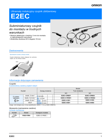 Ultramały indukcyjny czujnik zbliżeniowy E2EC Subminiaturowy czujnik do montażu w trudnych warunkach • Głowica detekcyjna o średnicy 3 mm do montażu w najtrudniejszych warunkach • Ultrakrótka obudowa M12 długości 18 mm Zastosowania Sprawdzanie zacisku uchwytu robota Czujnik zbliżeniowy można dołączyć do ruchomej części, np. do uchwytu robota. E2EC Informacje dotyczące zamawiania Czujniki 2-przewodowy zasilany prądem stałym Model Kształt Zasięg działania średn. 3 mm * Z czołem zakrytym średn. 5,4 mm * 0,8 mm 1,5 mm Tryb działania NO NC E2EC-CR8D1 E2EC-CR8D2 E2EC-C1R5D1 E2EC-C1R5D2 E2EC-C3D2 E2EC-X4D2 średn. 8 mm * 3 mm E2EC-C3D1 M12* 4 mm E2EC-X4D1 Uwaga: Jest dostępny typ o innej częstotliwości. (E2EC-@@5; np. E2EC-CR8D15) Akcesoria (zamawiane osobno) Uchwyty montażowe Kształt E2EC Model Dostępne modele Y92E-F5R4 E2EC-C1R5D@ 1 Parametry znamionowe/wydajność Typ Parametr Model Zasięg działania Ustawianie odległości Zmiana zasięgu Obiekt wykrywany Standardowy wykrywany obiekt Częstotliwość odpowiedzi Zasilanie (zakres napięć zasilania) Pobór prądu Prąd upływu Zdolność przełączania Wyjście sterujące Napięcie szczątkowe Żelazo, 5 × 5 × 1 mm Żelazo, 8 × 8 × 1 mm 1,5 kHz 1 kHz Lampka wskaźnika Typ D1: wskaźnik działania (czerwona dioda LED), wskaźnik ustawienia działania (zielona dioda LED). Typ D2: wskaźnik działania (czerwona dioda LED) Tryb działania (podczas zbliżania się obiektu wykrywanego) Obwody zabezpieczające Temperatura otoczenia Wilgotność otoczenia Wpływ temperatury Wpływ napięcia Rezystancja izolacji Wytrzymałość dielektryczna Odporność na wibracje Odporność na wstrząsy Konstrukcja zabezpieczająca Sposób połączenia Masa (w opakowaniu) Obudowa Materiał Powierzchnia detekcyjna Akcesoria 2-przewodowy zasilany prądem stałym E2EC-CR8D@ E2EC-C1R5D@ E2EC-C3D@ E2EC-X4D@ 0,8 mm ±15% 1,5 mm ±10% 3 mm ±10% 4 mm ±10% od 0 do 0,56 mm od 0 do 1,05 mm od 0 do 2,1 mm od 0 do 2,8 mm maks. 10% Metal zawierający żelazo (czułość zmniejsza się w przypadku metali nieżelaznych) Żelazo, 12 × 12 × 1 mm 12 do 24 V DC (10 do 30 V DC), pulsacja (p-p): maks. 10% --Maksymalnie 0,8 mA 5 do 100 mA maks. 3,0 V (przy prądzie obciążenia 100 mA i dł. kabla 2 m) Modele D1: NO Modele D2: NC Filtr przeciwprzepięciowy, zabezpieczenie przeciwzwarciowe Praca/składowanie: -25°C do 70°C (bez oblodzenia i kondensacji) Praca/składowanie: 35% do 95% wilgotności względnej (bez kondensacji) Maks. ±20% zasięgu działania przy temperaturze 23°C w zakresie temperatur od -25°C do 70°C Maks. ±2,5% zasięgu działania w zakresie napięcia znamionowego ±15% Min. 50 MΩ (przy 500 V DC) między elementami przewodzącymi prąd a obudową 1 000 V AC przez 1 minutę, między elementami przewodzącymi prąd a obudową 10 do 55 Hz, podwójna amplituda 1,5 mm przez 2 godziny, każda w kierunkach X, Y i Z Zniszczenie: 1 000 m/s2, 10 razy, każdy w kierunkach w X, Y i Z IEC60529 IP67 Modele z okablowaniem (standardowe długości: 2 m) Ok. 45 g Mosiądz ABS Uchwyt montażowy, instrukcja obsługi * Częstotliwość odpowiedzi przy przełączaniu DC to średnia wartości mierzonych w układzie, w którym odległość między poszczególnymi wykrywanymi obiektami jest równa dwukrotnemu wymiarowi wykrywanego obiektu, a zasięg działania jest ustawiony na wartość równą połowie maksymalnego zasięgu działania. 2 Ultramały indukcyjny czujnik zbliżeniowy Charakterystyka (dane typowe) Zasięg działania a obiekt wykrywany Stal niskowęglowa 0,8 Stal nierdzewna (SUS304) 0,6 Mosiądz Aluminium Miedź E2EC-C3D1 2,0 Stal niskowęglowa 1,5 Stal nierdzewna Mosiądz 1,0 Aluminium 0,4 Zasięg działania X (mm) E2EC-C1R5D1 1,0 Zasięg działania X (mm) Zasięg działania X (mm) E2EC-CR8D1 4 #d X t = 1 mm Stal niskowęglowa 3 Stal nierdzewna (SUS304) 2 Mosiądz Aluminium Miedź Miedź #d X 0,2 0 5 0,5 t = 1 mm 10 15 #d X 20 25 30 35 Długość boczna obiektu wykrywanego d (mm) 0 5 1 t = 1 mm 10 15 20 25 30 35 Długość boczna obiektu wykrywanego d (mm) 0 5 10 15 20 25 30 35 Długość boczna obiektu wykrywanego d (mm) Zasięg działania X (mm) E2EC-X4D1 5 #d X t = 1 mm Stal niskowęglowa 4 Stal nierdzewna 3 Mosiądz 2 Aluminium Miedź 1 0 5 10 15 20 25 30 35 Długość boczna obiektu wykrywanego d (mm) E2EC 3 Schemat obwodu wyjściowego Modele 2-przewodowe zasilane prądem stałym Tryb działania Model Przebieg czasowy Obwód wyjściowy Strefa niesta- Ustawianie położenia bilnego Strefa wykrywania stabilnego wykrywania Strefa poza zasięgiem Czujnik zbliżeniowy Obiekt wykrywany E2EC-CR8D1 E2EC-C1R5D1 E2EC-C3D1 E2EC-X4D1 (%) 100 Znamionowy zasięg działania NO 70 (TYP) 0 WŁ. Wskaźnik ustawiania (zielony) WYŁ. Brązowy Obciążenie WŁ. Wskaźnik działania (czerwony) WYŁ. +V Obwód główny WŁ. Wyjście sterujące WYŁ. Niebieski Strefa poza zasięgiem Strefa wykrywania 0V Czujnik zbliżeniowy Uwaga: Obciążenie może być podłączone do linii +V lub 0 V. Obiekt wykrywany E2EC-CR8D2 E2EC-C1R5D2 E2EC-C3D2 E2EC-X4D2 (%) 100 0 Znamionowy zasięg działania NC WŁ. Wskaźnik działania WYŁ. (czerwony) WŁ. Wyjście sterujące WYŁ. 4 Ultramały indukcyjny czujnik zbliżeniowy Uwagi Prawidłowe wykorzystanie Konstrukcja Wpływ sąsiadującego metalu Należy zapewnić minimalną odległość, zgodnie z podaną w poniższej tabeli, między czujnikiem a sąsiadującym metalem. l Wzajemne oddziaływanie (jednostka: mm) Model Parametr A B 18 (4) 6 (3) E2EC-C1R5D@ 15 (8) 10,8 (5,4) E2EC-C3D@ 30 (15) 16 (8) E2EC-X4D@ 40 (20) 24 (12) E2EC-CR8D@ Uwaga: Podane powyżej wartości w nawiasach mają zastosowanie, gdy są używane dwa czujniki o różnych częstotliwościach. n m średn. d D Montaż • W tabeli poniżej podano zakresy momentu dokręcania śrub oraz odległości mocowania dla niegwintowanych modeli E2EC-C. l m Wpływ sąsiadującego metalu (jednostka: mm) Model Parametr l d E2EC-CR8D@ D 3 E2EC-C1R5D@ 5,4 0 E2EC-C3D@ 