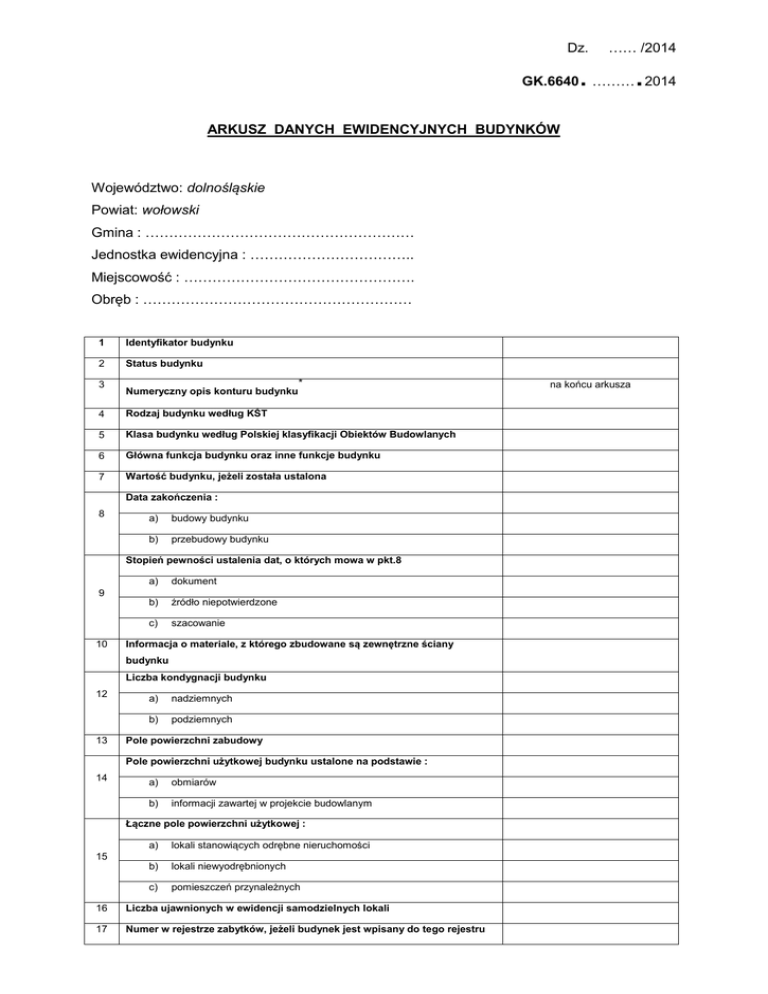 Dz. …… /2014 . . GK.6640 ……… 2014 ARKUSZ DANYCH EWIDENCYJNYCH BUDYNKÓW Województwo: dolnośląskie Powiat: wołowski Gmina : ………………………………………………… Jednostka ewidencyjna : …………………………….. Miejscowość : …………………………………………. Obręb : ………………………………………………… 1 Identyfikator budynku 2 Status budynku 3 Numeryczny opis konturu budynku * 4 Rodzaj budynku według KŚT 5 Klasa budynku według Polskiej klasyfikacji Obiektów Budowlanych 6 Główna funkcja budynku oraz inne funkcje budynku 7 Wartość budynku, jeżeli została ustalona Data zakończenia : 8 a) budowy budynku b) przebudowy budynku Stopień pewności ustalenia dat, o których mowa w pkt.8 a) dokument b) źródło niepotwierdzone c) szacowanie 9 10 Informacja o materiale, z którego zbudowane są zewnętrzne ściany budynku Liczba kondygnacji budynku 12 13 a) nadziemnych b) podziemnych Pole powierzchni zabudowy Pole powierzchni użytkowej budynku ustalone na podstawie : 14 a) obmiarów b) informacji zawartej w projekcie budowlanym Łączne pole powierzchni użytkowej : a) lokali stanowiących odrębne nieruchomości b) lokali niewyodrębnionych c) pomieszczeń przynależnych 15 16 Liczba ujawnionych w ewidencji samodzielnych lokali 17 Numer w rejestrze zabytków, jeżeli budynek jest wpisany do tego rejestru na końcu arkusza Adres budynku, na który składają się : a) miejscowość i identyfikator TERYT miejscowości b) dzielnica c) ulica i identyfikator TERYT ulicy d) numer porządkowy, jeżeli został nadany budynkowi 18 19 Identyfikatory działek ewidencyjnych, na których położny jest budynek 20 Informacja, czy budynek został oddany do użytkowania 21 Oznaczenie części budynku oddanej do użytkowania 22 Data oddania do użytkowania budynku lub części budynku Liczba mieszkań według dokumentacji budowy w budynku mieszkalnym : a) 1-izbowych b) 2-izbowych c) 3-izbowych d) 4-izbowych e) 5-izbowych f) 6-izbowych g) 7-izbowych h) 8-izbowych i) 9 izbowych j) 10-izbowych k) Składających się z więcej niż 10 izb 23 24 Łączna liczba izb w budynku mieszkalnym Data rozbiórki : 25 26 a) całego budynku b) części budynku Przyczyna rozbiórki budynku lub jego części Numeryczny opis konturu budynku * : Sporządził dnia …………..2014r. * w tym miejscu należy umieścić tabelaryczny wykaz współrzędnych narożników budynku wraz z graficznym obrysem budynku