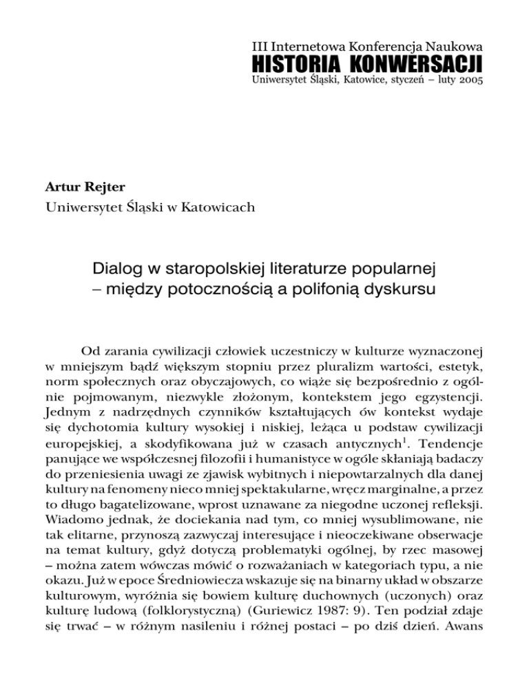 III Internetowa Konferencja Naukowa HISTORIA KONWERSACJI Uniwersytet Śląski, Katowice, styczeń – luty 2005 Artur Rejter Uniwersytet Śląski w Katowicach Dialog w staropolskiej literaturze popularnej – między potocznością a polifonią dyskursu Od zarania cywilizacji człowiek uczestniczy w kulturze wyznaczonej w mniejszym bądź większym stopniu przez pluralizm wartości, estetyk, norm społecznych oraz obyczajowych, co wiąże się bezpośrednio z ogólnie pojmowanym, niezwykle złożonym, kontekstem jego egzystencji. Jednym z nadrzędnych czynników kształtujących ów kontekst wydaje się dychotomia kultury wysokiej i niskiej, leżąca u podstaw cywilizacji europejskiej, a skodyfikowana już w czasach antycznych1. Tendencje panujące we współczesnej filozofii i humanistyce w ogóle skłaniają badaczy do przeniesienia uwagi ze zjawisk wybitnych i niepowtarzalnych dla danej kultury na fenomeny nieco mniej spektakularne, wręcz marginalne, a przez to długo bagatelizowane, wprost uznawane za niegodne uczonej refleksji. Wiadomo jednak, że dociekania nad tym, co mniej wysublimowane, nie tak elitarne, przynoszą zazwyczaj interesujące i nieoczekiwane obserwacje na temat kultury, gdyż dotyczą problematyki ogólnej, by rzec masowej – można zatem wówczas mówić o rozważaniach w kategoriach typu, a nie okazu. Już w epoce Średniowiecza wskazuje się na binarny układ w obszarze kulturowym, wyróżnia się bowiem kulturę duchownych (uczonych) oraz kulturę ludową (folklorystyczną) (Guriewicz 1987: 9). Ten podział zdaje się trwać – w różnym nasileniu i różnej postaci – po dziś dzień. Awans III Internetowa Konferencja Naukowa HISTORIA KONWERSACJI, http://dialog.us.edu.pl 2 kultury popularnej, jakiemu towarzyszy izolacja jej odmiany wysokiej, a którego świadkiem jest współczesny człowiek, informuje o całkowitych przewartościowaniach w sferze estetyki i komunikacji, zacieraniu granic między poszczególnymi zjawiskami sztuki czy literatury, niemniej nie znosi całkowicie różnic między nimi. Mimo dążności do unifikacji w sferze zjawisk masowych, sprzyjającej triumfowi egalitaryzmu, nie można mówić o atrofii kultury elitarnej. Nie należy zresztą postrzegać zjawisk kulturowych w kategoriach wzajemnego konkurowania – pluralizm wyznaczników cywilizacji jest wszak ponadczasowy. Ciekawy wkład w badania nad kulturą dawnej Polski mogą wnieść obserwacje twórczości popularnej, „lżejszej”, która stanowi jedno z nielicznych świadectw życia przeciętnego człowieka epok minionych – jego gustów, obyczajów, wartości literacko-estetycznych, w kręgu których się poruszał. Bogactwo i rozmaitość gatunkowa tej literatury, manifestująca się między innymi w wariantywności stylistycznej, jest powodem, iż obszar ten pozostaje nadal – zarówno dla językoznawców, literaturoznawców, jak i historyków kultury – interesującym i inspirującym terenem poszukiwań badawczych. W piśmiennictwie polskim przełomu XV i XVI w. nie brakuje utworów popularnych, o wymowie satyrycznej i podstawowej ludycznej funkcji. Zaliczyć do tego typu literatury należy wczesnorenesansowy (wg niektórych badaczy późnośredniowieczny2) tekst humorystyczny zatytułowany Rozmowy, jakie miał król Salomon mądry z Marchołtem grubym a sprosnym, a wszakoż, jako o nim powiedają, bardzo z wymownym, z figurami i z gadkami śmiesznymi. Wszelkie egzemplifikacje dotyczące problemu postawionego w nagłówku niniejszego artykułu zaczerpnięte zostały z tego właśnie tekstu. Już sam tytuł staropolskiej humoreski, ściślej: ostatnia jego część, informuje odbiorcę o rozrywkowym charakterze utworu. Całość natomiast zdecydowanie to potwierdza. Ślady obecności Marchołta jako postaci literackiej występują m.in. w apokryfie o charakterze filozoficznym i teologiczno-moralnym z V w., natomiast redakcja komiczna tekstu powstała w Niemczech w stuleciu XII. Prototyp wywodzi się z kręgu żydowskich legend o królu Salomonie (Michałowska 1995: 653). W Polsce niezwykle popularny okazał się przekład łacińskiej wersji, autorstwa Jana z Koszyczek z roku 1521, wielokrotnie później wznawiany, jednak, na skutek zaczytania tekstu, dzisiaj dostępna wersja stanowi kompilację ocalałych fragmentów i rekonstrukcję filologiczną pierwowzoru. 3 III Internetowa Konferencja Naukowa HISTORIA KONWERSACJI, http://dialog.us.edu.pl Utwór reprezentuje tzw. literaturę błazeńską, przede wszystkim za sprawą podjętej tematyki i kreacji głównej postaci: „Błazen był kontrwizerunkiem bohatera pozytywnego, z którym występował w parze jako jego adwersarz. Łączył w sobie szpetotę cielesną z wrodzoną (nie wspomaganą żadnym wykształceniem) mądrością, inteligencją i sprytem oraz kpiarskim stosunkiem do wszelkich uznanych powag.” (Michałowska 1995: 653). Cały tekst stanowi aktualizację pewnej konwencji właściwej staropolskiej literaturze popularnej, waloryzującej odwrócenie oficjalnego porządku: „Spór z Salomonem nie jest sporem o konkretne wartości społeczne czy osobowe, jest raczej demonstracją przekory.” (Ziomek 1995: 144). Także forma jest tutaj dość osobliwa, by nie rzec „pozorna”, jako że tekst – oparty w dużej mierze na dialogu – „przemyca” różne gatunki mowy, współkonstytuujące rozmowę, a służebne względem nadrzędnej, ludycznej, funkcji komunikatu. Wiąże się to z jednej strony z założeniami literatury popularnej, z drugiej zaś – z osobliwą pozycją dialogu w kulturze literackiej wieków dawnych, jako że był on gatunkiem nieskodyfikowanym w ówczesnych poetykach. Od dramatu dialog różnił się przede wszystkim brakiem sytuacji fabularnej, dominantą dyskursywną, abstrakcyjnym porządkiem problemów, argumentów i racji, jak również ubóstwem świata przedstawionego (Abramowska 1998: 159) czy też statycznością rozmówców (bohaterów) oraz zróżnicowaniem genologicznym replik