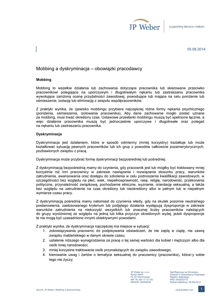 05.08.2014 Mobbing a dyskryminacja – obowiązki pracodawcy Mobbing Mobbing to wszelkie działania lub zachowania dotyczące pracownika lub skierowane przeciwko pracownikowi polegające na uporczywym i długotrwałym nękaniu lub zastraszaniu pracownika wywołujące zaniżoną ocenę przydatności zawodowej, powodujące lub mające na celu poniżenie lub ośmieszenie, izolację lub eliminację z zespołu współpracowników. Z praktyki wynika, że zjawisko mobbingu przybiera najczęściej różne formy nękania psychicznego (poniżenia, ośmieszenia, izolowania pracownika). Aby dane zachowanie mogło zostać uznane za mobbing, musi trwać określony czas. Ustawowe przesłanki mobbingu muszą być spełnione łącznie, a więc działania pracownika muszą być jednocześnie uporczywe i długotrwałe oraz polegać na nękaniu lub zastraszaniu pracownika. Dyskryminacja Dyskryminacja jest działaniem, które w sposób odmienny (mniej korzystny) kształtuje lub może kształtować sytuację pewnych pracowników lub ich grup z powodów całkowicie pozamerytorycznych, pozbawionych związku z pracą. Dyskryminacja może przybrać formę dyskryminacji bezpośredniej lub pośredniej. Z dyskryminacją bezpośrednią mamy do czynienia, gdy pracownik jest lub mógłby być traktowany mniej korzystnie niż inni pracownicy w zakresie nawiązania i rozwiązania stosunku pracy, warunków zatrudnienia, awansowania oraz dostępu do szkolenia w celu podnoszenia kwalifikacji zawodowych, w szczególności bez względu na płeć, wiek, niepełnosprawność, rasę, religię, narodowość, przekonania polityczne, przynależność związkową, pochodzenie etniczne, wyznanie, orientację seksualną, a także bez względu na zatrudnienie na czas określony lub nieokreślony albo w pełnym lub w niepełnym wymiarze czasu pracy. Z dyskryminacją pośrednią mamy natomiast do czynienia wtedy, gdy na skutek pozornie neutralnego postanowienia, zastosowanego kryterium lub podjętego działania występują dysproporcje w zakresie warunków zatrudnienia na niekorzyść wszystkich lub znacznej liczby pracowników należących do grupy wyróżnionej ze względu na jedną lub kilka przyczyn określonych wyżej, jeżeli dysproporcje te nie mogą być uzasadnione innymi obiektywnymi powodami. Z praktyki wynika, że dyskryminacja najczęściej ma miejsce w sytuacji: 1. zobowiązywania pracownic do podpisywania oświadczeń, że nie zajdą w ciążę, nie zawrą związku małżeńskiego w danym okresie czasu; 2. ustalenie niższego wynagrodzenia za pracę o tej samej wartości dla kobiet i mężczyzn albo dla osób innej narodowości; 3. mniej korzystne traktowanie osób przynależących do związku zawodowego; 4. kierowanie uwag i żartów o tematyce seksualnej do pracownicy (pracownika), która/-y sobie tego nie życzy; JP Weber sp. z o.o. Rynek 39/40 PL 50-102 Wrocław NIP: PL 897 17 13 155 REGON: 020248434 Source: JP Weber | Mobbing a dyskryminacja Sąd Rejonowy we Wrocławiu Wydział VI Gospodarczy Krajowego Rejestru Sądowego KRS: 0000253773 Kapitał zakładowy: 50.000,00 zł www.jpweber.com 1 5. kierowanie uwag lub żartów na temat pochodzenia pracownika lub jego przynależności etnicznej 6. kierowanie na szkolenia zawodowe tylko młodych pracowników albo wybranej kategorii pracowników etc. Mobbing a dyskryminacja - różnice Podstawowe różnice między mobbingiem i dyskryminacją to: Lp. MOBBING DYSKRYMINACJA 1. mobbing musi być działaniem długotrwałym i uporczywym mobbing nie odnosi się do cech prawnie chronionych dyskryminacja może być zachowaniem jednorazowym przy dyskryminacji, konieczny związek gorszego traktowania z konkretną cechą prawnie chronioną (np. przynależność związkowa, narodowość etc.) przy dyskryminacji motywacja nie ma znaczenia Na wypadek roszczeń na tle dyskryminacji, to na pracodawcy ciąży obowiązek udowodnienia, że nie doszło do nierównego traktowania lub że kierował się obiektywnymi kryteriami 2. 3. 4. mobbing charakteryzuje celowość działań lub zachowań sprawców osoba dochodząca roszczeń z tytułu mobbingu musi sama udowodnić, że była mobbingowana Obowiązki pracodawcy – najczęściej popełniane błędy Obowiązkiem pracodawcy jest przeciwdziałanie mobbingowi. Przeciwdziałanie mobbingowi powinno być równolegle prowadzone w trzech podstawowych obszarach: prawa wewnętrznego organizacji, praktyki zarządzania, a także w obszarze etyki i kultury organizacyjnej. Błędem popełnianym przez pracodawców jest m.in.: 1. uregulowanie polityki antymobbingowej wyłącznie poprzez powtórzenie przepisów k.p. w Regulaminie Pracy, 2. tworzenie polityki antymobbingowej jako narzędzia zmierzającego do karania, a nie jako narzędzia hamującego zjawiska przemocy, 3. brak powiązania wewnętrznych przepisów antymobbingowych ze szkoleniami co najmniej dla kadry zarządzającej etc. Oprócz przeciwdziałaniu mobbingowi obowiązkiem pracodawcy jest także zapewnienie równego traktowania wszystkich pracowników. Oczywiście racjonalnym rozwiązaniem jest połączenie regulacji polityki antymobbingowej z unormowaniem odnoszącym się do praktyki związanej z dyskryminacją pracowników, zwłaszcza, że ciężar dowodu na wypadek ewentualnego roszczenia w przypadku dyskryminacji (odmiennie niż przy mobbingu) leży po stronie pracodawcy. Odpowiedzialność pracodawcy W przypadku mobbingu pracownik może domagać się od pracodawcy dwóch rodzajów niezależnych od siebie świadczeń pieniężnych – zadośćuczynienia i odszkodowania. Zadośćuczynienia pieniężnego za doznaną krzywdę pracownik może dochodzić, gdy na skutek mobbingu pracownik doznał uszczerbku na zdrowiu. Odszkodowania pracownik może dochodzić, gdy wskutek stosowanego wobec niego mobbingu rozwiązał umowę o pracę. Przepisy nie określają górnej granicy odszkodowania. Nie może być ono jednak niższe niż minimalne wynagrodzenie. Source: JP Weber | Mobbing a dyskryminacja www.jpweber.