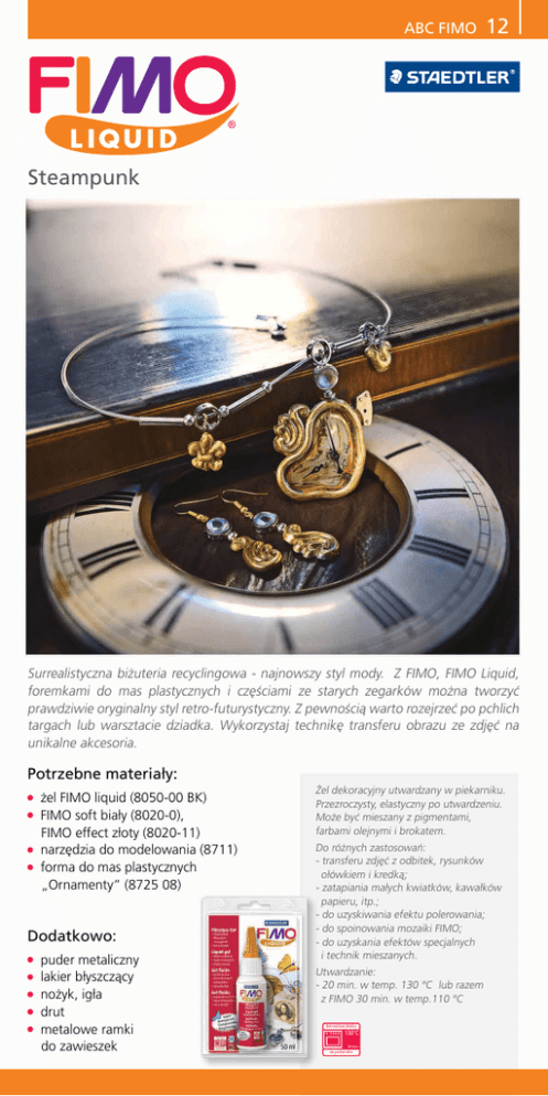 ABC FIMO 12 Steampunk Surrealistyczna biżuteria recyclingowa - najnowszy styl mody. Z FIMO, FIMO Liquid, foremkami do mas plastycznych i częściami ze starych zegarków można tworzyć prawdziwie oryginalny styl retro-futurystyczny. Z pewnością warto rozejrzeć po pchlich targach lub warsztacie dziadka. Wykorzystaj technikę transferu obrazu ze zdjęć na unikalne akcesoria. Potrzebne materiały: żel FIMO liquid (8050-00 BK) FIMO soft biały (8020-0), FIMO effect złoty (8020-11) narzędzia do modelowania (8711) forma do mas plastycznych „Ornamenty” (8725 08) Dodatkowo: puder metaliczny lakier błyszczący nożyk, igła drut metalowe ramki do zawieszek Żel dekoracyjny utwardzany w piekarniku. Przezroczysty, elastyczny po utwardzeniu. Może być mieszany z pigmentami, farbami olejnymi i brokatem. Do różnych zastosowań: - transferu zdjęć z odbitek, rysunków ołówkiem i kredką; - zatapiania małych kwiatków, kawałków papieru, itp.; - do uzyskiwania efektu polerowania; - do spoinowania mozaiki FIMO; - do uzyskania efektów specjalnych i technik mieszanych. Utwardzanie: - 20 min. w temp. 130 °C lub razem z FIMO 30 min. w temp.110 °C termoutwardzalna 130°C 30 min. do piekarnika Krok 1, 2 Do formy do mas plastycznych „Ornamenty” dodaj trochę metalicznego złotego pudru. Wciśnij teraz mały kawałek masy FIMO effect złoty. Nożykiem FIMO lub ostrym nożem kuchennym odetnij nadmiar masy. Dzięki temu motyw będzie miał z tyłu gładką powierzchnię. Krok 3 Jeśli ornament będzie zawieszany, z kawałka drutu wygnij oczko do przewlekania i wciśnij prostopadle do odcisku. Wyjmij ornament z formy wypychając go ostrożnie. Czyszczenie: Po użyciu wytrzyj formę wilgotną szmatką. W przeciwnym wypadku ślady brokatu mogą pozostać na kolejnych kolorach. Ręce umyj wodą z mydłem. Wskazówka: Posypywanie pudrem metalicznym, pudrem dla dzieci lub talkiem ułatwia wyjmowanie z form. Krok 4, 5 Wydrukuj wzór oczu oraz zegara (możesz go pobrać ze strony www.fimofan.pl, lub narysować samodzielnie) i pokryj w całości cienką warstwą FIMO liquid. Uwaga: Cały wzór musi być dokładnie pokryty. Wytnij motywy, umieść je na blaszce do pieczenia, obciąż magnesami lub monetami, żeby papier się nie sfalował i utwardź w piekarniku w temp. 130 °C przez ok. 20 min. Krok 6, 7 Po utwardzeniu, pozostaw motywy do ostygnięcia, a następnie włóż je do letniej wody i namocz przez ok. 5 min. Szczoteczką do paznokci usuń pozostałości papieru. Może pozostać cienka powłoka. Wysusz motywy. Wskazówka: Większe motywy powinny być obciążone podczas suszenia, w celu uniknięcia pofalowania. Krok 8, 9 Aby zrobić zegar, rozwałkuj białe FIMO na arkusz grubości ok. 2 mm. Z połowy paska na kostce FIMO effect w kolorze złotym zrób wałeczek o średnicy około 2 mm. Umieść obrazek z FIMO liquid na białym arkuszu FIMO i lekko dociśnij. Dookoła przyklej złoty wałeczek FIMO. Krok 10, 11 Doklej na arkuszu FIMO ornament z formy i wytnij kształt nożykiem. Pomaluj krawędź złotym pudrem metalicznym. Krok 12 Nawlecz okrągłe ramki na igłę i wypełnij je białym FIMO. Nałóż obrazek z oczkiem opisany w krokach 4 - 7. Krok 13 Przytnij wskazówki do odpowiedniego rozmiaru. Umieść kroplę żelu na środku wisiorka i przyklej tam wskazówkę a jej koniec do krawędzi zegara. Krok 14, 15 Umieść wszystkie elementy biżuterii na blasze do pieczenia i utwardź w piekarniku przez ok. 30 minut w temp. 110 °C. Po ostudzeniu, pokryj je warstwą błyszczącego lakieru, który nada atrakcyjnego błyszczącego wykończenia i zarazem chroni je. Krok 16 Wykończ nakładając poszczególne elementy na metalową linkę wraz z rurkami i koralikami. Zmontuj kolczyki używając dla każdego wytłoczone ornamenty i oczka. Ważne: Zwróć uwagę na różne czasy i temperatury utwardzania. FIMO soft = 110 °C / 30 minut FIMO liquid = 130 °C / 20 minut Czyszczenie: Brudne pędzle i odzież wyczyścisz acetonem. Przechowywanie: Przechowuj FIMO liquid w temperaturze pokojowej i unikaj kontaktu z PCV lub polistyrenem. Więcej wskazówek znajdziesz na stronie www.fimofan.pl