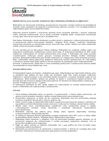 95-070 Aleksandrów Łódzki, ul. Wojska Polskiego 158 tel/fax + 48 42 7122378 PRZED INSTALACJĄ NALEŻY ZAPOZNAĆ SIĘ Z NINIEJSZĄ INSTRUKCJĄ OBSŁUGI!!! Biokominek jest innowacyjną konstrukcją, przeznaczoną do stosowania wewnątrz pomieszczeń posiadających normalny system wentylacji ( nie mogą być to pomieszczenia całkowicie szczelne ) i nie wymagają komina do odprowadzania spalin. Są to kominki bez komina. Połączenie prostych kształtów z nowoczesną stylistyką tworzy przyjemną atmosferę i znacznie zwiększają walory estetyczne pomieszczenia. Jest to przede wszystkim osiągnięte dzięki występowaniu prawdziwego żywego ognia, który nie jest statyczny jak w przypadku świec. Fakt budowy biokominka z metali szlachetnych wysokiej jakości w połączeniu z ciekawą kolorystyką sprawia, że pomieszczenie nabiera nowoczesnego charakteru i elegancji. Prosty montaż i możliwość wielorakiego zastosowania przemawia na zdecydowaną korzyść stosowania tego wyrobu. Możliwe jest także wbudowanie wkładu w klasyczne kształty kominków. Nie bez znaczenia jest też fakt poprawy bilansu cieplnego. Biokominek jest wydajnym źródłem ciepła i jest atrakcyjnym uzupełnieniem standardowego systemu grzewczego. W tradycyjnych kominkach do 60% energii cieplnej jest wyprowadzana na zewnątrz pomieszczenia przez komin, w biokominku całe ciepło pozostaje w pomieszczeniu. Tradycyjne systemy grzewcze wysuszają powietrze obniżając komfort wdychanego powietrza. Biokominki produkowane przez KAMI wyposażone są w zintegrowany system nawilżania powietrza. Paląc w biokominku można jednocześnie dodatkowo intensywnie nawilżać pomieszczenie. Do wody będącej w nawilżaczu możemy dolać olejki zapachowe lub inne preparaty do aromaterapii, które zwiększają komfort powietrza w pomieszczeniu. Dzięki temu w czasie normalnego przebywania w pomieszczeniu możemy poddać się aromaterapii nie tracąc dodatkowego czasu. ZASADA DZIAŁANIA: W biokominkach spalany jest biopłyn, a dokładniej jego opary. Skład biopłynu jest odpowiednio dobrany, przez co produktem jego spalania jest para wodna oraz dwutlenek węgla. Para wodna powoduje zwiększenie wilgotności w pomieszczeniach, co jest zjawiskiem bardzo korzystnym, a zawartość dwutlenku węgla nie jest niebezpieczna. Skład produktów spalania jest podobny do składu w wydychanym ludzkim powietrzu. Nie powstaje dym jaki towarzyszy spalaniu tradycyjnym paliwom. W zależności od rodzaju palnika i stopnia jego otwarcia 1l biopłynu pali się od 2 - 5 godzin. W tradycyjnych kominkach do 60% energii cieplnej jest wyprowadzana na zewnątrz pomieszczenia przez komin, w biokominku całe ciepło pozostaje w pomieszczeniu. UWAGI: 1. Przed instalacją biokominka należy się upewnić, że pomieszczenie, w którym będzie umieszczony, ma sprawny system naturalnej wentylacji i spełnia wymogi bezpieczeństwa przeciwpożarowego. 2. Powierzchnia montażowa, na której ma być zawieszany biokominek musi być powierzchnią niepalną (wyklucza się podłoża takie jak płyty wiórowe, meblowe, itp.) 3. Należy zwrócić uwagę, na odpowiedni dobór kołków rozporowych stosowanych do montażu w zależności od typu podłoża na którym biokominek zostanie zawieszony. Istotne jest by instalację wykonać bardzo solidnie. 4. Montaż należy zlecić wykwalifikowanemu instalatorowi, który przeprowadzi montaż w zgodzie z obowiązującymi normami, sztuką inżynierską i przepisami dotyczącymi bezpieczeństwa przeciwpożarowego. 5. Biokominki zużywają tlen podczas pracy, dlatego należy zapewnić odpowiednią wentylację w pomieszczeniach w których będą używane. 6. W niektórych miejscach obudowy biokominka występuje temperatura około 90°C, przez co należy unikać bezpośredniego dotyku obudowy. Wkładanie dłoni w płomień grozi oparzeniami. 7. Biokominek należy montować w odległości: 0,5m od powierzchni normalnie palnych; minimum 1m od powierzchni mogących ulec zdeformowaniu w wyniku powstającej temperatury; minimum 1,5m od powierzchni nieodpornych na temperaturę. 8. Nigdy nie należy ustawiać na obudowie biokominka, lub w jego pobliżu (do 0,5m od każdej ściany biokominka) żadnych przedmiotow. 9. Biokominek jest przeznaczony do montowania w pomieszczeniach, w których nie występują duże ruchy powietrza. Zakazane jest sztuczne podsycanie ognia poprzez tworzenie podmuchów. 10. Jako paliwo należy stosować tylko i wyłącznie biopaliwa. Inne produkty mogą powodować występowanie nadmiernego płomienia, a przez to nadmiernej temperatury na obudowie biokominka. Palenie węglem każdego rodzaju i jego pochodnymi; olejami; drewnem i pochodnymi; odpadami domowymi; materiałami z PVC może wywołać pożar i spowoduje zagrożenie życia, przez co jest to kategorycznie zakazane! 11. Nigdy nie należy przechowywać biopłynu w pobliżu biokominka i źródeł ciepła. Płyn należy przechowywać w sposób uniemożliwiający powstanie pożaru. 12. Należy uniemożliwić dostęp do biopłynu dzieciom i zwierzętom. 13. Nigdy nie wolno nalewać biopłynu do palnika biokominka podczas jego pracy. Nie wolno również uzupełniać braku płynu w palniku zaraz po jego wypaleniu. 14. Zwierzęta domowe nie mogą znajdować się w pobliżu biokominka. 15. Należy zwracać szczególną uwagę na bezpieczną odległość przebywania dzieci podczas pracy biokominka. 16. Przypadkowe spożycie biopłynu grozi zatruciem i innymi konsekwencjami zdrowotnymi. Należy niezwłocznie skontaktować się z lekarzem. 17. Należy pamiętać, że pokrywka palnika powinna być zawsze zamknięta w przypadku, kiedy w palniku jest nalany biopłyn 18. Wszelkie zmiany konstrukcyjne są niedopuszczalne. NALEWANIE BIOPŁYNU, ROZPALANIE I WYGASZENIE BIOKOMINKA: 1. Uzupełnianie biopłynu, rozpalanie biokominka może przeprowadzać tylko osoba dorosła, przestrzegając przy tym zasad bezpieczeństwa. 2. Palnik biokominka przed nalaniem płynu musi być wolny od zani