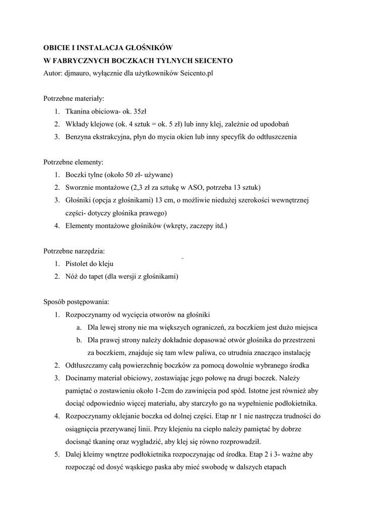 ̲ OBICIE I ISTALACJA GŁOŚIKÓW W FABRYCZYCH BOCZKACH TYLYCH SEICETO Autor: djmauro, wyłącznie dla użytkowników Seicento.pl Potrzebne materiały: 1. Tkanina obiciowa- ok. 35zł 2. Wkłady klejowe (ok. 4 sztuk = ok. 5 zł) lub inny klej, zależnie od upodobań 3. Benzyna ekstrakcyjna, płyn do mycia okien lub inny specyfik do odtłuszczenia Potrzebne elementy: 1. Boczki tylne (około 50 zł- używane) 2. Sworznie montażowe (2,3 zł za sztukę w ASO, potrzeba 13 sztuk) 3. Głośniki (opcja z głośnikami) 13 cm, o możliwie niedużej szerokości wewnętrznej części- dotyczy głośnika prawego) 4. Elementy montażowe głośników (wkręty, zaczepy itd.) Potrzebne narzędzia: ➠ 頴頴䱗蘟相相相 1. Pistolet do kleju 2. Nóż do tapet (dla wersji z głośnikami) Sposób postępowania: 1. Rozpoczynamy od wycięcia otworów na głośniki a. Dla lewej strony nie ma większych ograniczeń, za boczkiem jest dużo miejsca b. Dla prawej strony należy dokładnie dopasować otwór głośnika do przestrzeni za boczkiem, znajduje się tam wlew paliwa, co utrudnia znacząco instalację 2. Odtłuszczamy całą powierzchnię boczków za pomocą dowolnie wybranego środka 3. Docinamy materiał obiciowy, zostawiając jego połowę na drugi boczek. Należy pamiętać o zostawieniu około 1-2cm do zawinięcia pod spód. Istotne jest również aby dociąć odpowiednio więcej materiału, aby starczyło go na wypełnienie podłokietnika. 4. Rozpoczynamy oklejanie boczka od dolnej części. Etap nr 1 nie nastręcza trudności do osiągnięcia przerywanej linii. Przy klejeniu na ciepło należy pamiętać by dobrze docisnąć tkaninę oraz wygładzić, aby klej się równo rozprowadził. 5. Dalej kleimy wnętrze podłokietnika rozpoczynając od środka. Etap 2 i 3- ważne aby rozpocząć od dosyć wąskiego paska aby mieć swobodę w dalszych etapach 6. Przy etapach 4 i 5 postępujemy dokładnie, małymi krokami, doprowadzamy całe obicie do etapu gdy powstaną 2 fałdy wzdłuż zielonych linii. 7. Rozcinamy fałdy, na tyle, na ile jest to konieczne i bardzo precyzyjnie docinamy, tak aby po doklejeniu nie powstała szczelina. 8. Odpowiednie docięcie i precyzyjne doklejenie rozcięcia, spowoduje, że łączenie będzie praktycznie niewidoczne. 9. Po zakończeniu tych czynności odwracamy boczek i podwijamy tkaninę, podklejając ją od wewnętrznej strony. Na prostych krawędziach nie ma żadnego problemu, na łukach musimy podocinać zakładkę. 10. Wycinamy w tkaninie otwór na głośnik i montujemy głośniki i maskownice. 11. Zakładamy sworznie, polecam je wkleić w zaczepy w boczku. 12. Podpinamy głośniki, zakładamy boczki i po sprawie. Boczek w stanie surowym (foto by Hrabiello) Etapy postępowania przy oklejaniu (foto by Hrabiello) Boczek prawy po zamontowaniu w samochodzie Boczek lewy po zamontowaniu