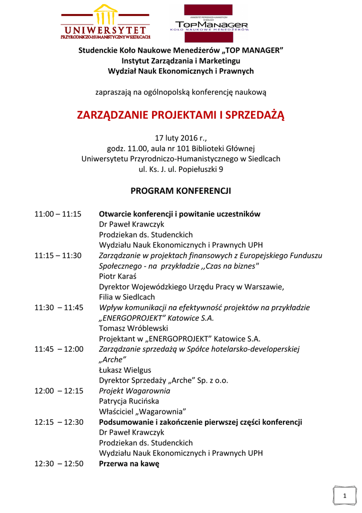 Studenckie Koło Naukowe Menedżerów „TOP MANAGER” Instytut Zarządzania i Marketingu Wydział Nauk Ekonomicznych i Prawnych zapraszają na ogólnopolską konferencję naukową ZARZĄDZANIE PROJEKTAMI I SPRZEDAŻĄ 17 luty 2016 r., godz. 11.00, aula nr 101 Biblioteki Głównej Uniwersytetu Przyrodniczo-Humanistycznego Przyrodniczo Humanistycznego w Siedlcach ul. Ks. J. ul. Popiełuszki 9 PROGRAM KONFERENCJI 11:00 – 11:15 11:15 – 11:30 11:30 – 11:45 11:45 – 12:00 12:00 – 12:15 12:15 – 12:30 12:30 – 12:50 Otwarcie konferencji i powitanie uczestników Dr Paweł Krawczyk Prodziekan ds. Studenckich Wydziału Nauk Ekonomicznych i Prawnych UPH Zarządzanie w projektach finansowych z Europejskiego Funduszu Społecznego - na przykładzie ,,Czas na biznes" Piotr Karaś Dyrektor Wojewódzkiego Urzędu Pracy w Warszawie, Filia w Siedlcach Wpływ komunikacji na efektywność projektów na przykładzie „ENERGOPROJEKT” Katowice S.A. Tomasz Wróblewski Projektant w „ENERGOPROJEKT” Katowice S.A. Zarządzanie arządzanie sprzedażą w Spółce hotelarsko-developerskiej hotelarsko developerskiej „Arche” Łukasz Wielgus Dyrektor Sprzedaży „Arche” Sp. z o.o. Projekt Wagarownia Patrycja Rucińska Właściciel „Wagarownia” Podsumowanie i zakończenie pierwszej pierwszej części konferencji Dr Paweł Krawczyk Prodziekan ds. Studenckich Wydziału Nauk Ekonomicznych i Prawnych UPH Przerwa na kawę 1 OBRADY STUDENCKIE 12:50-15:30 12:5 PANEL 1 – SALA NR 5, PARTER, BIBLIOTEKA GŁÓWNA PROWADZENIE: Mateusz Janczuk 12:50-13:00 13:00-13:10 13:10-13:20 13:20-13:30 13:30-13:40 13:40-13:50 13:50-14:00 14:00-14:10 14:10-14:20 14:20-14:30 14:30-14:40 14:40-14:50 14:50-15:00 15:00-15:10 15:10-15:20 15:20-15:30 Magdalena Ślusarczyk, Studenckie Koło Naukowe Resocjalizacji i Profilaktyki Społecznej, UPH w Siedlcach „Projekty w obszarze resocjalizacji jako forma aktywizacji jednostek niedostosowanych społecznie.” Kamil Banach, Wojskowa Akademia Techniczna im. Jarosława Dąbrowskiego w Warszawie „Praca zdalna, praca asynchroniczna – co to jest, jak zacząć i czego używać?” Jolanta Grodzicka, Koło Naukowe Logistyków, UPH w Siedlcach „Proces obsługi klienta.” Magda Kowaluk, Studenckie Koło Administratywistów,, UPH w Siedlcach „Idealna obsługa petenta w urzędzie.” Edyta Biardzka, Katolicki Uniwersytet Lubelski Jana Pawła II „Prawne otoczenie zarządzania zasobami ludzkimi w administracji publicznej.” pub Monika Zaniewicz, UPH w Siedlcach „Budowanie przewagi konkurencyjnej organizacji poprzez efektywne szkolenie pracownika.” Przemysław Sergiej, Studenckie S Koło Naukowe Menedżerów „TOP MANAGER”, UPH w Siedlcach „Zarządzanie obsługą klienta.” Renata Pisarek, Uniwersytet Łódzki, Wydział Ekonomiczno – Socjologiczny „Jakość obsługi klienta – petenta jako czynnik marketingu relacji jednostek samorządu terytorialnego.” Anna Zając, Uniwersytet Rzeszowski „Uwarunkowania skutecznego motywowania pracownika.” Mateusz Paduch, UPH w Siedlcach „Systemy zarządzania jakością w jednostkach administracji publicznej.” Patrycja Iwanowska, Koło Naukowe Logistyków, UPH w Siedlcach „Zarządzanie zespołem organizacji.” Anna Seroczyńska, Uniwersytet Ekonomiczny we Wrocławiu „Zarządzanie projektami w jednostkach samorządu terytorialnego.” Klaudia Elżbieta Pniewska, Koło Naukowe Administratywistów, UPH w Siedlcach „Wpływ obsługi klienta na poziom efektywności sprzedaży i funkcjonowania organizacji.” Katarzyna Tchórzewska , UPH w Siedlcach „Przepisy prawne regulujące działalność marketingową.” Karolina Daniluk , Studenckie S Koło Naukowe Menedżerów „TOP MANAGER”, UPH w Siedlcach „Źródła i sposoby budowania przewagi konkurencyjnej organizacji.” Mariola Lesiuk, Studenckie S Koło Naukowe Menedżerów „TOP MANAGER”, MANAGER” UPH w Siedlcach „Zarządzanie zasobami ludzkimi w odniesieniu do personelu sprzedażowego.” 2 OBRADY STUDENCKIE 12:50-18:20 12:5 PANEL 2 – SALA NR 225,, II PIĘTRO, BIBLIOTEKA GŁÓWNA PROWADZENIE: Żaneta Pióro 12:50-13:00 13:00-13:10 13:10-13:20 13:20-13:30 13:30-13:40 13:40-13:50 13:50-14:00 14:00-14:10 14:10-14:20 14:20-14:30 14:30-14:40 14:40-14:50 14:50-15:00 15:00-15:10 15:10-15:20 15:20-15:30 Magdalena Maria Moczulska, Ewa Honorata Siekierko, Studenckie Koło Naukowe Inżynierii Rolniczej, UPH w Siedlcach „Marketing w rolnictwie.” Ewa Honorata Siekierko, Magdalena Maria Moczulska, Studenckie Koło Naukowe Inżynierii Rolniczej, UPH w Siedlcach „Klasyfikacja kosztów w rolnictwie.” Urszula Ostaszewska, Studenckie Koło Naukowe Inżynierii Rolniczej, UPH w Siedlcach „HACCP – system zarządzania jakości w przemyśle mleczarskim.” Daniel Radzikowski, Radzikowski Studenckie Koło Naukowe Inżynierii Rolniczej, Rolniczej UPH w Siedlcach „Sprzedaż bezpośrednia produktów rolnych.” Ksenia Drzażdżyńska, Drzażdżyńska Uniwersytet Technologiczno-Przyrodniczy Przyrodniczy w Bydgoszczy „Procedura składania wniosków o dotacje unijne do produkcji rolnej.” Kamil Świątek, Koło Naukowe Informatyków Genbit, UPH w Siedlcach „Aplikacja Aplikacja webowa 365FarmNet - narzędzie do zarządzania przebiegiem procesów w gospodarstwie rolnym.” rolnym. Milena Chodźko,, Studenckie Koło Naukowe Inżynierii Rolniczej, UPH w Siedlcach „Opłacalność produkcji żywca wieprzowego w Polsce.” Katarzyna Swędra, Swędra UPH w Siedlcach „Metody zarządzania projektami i działalnością gospodarczą w rolnictwie.” Sebastian Krasuski, Krasuski Studenckie Koło Naukowe Inżynierii Rolniczej, UPH w Siedlcach „Marketing w rolnictwie.” Kamil Porowski , UPH w Siedlcach „Zarządzanie stadem bydła.” Michał Chwedczuk, Chwedczuk Koło Naukowe Logistyków, UPH w Siedlcach „Efektywne Efektywne sposoby zarządzania zespołem.” zespołem. Karol Krasuski, Koło Naukowe Logistyków, UPH w Siedlcach „Program lojalnościowy jako sposób b
