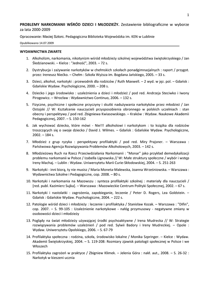 1 PROBLEMY NARKOMANII WŚRÓD DZIECI I MŁODZIEŻY. Zestawienie bibliograficzne w wyborze za lata 2000-2009 Opracowanie: Maciej Sztorc. Pedagogiczna Biblioteka Wojewódzka im. KEN w Lublinie Opublikowano 14.07.2009 WYDAWNICTWA ZWARTE 1. Alkoholizm, narkomania, nikotynizm wśród młodzieży szkolnej województwa świętokrzyskiego / Jan Śledzianowski. – Kielce : "Jedność", 2003. – 72 s. 2. Dystrybucja i zażywanie narkotyków w chełmskich szkołach ponadgimnazjalnych : raport / przygot. przez: Ireneusz Niećko. – Chełm : Szkoła Wyższa im. Bogdana Jańskiego, 2005. – 33 s. 3. Dzieci, alkohol, narkotyki : przewodnik dla rodziców / Ruth Maxwell. – 2 wyd. w jęz. pol. – Gdańsk : Gdańskie Wydaw. Psychologiczne, 2000. – 208 s. 4. Dziecko i jego środowisko : uzależnienia a dzieci i młodzież / pod red. Andrzeja Steciwko i Iwony Pirogowicz. – Wrocław : Wydawnictwo Continuo, 200W. – 132 s. 5. Fizyczne, psychiczne i społeczne przyczyny i skutki nadużywania narkotyków przez młodzież / Jan Ostojski // W: Kształcenie nauczycieli przysposobienia obronnego w polskich uczelniach : stan obecny i perspektywy / pod red. Zbigniewa Kwiasowskiego. – Kraków : Wydaw. Naukowe Akademii Pedagogicznej, 2007. – S. 150-1W2 W. Jak wychować dziecko, które mówi - Nie!!! alkoholowi i narkotykom : to książka dla rodziców troszczących się o swoje dziecko / David J. Wilmes. – Gdańsk : Gdańskie Wydaw. Psychologiczne, 2002. – 184 s. 7. Młodzież z grup ryzyka : perspektywy profilaktyki / pod red. Miry Prajsner. – Warszawa : Państwowa Agencja Rozwiązywania Problemów Alkoholowych, 2003. – 142 s. 8. Młodzieżowy Ruch na Rzecz Przeciwdziałania Narkomanii : "Monar" jako przykład demedykalizacji problemu narkomanii w Polsce / Izabella Lignowska // W: Małe struktury społeczne / wybór i wstęp Ireny Machaj. – Lublin : Wydaw. Uniwersytetu Marii Curie-Skłodowskiej, 2004. – S. 251-2W3 9. Narkotyki - inni biorą, ty nie musisz / Maria Moneta-Malewska, Joanna Wrześniowska. – Warszawa : Wydawnictwa Szkolne i Pedagogiczne, cop. 2008. – 80 s. 10. Narkotyki i narkomania na Mazowszu : synteza profilaktyki szkolnej : materiały dla nauczycieli / [red. publ. Kazimierz Sujka]. – Warszawa : Mazowieckie Centrum Polityki Społecznej, 2002. – W7 s. 11. Narkotyki i nastolatki : zagrożenia, zapobieganie, leczenie / Peter D. Rogers, Lea Goldstein. – Gdańsk : Gdańskie Wydaw. Psychologiczne, 2004. – 222 s. 12. Patologie wśród dzieci i młodzieży : leczenie i profilaktyka / Stanisław Kozak. – Warszawa : "Difin", cop. 2007. – S. 99-105 : Uzależnienie narkotykowe - nałóg przymusowy - negatywne zmiany w osobowości dzieci i młodzieży 13. Poglądy na świat młodzieży używającej środki psychoaktywne / Irena Mudrecka // W: Strategie rozwiązywania problemów uzależnień / pod red. Sylwii Badory i Ireny Mudreckiej. – Opole : Wydaw. Uniwersytetu Opolskiego, 200W. – S. W7-79 14. Profilaktyka społeczna : rodzina, szkoła, środowisko lokalne / Monika Szpringer. – Kielce : Wydaw. Akademii Świętokrzyskiej, 2004. – S. 119-208: Rozmiary zjawisk patologii społecznej w Polsce i we Włoszech 15. Profilaktyka zagrożeń w praktyce / Zbigniew Klimek. – Jelenia Góra : nakł. aut., 2008. – S. 2W-32 : Narkotyk w kieszeni ucznia 2 1W. Rodzice w procesie terapii dziecka uzależnionego od narkotyków / Piotr Sasin // W: Strategie rozwiązywania problemów uzależnień / pod red. Sylwii Badory i Ireny Mudreckiej. – Opole : Wydaw. Uniwersytetu Opolskiego, 200W. – S. 2W3-275 17. Samotność globalnego nastolatka / Janusz Mastalski. – Kraków : Wydaw. Naukowe Papieskiej Akademii Aeologicznej, 2007. – S. 425-4W2 : W poszukiwaniu tożsamości 18. Stosowanie substancji psychoaktywnych przez młodzież szkół śląskich - zasięg, skutki i przeciwdziałanie / Katarzyna Borzucka-Sitkiewicz, Krzysztof Sas-Nowosielski. – Kraków : "Impuls", 2007. – 108 s. 19. Style życia młodzieży a narkotyki : wyniki badań empirycznych / Barbara Fatyga, Jolanta RogalaObłękowska. – Warszawa : Instytut Spraw Publicznych, 2002. – 359 s. 20. Umiejętności chroniące (odmawiania) : zapobieganie narkomanii wśród młodzieży / Arnold P. Goldstein, Kenneth W. Reagles, Lester L. Amann. – Warszawa : Katolicka Fundacja Pomocy Osobom Uzależnionym i Dzieciom "Karan", cop. 2001. – 183 s. 21. Uzależnienia wśród dzieci i młodzieży szkolnej : na przykładzie województwa świętokrzyskiego / Jan Śledzianowski. – Kielce : Wydaw. Akademii Świętokrzyskiej, 2004. – 407 s. 22. Używanie środków odurzających i psychotropowych przez młodzież szkolną : młodzież końca wieku : podręcznik dla gmin / Eugeniusz Moczu. – Rzeszów : [Eugeniusz Moczuk], 2000. – 1W2 s. 23. "Używanie substancji psychoaktywnych przez młodzież" : konferencja : (materiały pokonferencyjne) / [zred. zespół w składzie Aadeusz Cielecki red. nacz. et al.]. – Kielce : Komenda Wojewódzka Policji, 2001. – W8 s. 24. Używanie środków psychoaktywnych przez uczniów w percepcji studentów - kandydatów na nauczycieli : raport z badań / red. nauk. Jan A. Malinowski. – Aoruń : "Akapit", 2005. – 223 s. 25. Wybrane czynniki interweniujące w sekwencję ryzyka używania substancji psychoaktywnych / Piotr Kwiatkowski // W: Diagnostyka i profilaktyka w teorii i praktyce pedagogicznej / pod red. Marii Deptały. – Bydgoszcz : Wydaw. Uniwersytetu Kazimierza Wielkiego, 200W. – S. 158-17W 2W. Zachowania dewiacyjne młodzieży / Bronisław Urban. – Wyd. 4. – Kraków : Wydaw. Uniwersytetu Jagiellońskiego, 2000. – 22W s. 27. Zachowania ryzykowne dzieci i młodzieży / pod red. Niny Ogińskiej-Bulik. – Łódź : Wydaw. Wyższej Szkoły Humanistyczno-Ekonomicznej, 200W. – 143 s. 28. Zagrożenie narkotykowe i narkomanią w szkołach gimnazjalnych i ponadgimnazjalnych powiatu chełmskiego : raport z badań / przygot. przez: Ireneusz Niećko. – Chełm : Szkoła Wyższa im. 