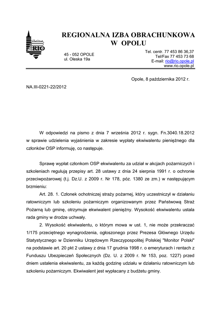 REGIONALNA IZBA OBRACHUNKOWA W OPOLU 45 - 052 OPOLE ul. Oleska 19a Tel. centr. 77 453 86 36,37 Tel/Fax 77 453 73 68 E-mail: [email protected] www.rio.opole.pl Opole, 8 października 2012 r. NA.III-0221-22/2012 W odpowiedzi na pismo z dnia 7 września 2012 r. sygn. Fn.3040.18.2012 w sprawie udzielenia wyjaśnienia w zakresie wypłaty ekwiwalentu pieniężnego dla członków OSP informuję, co następuje. Sprawę wypłat członkom OSP ekwiwalentu za udział w akcjach pożarniczych i szkoleniach regulują przepisy art. 28 ustawy z dnia 24 sierpnia 1991 r. o ochronie przeciwpożarowej (t.j. Dz.U. z 2009 r. Nr 178, póz. 1380 ze zm.) w następującym brzmieniu: Art. 28. 1. Członek ochotniczej straży pożarnej, który uczestniczył w działaniu ratowniczym lub szkoleniu pożarniczym organizowanym przez Państwową Straż Pożarną lub gminę, otrzymuje ekwiwalent pieniężny. Wysokość ekwiwalentu ustala rada gminy w drodze uchwały. 2. Wysokość ekwiwalentu, o którym mowa w ust. 1, nie może przekraczać 1/175 przeciętnego wynagrodzenia, ogłoszonego przez Prezesa Głównego Urzędu Statystycznego w Dzienniku Urzędowym Rzeczypospolitej Polskiej "Monitor Polski" na podstawie art. 20 pkt 2 ustawy z dnia 17 grudnia 1998 r. o emeryturach i rentach z Funduszu Ubezpieczeń Społecznych (Dz. U. z 2009 r. Nr 153, poz. 1227) przed dniem ustalenia ekwiwalentu, za każdą godzinę udziału w działaniu ratowniczym lub szkoleniu pożarniczym. Ekwiwalent jest wypłacany z budżetu gminy. 3. Ekwiwalent, o którym mowa w ust. 1 i 2, nie przysługuje członkowi ochotniczej straży pożarnej za czas nieobecności w pracy, za który zachował wynagrodzenie. Z powyższych regulacji wynika generalna zasada, że do otrzymania ekwiwalentu uprawniony jest każdy członek ochotniczej straży pożarnej, który uczestniczył w działaniu ratowniczym lub szkoleniu pożarniczym organizowanym przez Państwową Straż Pożarną lub gminę zawsze, gdy członek OSP nie pobiera wynagrodzenia. Działaniem ratowniczym, według cyt. ustawy, jest każda czynność podjęta w celu ochrony życia, zdrowia, mienia lub środowiska, a także likwidacja przyczyn powstania pożaru, wystąpienia klęski żywiołowej lub innego miejscowego zagrożenia. Teza ta znajduje potwierdzenie w stanowisku zawartym w wyroku Naczelnego Sądu Administracyjnego z dnia 13 lipca 2006 r. sygn. akt l OSK 614/2006 (publ. ONSAiWSA 2007/2 poz. 52). Jedyny wyjątek od tej zasady ustawodawca zdefiniował w ust. 3 art. 28 cyt. ustawy. W sytuacji, gdy członek OSP biorący udział w działaniu ratowniczym lub szkoleniu, za czas nieobecności w pracy zachował wynagrodzenie - ekwiwalent mu nie przysługuje. Jak zauważył Wojewódzki Sąd Administracyjny w Opolu w wyroku z dnia 3 grudnia 2009 r. sygn. II SA/Op 380/09 - ekwiwalent, o jakim mowa w art. 28 wskazanej ustawy, stanowi równoważnik, odpowiednik wkładu wniesionego przez członka OSP, w postaci czasu, wysiłku i zdrowia, w ochronę przeciwpożarową, czyli w działanie mające na celu ochronę życia, zdrowia, mienia innych osób lub ochronę środowiska przed pożarem, klęską żywiołową lub innymi zagrożeniami (por. w wyroku Sądu Rejonowego w Brzesku z dnia 23 stycznia 2007 r., sygn. akt 98/07, Sądu Okręgowego w Tarnowie z dnia 5 czerwca 2008 r., sygn. akt I Ca 141/08). Tym samym, nie stanowi odpowiednika wynagrodzenia i nie może być traktowany jako rekompensata za utracone zarobki. Tak więc wszystkim członkom OSP (pracownik, emeryt, rolnik bezrobotny), którzy brali udział w działaniu ratowniczym - poza tymi, którzy za czas akcji zachowali prawo do wynagrodzenia - przysługuje ekwiwalent w wysokości określonej w uchwale, bez względu na ich status. Każdy członek ochotniczej straży pożarnej biorący udział w działaniach ratowniczych lub szkoleniu pożarniczym powinien otrzymać ekwiwalent za czas i trud związany z działaniami ratowniczymi. Z gramatycznej wykładni art. 28 ust. 1 ustawy o ochronie przeciwpożarowej określającego, iż "członek ochotniczej straży pożarnej, który uczestniczył w działaniu ratowniczym lub szkoleniu pożarniczym organizowanym przez Państwową Straż Pożarną lub gminę, otrzymuje ekwiwalent pieniężny" wnioskować można, iż ta norma prawna ma zastosowanie do każdego podmiotu spełniającego opisane w niej warunki. Żadnych innych kryteriów, pozwalających na dookreślenie kręgu uprawnionych, ustawodawca nie przewidział. W przepisie art. 28 ust. 3 cyt. ustawy wskazał zaś sytuacje, w których uprawniony do otrzymania ekwiwalentu podmiot traci to prawo. Zatem wspólną cechą podmiotów, jest przynależność do Ochotniczej Straży Pożarnej. (…) Z punktu widzenia wykonywanych zadań fakt, czy dany członek OSP pozostaje w stosunku pracy jest nieistotny, ponieważ każdy wnosi taki sam wkład w postaci czasu, wysiłku i zdrowia w ochronę przeciwpożarową. Podsumowując, każdy członek ochotniczej straży pożarnej (pracownik, uczeń, student, emeryt, rolnik, bezrobotny) biorący udział w działaniach ratowniczych lub szkoleniu pożarniczym - poza tymi, którzy za czas akcji zachowali prawo do wynagrodzenia - przysługuje ekwiwalent w wysokości określonej w uchwale rady gminy. Odnosząc się do opracowanego wzoru oświadczenia, które należy złożyć w Urzędzie Gminy w związku z wypłatą ekwiwalentu pieniężnego za udział w akcji ratowniczej/szkoleniu, informuję, iż określenie sposobu wykonywania uchwały należy stosownie do art. 30 ust. 2 pkt 2 ustawy z dnia 8 marca 1990 r. o samorządzie gminnym do zadań wójta gminy i wykracza poza zakres dotyczący stosowania przepisów o finansach publicznych.