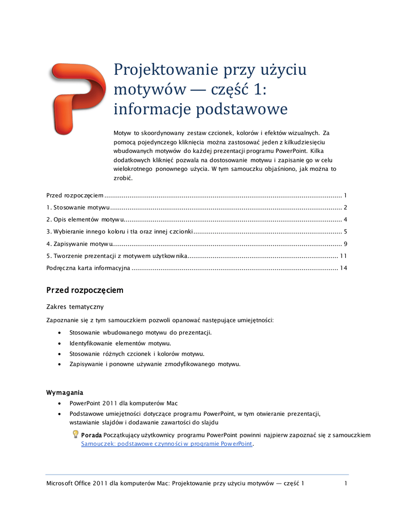 Projektowanie przy uzyciu motywow — częśc 1: informacje podśtawowe Motyw to skoordynowany zestaw czcionek, kolorów i efektów wizualnych. Za pomocą pojedynczego kliknięcia można zastosować jeden z kilkudziesięciu wbudowanych motywów do każdej prezentacji programu PowerPoint. Kilka dodatkowych kliknięć pozwala na dostosowanie motywu i zapisanie go w celu wielokrotnego ponownego użycia. W tym samouczku objaśniono, jak można to zrobić. Przed rozpoczęciem ........................................................................................................................... 1 1. Stosowanie motywu ........................................................................................................................ 2 2. Opis elementów motyw u................................................................................................................. 4 3. Wybieranie innego koloru i tła oraz innej czcionki ............................................................................. 5 4. Zapisywanie motyw u....................................................................................................................... 9 5. Tworzenie prezentacji z motywem użytkow nika .............................................................................. 11 Podręczna karta informacyjna ........................................................................................................... 14 Przed rozpoczęciem Zakres tematyczny Zapoznanie się z tym samouczkiem pozwoli opanować następujące umiejętności: Stosowanie wbudowanego motywu do prezentacji. Identyfikowanie elementów motywu. Stosowanie różnych czcionek i kolorów motywu. Zapisywanie i ponowne używanie zmodyfikowanego motywu. Wymagania PowerPoint 2011 dla komputerów Mac Podstawowe umiejętności dotyczące programu PowerPoint, w tym otwieranie prezentacji, wstawianie slajdów i dodawanie zawartości do slajdu P orada Początkujący użytkownicy programu PowerPoint powinni najpierw zapoznać się z samouczkiem Samouczek: podstawowe czynności w programie Pow erPoint. Microsoft Office 2011 dla komputerów Mac: Projektowanie przy użyciu motywów — część 1 1 Plik ć wiczeń Lekcje w samouczku zostały opracowane z myślą o ich przeglądaniu w określonej kolejności. Pobranie tego pliku ćwiczeń i korzystanie z niego w trakcie studiowania samouczka umożliwi zdobycie praktycznego doświadczenia. Themes1.pptx (112 KB) Szac owany c zas ukończenia: 20 minut 1. Stosowanie motywu Pakiet Office zawiera kilkadziesiąt profesjonalnie zaprojektowanych motywów. Zastosowanie motywu powoduje ustawienie czcionek, kolorów i efektów zdefiniowanych w motywie we wszystkich elementach tekstowych i obiektach. Uwa ga Motywy w programie PowerPoint zastępują wcześniejsze „szablony projektu”. Motywy przydają się najbardziej wówczas, gdy jest potrzebny spójny projekt prezentacji, ale nie jest konieczne uwzględnianie zawartości slajdów, takiej jak tekst zastępczy czy symbole zastępcze obrazów. Zastosujmy motyw do prezentacji. Otwórz plik ćwiczeń znajdujący się na początku tego samouczka. W lewym okienku kliknij każdy slajd i zwróć uwagę na wygląd tekstu oraz obiektów. P orada Jeśli nie widać lewego okienka, kliknij kolejno pozycje Wid ok > Normalny. Microsoft Office 2011 dla komputerów Mac: Projektowanie przy użyciu motywów — część 1 2 Na karcie Motywy w obszarze Motywy kliknij pozycję Cza rny krawat. P orada Aby wyświetlić wszystkie motywy, należy wskazać motyw i kliknąć pozycję . Zwróć uwagę, że zastosowanie motywu powoduje rozmieszczenie i sformatowanie tekstu oraz obiektów na wszystkich slajdach. P orada W dowolnym momencie pracy nad prezentacją można zastosować inny motyw. Ws k azówki Aby zastosować motyw do określonych slajdów, należy przytrzymać naciśnięty klawisz i w lewym okienku klikać slajdy, do których ma zostać zastosowany motyw. Następnie należy kliknąć wybrany motyw. Przed wykonaniem k olejnych c zynności Upewnij się, że umiesz wykonywać następujące czynności: Stosowanie motywu do prezentacji. Microsoft Office 2011 dla komputerów Mac: Projektowanie przy użyciu motywów — część 1 3 2. Opis elementów motywu Motyw służy do definiowania ogólnego wizualnego projektu dokumentu. Każdy motyw zawiera skoordynowany zestaw czcionek, kolorów, teł i efektów wizualnych, które nadają dokumentowi spójny wygląd. Przyjrzyjmy się, jak elementy motywu wyglądają na slajdzie numer 4 . C zcionka nagłówka motywu: Czcionka i kolor tekstu nagłówka. Na przykład w motywie Czarny krawat tekst nagłówka jest formatowany szarą czcionką Garamond o rozmiarze 18 punktów. Zarówno czcionkę, jak i kolor czcionki nagłówka motywu można zmienić. C zcionka tekstu podstawowego motywu: Czcionka i kolor tekstu podstawowego. Na przykład w motywie Czarny krawat tekst podstawowy jest formatowany białą czcionką Garamond o rozmiarze 20 punktów. Zarówno czcionkę, jak i kolor czcionki tekstu podstawowego motywu można zmienić. Ko lory motywu: Skoordynowany zestaw kolorów tekstu, teł, hiperłączy i efektów cieniowania wyróżniającego. Dla każdego motywu można definiować kolory niestandardowe. Efekty obrazu motywu: zestaw efektów, takich jak cienie i ramki, dla wszystkich obrazów i obiektów slajdu. Pr ojekt tła: kolor oraz elementy graficzne tła slajdu. Ws k azówki Wszystkie dokumenty pakietu Office mają motyw. Jeśli nie zastosowano żadnego motywu, motywem domyślnym jest motyw pakietu Office. W programie PowerPoint każdy motyw zawiera projekt tła slajdu. W innych aplikacjach pakietu Office motywy nie zawierają projektu tła. Microsoft Office 2011 dla komputerów Mac: Projektowanie przy użyciu motywów — część 1 4 Przed wykonaniem k olejnych c zynności Upewnij się, że umiesz wykonywać następujące czynności: Identyfikowanie podstawowych elementów projektu zastosowanego motywu. 3. Wybieranie innego 