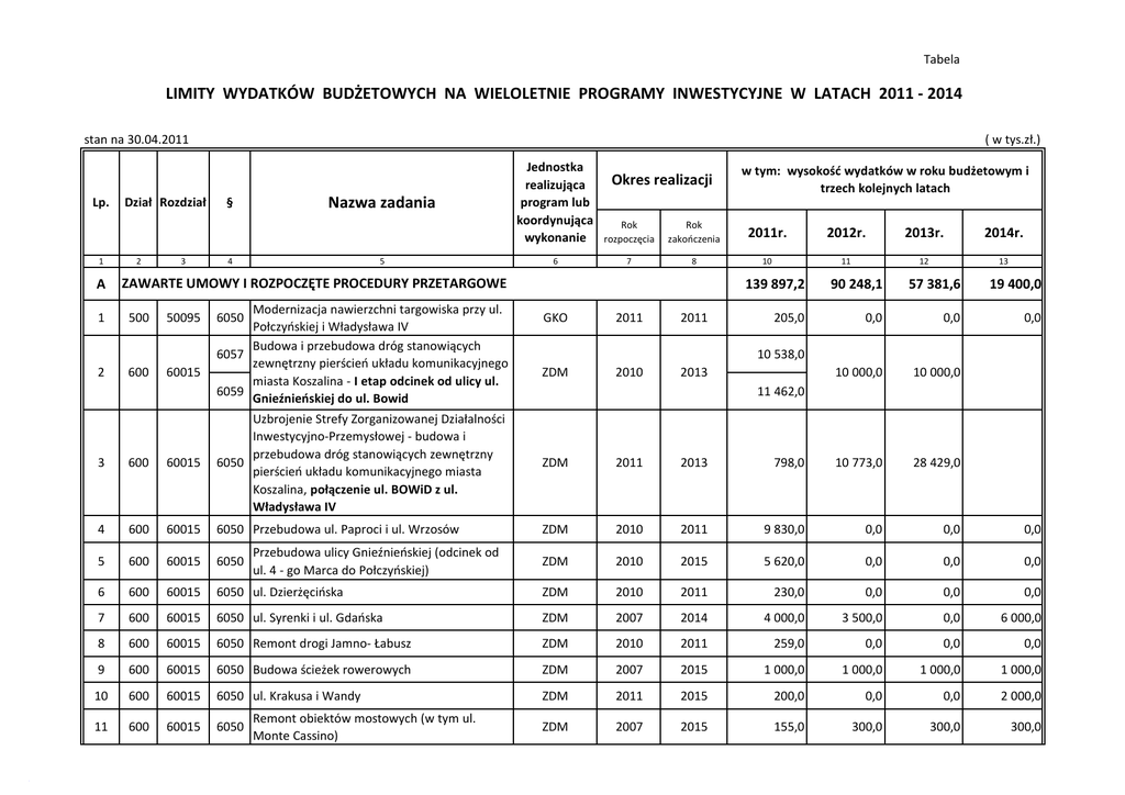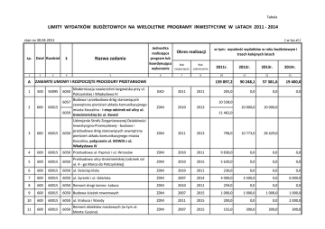 Tabela LIMITY WYDATKÓW BUDŻETOWYCH NA WIELOLETNIE PROGRAMY INWESTYCYJNE W LATACH 2011 - 2014 stan na 30.04.2011 Lp. 1 A Dział Rozdział 2 3 ( w tys.zł.) § Nazwa zadania 4 5 Jednostka realizująca program lub koordynująca wykonanie Rok rozpoczęcia Rok zakończenia 2011r. 2012r. 2013r. 2014r. 6 7 8 10 11 12 13 Okres realizacji ZAWARTE UMOWY I ROZPOCZĘTE PROCEDURY PRZETARGOWE 1 500 50095 2 600 60015 Modernizacja nawierzchni targowiska przy ul. Połczyńskiej i Władysława IV Budowa i przebudowa dróg stanowiących 6057 zewnętrzny pierścień układu komunikacyjnego miasta Koszalina - I etap odcinek od ulicy ul. 6059 Gnieźnieńskiej do ul. Bowid Uzbrojenie Strefy Zorganizowanej Działalności Inwestycyjno-Przemysłowej - budowa i przebudowa dróg stanowiących zewnętrzny 6050 pierścień układu komunikacyjnego miasta Koszalina, połączenie ul. BOWiD z ul. Władysława IV 6050 GKO 2011 2011 ZDM 2010 2013 w tym: wysokość wydatków w roku budżetowym i trzech kolejnych latach 139 897,2 90 248,1 57 381,6 19 400,0 205,0 0,0 0,0 0,0 10 000,0 10 000,0 10 538,0 11 462,0 ZDM 2011 2013 798,0 10 773,0 28 429,0 ZDM 2010 2011 9 830,0 0,0 0,0 0,0 ZDM 2010 2015 5 620,0 0,0 0,0 0,0 6050 ul. Dzierżęcińska ZDM 2010 2011 230,0 0,0 0,0 0,0 60015 6050 ul. Syrenki i ul. Gdańska ZDM 2007 2014 4 000,0 3 500,0 0,0 6 000,0 600 60015 6050 Remont drogi Jamno- Łabusz ZDM 2010 2011 259,0 0,0 0,0 0,0 9 600 60015 6050 Budowa ścieżek rowerowych ZDM 2007 2015 1 000,0 1 000,0 1 000,0 1 000,0 10 600 60015 6050 ul. Krakusa i Wandy ZDM 2011 2015 200,0 0,0 0,0 2 000,0 11 600 60015 6050 ZDM 2007 2015 155,0 300,0 300,0 300,0 3 600 60015 4 600 60015 6050 Przebudowa ul. Paproci i ul. Wrzosów 5 600 60015 6050 6 600 60015 7 600 8 Przebudowa ulicy Gnieźnieńskiej (odcinek od ul. 4 - go Marca do Połczyńskiej) Remont obiektów mostowych (w tym ul. Monte Cassino) Lp. Dział Rozdział Nazwa zadania § 4 5 Jednostka realizująca program lub koordynująca wykonanie Rok rozpoczęcia Rok zakończenia 2011r. 2012r. 2013r. 2014r. 6 7 8 10 11 12 13 7 000,0 2 000,0 0,0 Okres realizacji w tym: wysokość wydatków w roku budżetowym i trzech kolejnych latach 1 2 3 12 600 60015 6050 Ewidencja dróg - powiat ZDM ciągłe 51,0 13 600 60015 6050 Dokumentacje przyszłościowe - powiat ZDM ciągłe 50,0 14 600 60015 6050 15 600 60016 6050 Dokumentacje przyszłościowe - gmina ZDM ciągłe 33,4 16 600 60016 6050 Ewidencja dróg - gmina ZDM ciągłe 20,0 50,0 50,0 50,0 17 600 60016 6050 18 600 60016 6050 Osiedle Unii Europejskiej - drogi 19 600 60016 6050 20 600 60016 21 600 60016 22 600 60016 23 600 60016 63 600 24 Przebudowa skrzyżowań w ciągu ul. J. Stawisińskiego i Rotmistrza W. Pileckiego ul. Lutyków, ul. Obotrytów, ul. P. Skargi, ul. Łużycka, ul. Poprzeczna ZDM 2010 2013 200,0 ZDM 2006 2011 840,0 0,0 0,0 0,0 INW 1998 2011 2 763,0 0,0 0,0 0,0 ZDM 2006 2013 460,0 500,0 500,0 INW 2010 2015 1 869,6 0,0 0,0 0,0 ZDM 2010 2012 4 050,0 2 600,0 0,0 0,0 INW 2010 2011 110,0 0,0 0,0 0,0 6050 Osiedle Bukowe - drogi INW 2010 2014 100,0 1 800,0 1 200,0 600,0 60016 6050 ul. Kosynierów INW 2011 2011 50,0 0,0 0,0 0,0 600 60016 6050 ul. Rzeczna INW 2011 2013 87,4 500,0 400,0 0,0 25 600 60017 6050 ul. Radogoszczańska, ul. Ratajczaka ZDM 2010 2014 20,0 0,0 0,0 400,0 26 600 60017 6050 ul. Niepodległości (parking przy Szpitalu) ZDM 2009 2011 100,0 0,0 0,0 0,0 27 600 60053 "Inteligentny Koszalin" - rozbudowa 6050 infrastruktury społeczeństwa informatycznego e - Koszalin - system monitoringu wizyjnego Inf 2010 2013 500,0 500,0 500,0 0,0 5 463,6 568,6 0,0 ul. Reymonta, ul. Staffa, ul. Struga, ul. Tetmajera, ul. Żeromskiego Modernizacja rejonu ulic Tytusa 6050 Chałubińskiego-Leśna - Promykowa Ulica Karola Szymanowskiego,Jana Matejki, 6050 Stanisława Moniuszki Osiedle Podgórne - Batalionów Chłopskich 6050 drogi 6050 28 600 60053 "Inteligentny Koszalin" - rozbudowa 6057 infrastruktury społeczeństwa informatycznego e - Koszalin- budowa sieci teleinformatycznej 6059 2 159,4 Inf 2007 2013 5 567,0 1 857,2 Lp. 1 Dział Rozdział 2 3 Nazwa zadania § 4 5 Jednostka realizująca program lub koordynująca wykonanie Rok rozpoczęcia Rok zakończenia 2011r. 2012r. 2013r. 2014r. 6 7 8 10 11 12 13 Inf 2011 2011 Okres realizacji Budowa rurociągów kablowych w 6050 remontowanych pasach drogowych Remonty dachów i elewacji budynków 6210 komunalnych oraz termomodernizacja budynku przy Al. Monte Cassino 2 - ZBM Budownictwo mieszkaniowe - ul.Gnieźnieńska 6050 Modrzejewskiej GKO INW 2010 2012 INW 2000 RWZ 64 600 60053 29 700 70001 30 700 70095 31 710 71035 6050 Rozbudowa Cmentarza Komunalnego 32 750 75020 6300 61 750 75095 Dofinansowanie rozbudowy Powiatowego Urzędu Pracy w Koszalinie Przeciwdziałanie wykluczeniu cyfrowemu 6059 mieszkańców Koszalina - budowa eduKiosków w w tym: wysokość wydatków w roku budżetowym i trzech kolejnych latach 0 0 0,0 3 541,0 196,6 0,0 0,0 2014 100,0 1 000,0 1 000,0 1 000,0 2010 2011 1 000,0 0,0 0,0 0,0 RWZ 2010 2011 218,6 0,0 0,0 0,0 2011 2011 300,0 42,3 150,0 150,0 150,0 0,0 0,0 0,0 ciągłe 250,0 500,0 szkołach 33 754 75411 6050 Komenda Miejska PSPoż (zlecone) BZK 34 758 75818 6800 Rezerwa na inwestycje zakończone INW 65 801 80101 6050 Modernizacja szkół E 2 011 2 011 615,2 62 801 80104 6050 Modernizacja przedszkoli E 2011 2011 454,5 66 801 80110 6050 Modernizacja szkół E 2011 2011 96,1 0,0 0,0 0,0 E 2011 2011 50,0 0,0 0,0 0,0 INW 2007 2011 3 800,0 0,0 0,0 0,0 Modernizacja szkół -pomoc finansowa dla 6300 Gminy Sianów na dofinansowanie odbudowy spalonego w 2010 roku gimnazjum Sala sportowa przy Gimnazjum Nr 6, ul. 6050 Stanisława Dąbka ciągłe 67 801 80110 35 801 80110 68 801 80120 6050 Modernizacja szkół E 2011 2011 88,0 0,0 0,0 0,0 69 801 80130 6050 Modernizacja szkół E 2011 2011 23,9 0,0 0,0 0,0 70 801 80140 6050 Modernizacja szkół E 2011 2011 23,8 0,0 0,0 0,0 36 851 85154 6050 Wyposażenie placów zabaw i boisk PU 2011 2011 300,0 37 853 85305 6050 INW 2010 2014 37,5 2 000,0 900,0 1 0